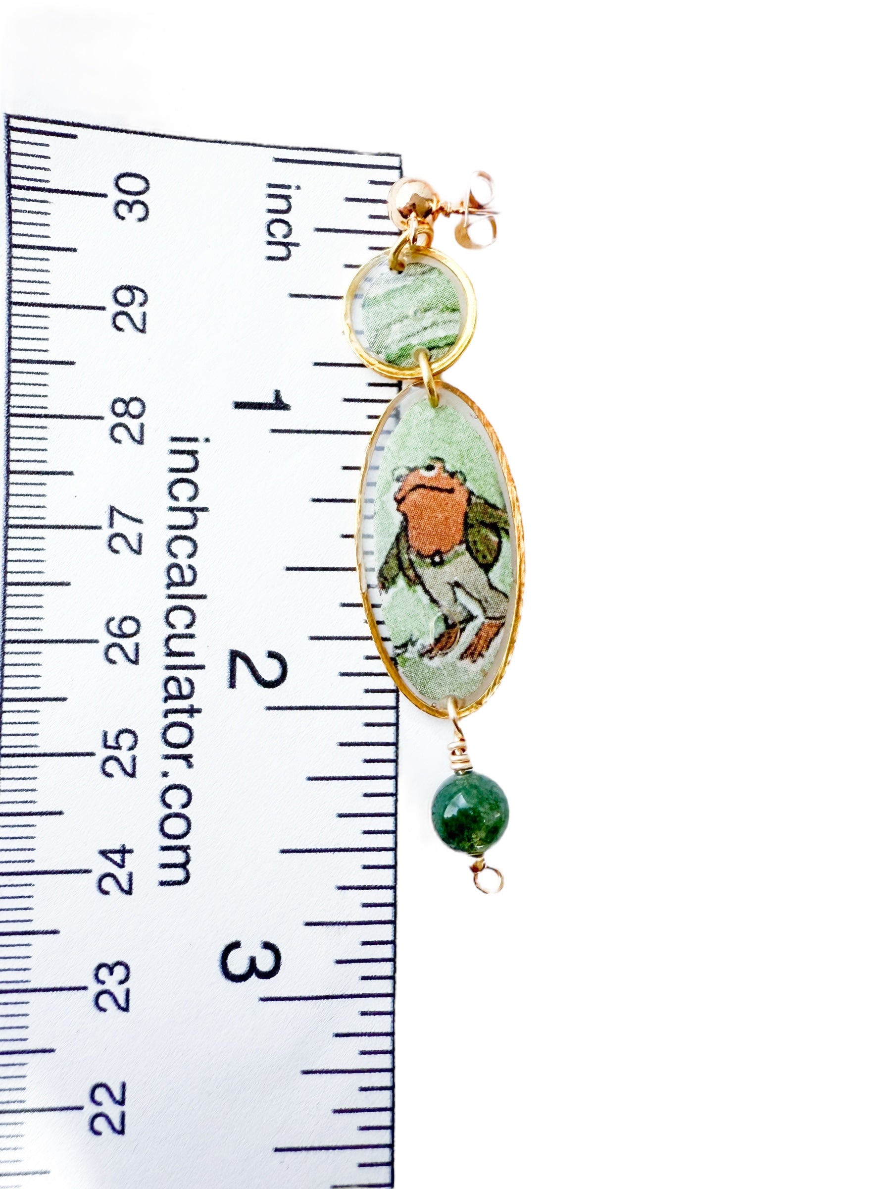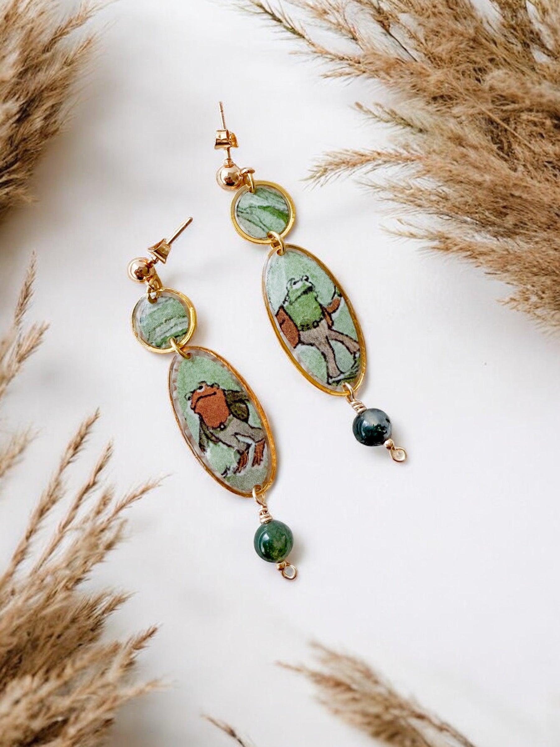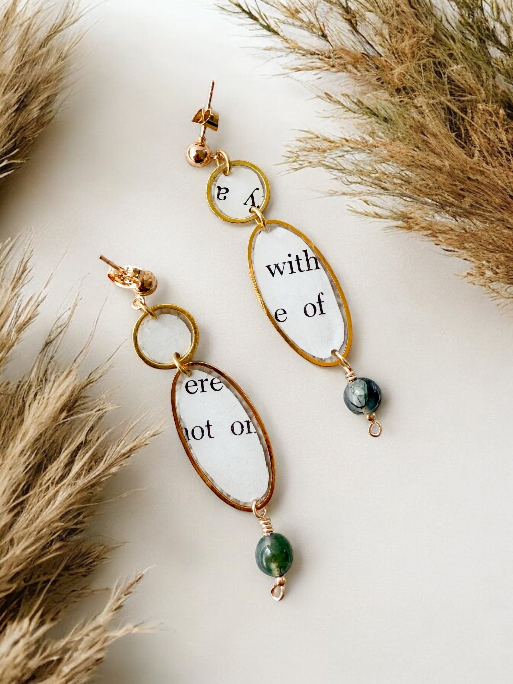 The Found Fable collection is handmade from thrifted books, upcycled into wearable art. The images are cast in crystal clear resin, and feature a variety of brass and other metal components. Each piece is unique and one of a kind!
