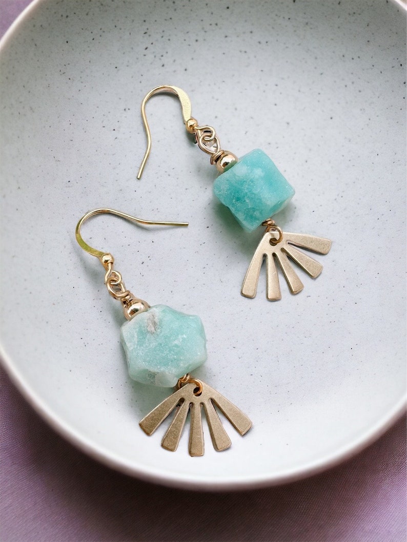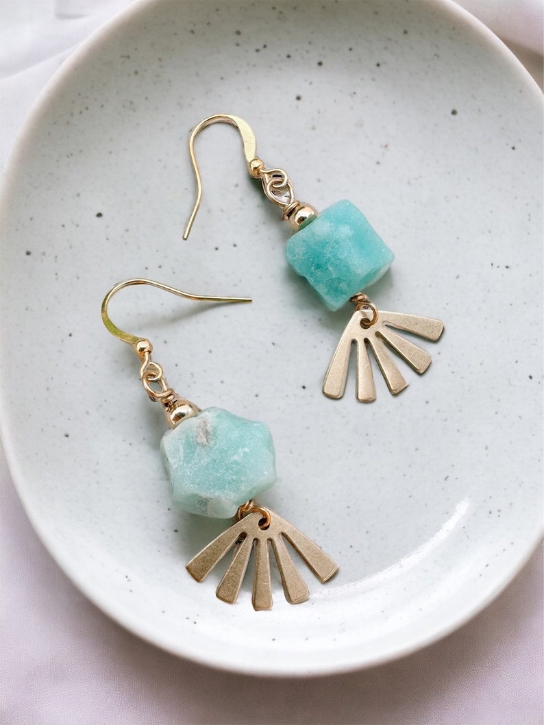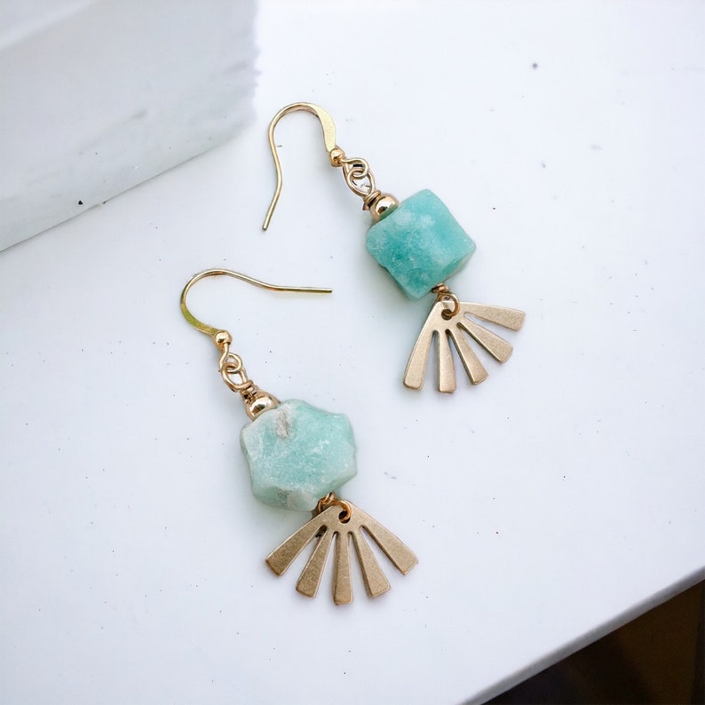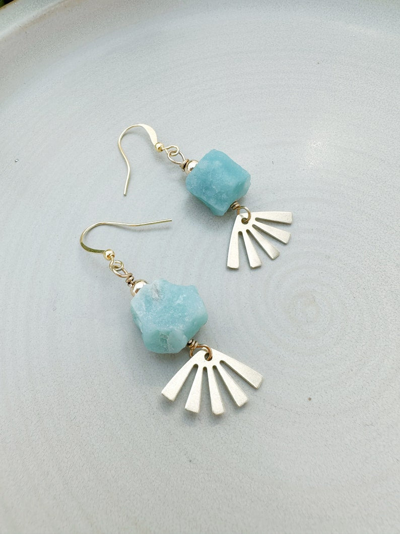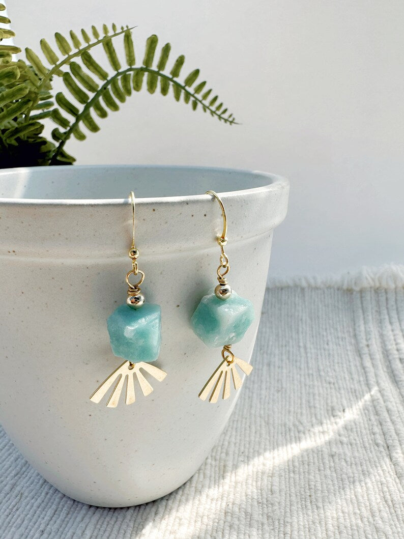 The Arinna earrings feature a natural rough cut amazonite gemstone wire wrapped to a brass sun charm. They measure approximately 1.5 inches in total length, and dangle from gold plated ear wires. 14K Gold Fill ear wires available here for an additional charge.