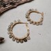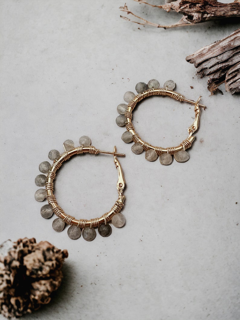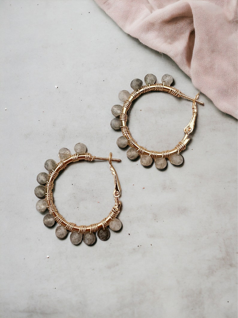 The Aska earrings feature genuine labradorite faceted beads, wire wrapped to gold plated hoops with a spring back closure.
