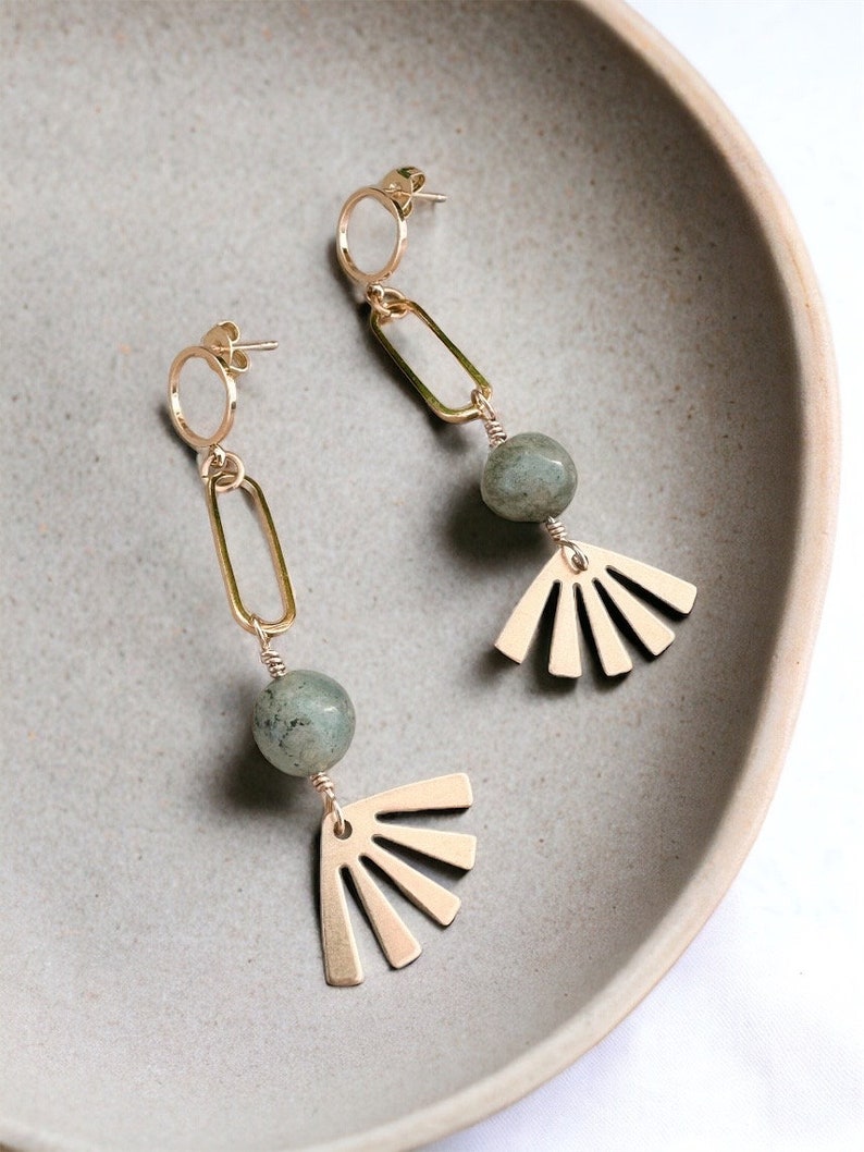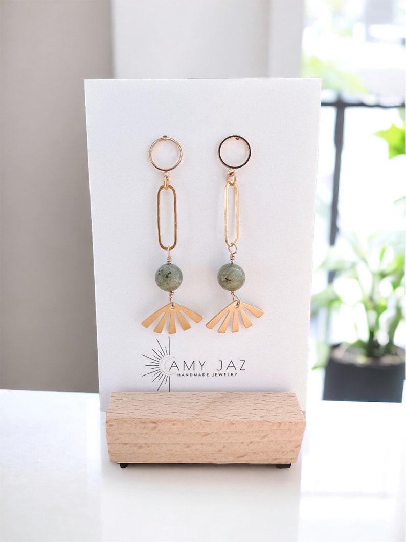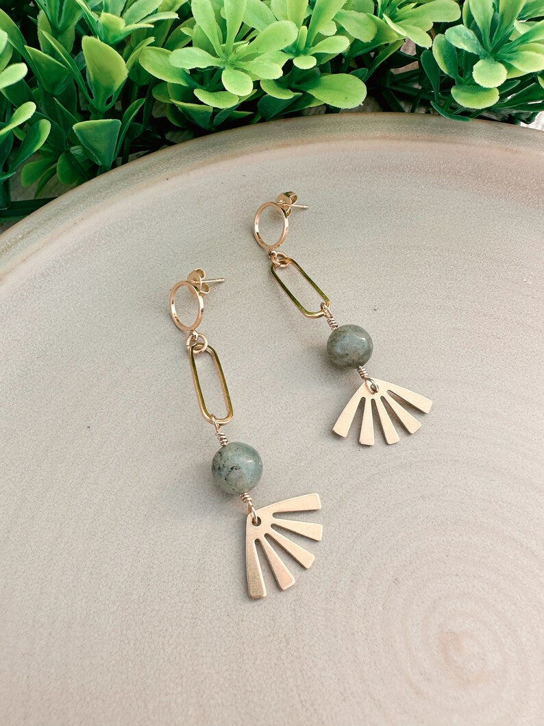 These dainty and lightweight drop earrings are made with genuine labradorite gemstone, paired with brass. They measure approximately 2.5 inches in total length.