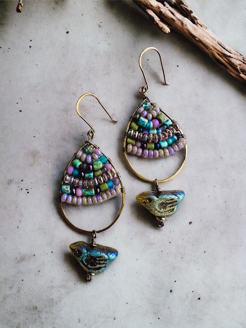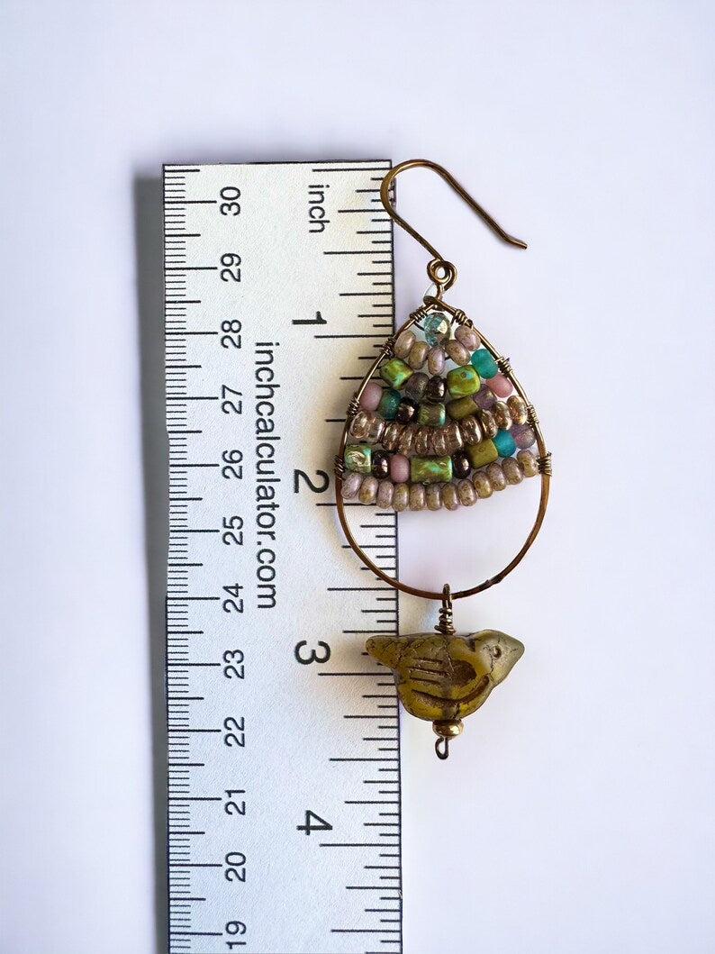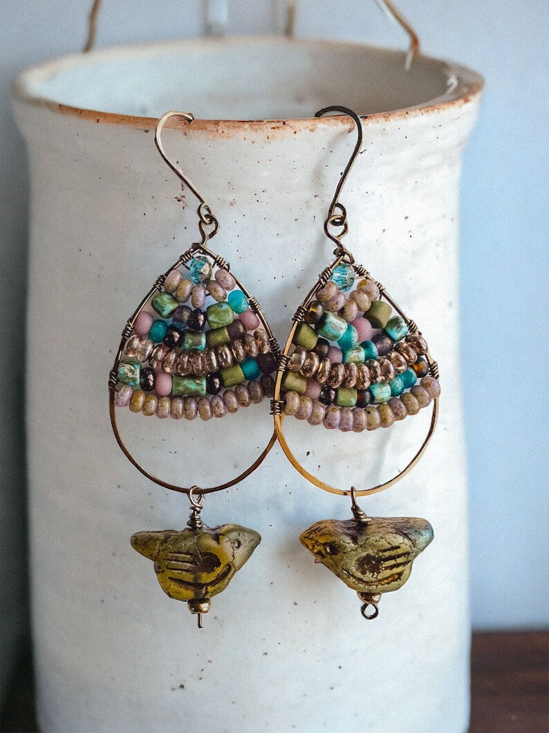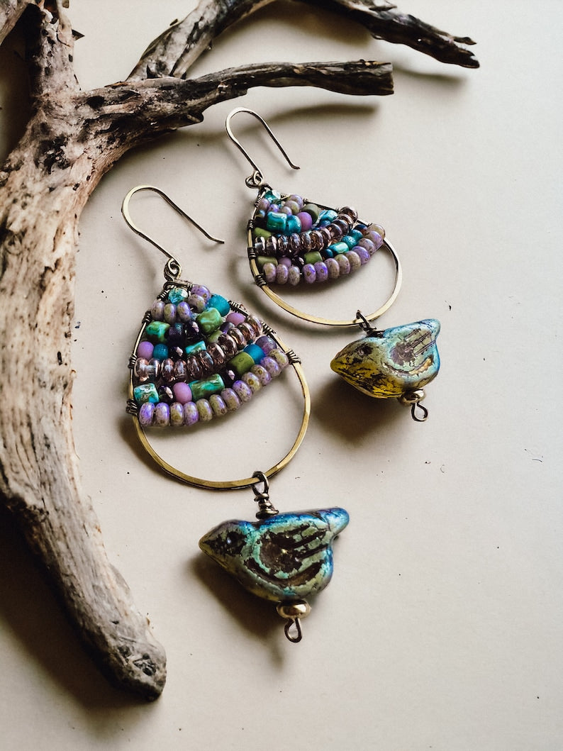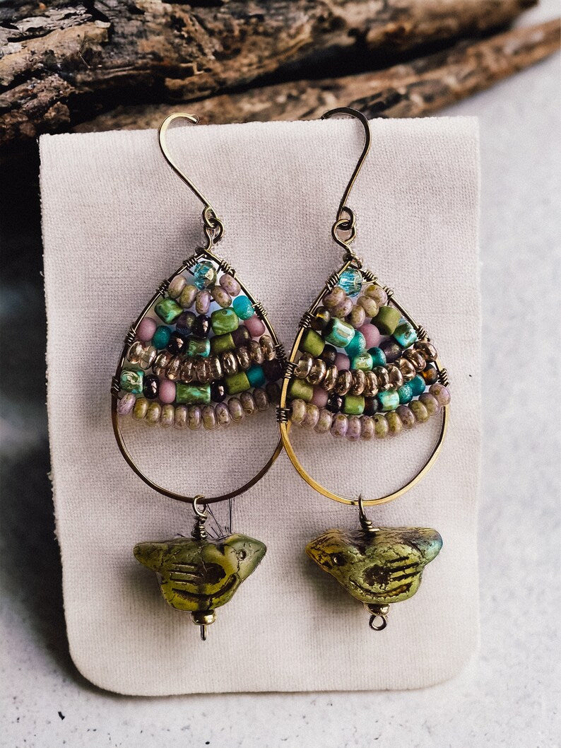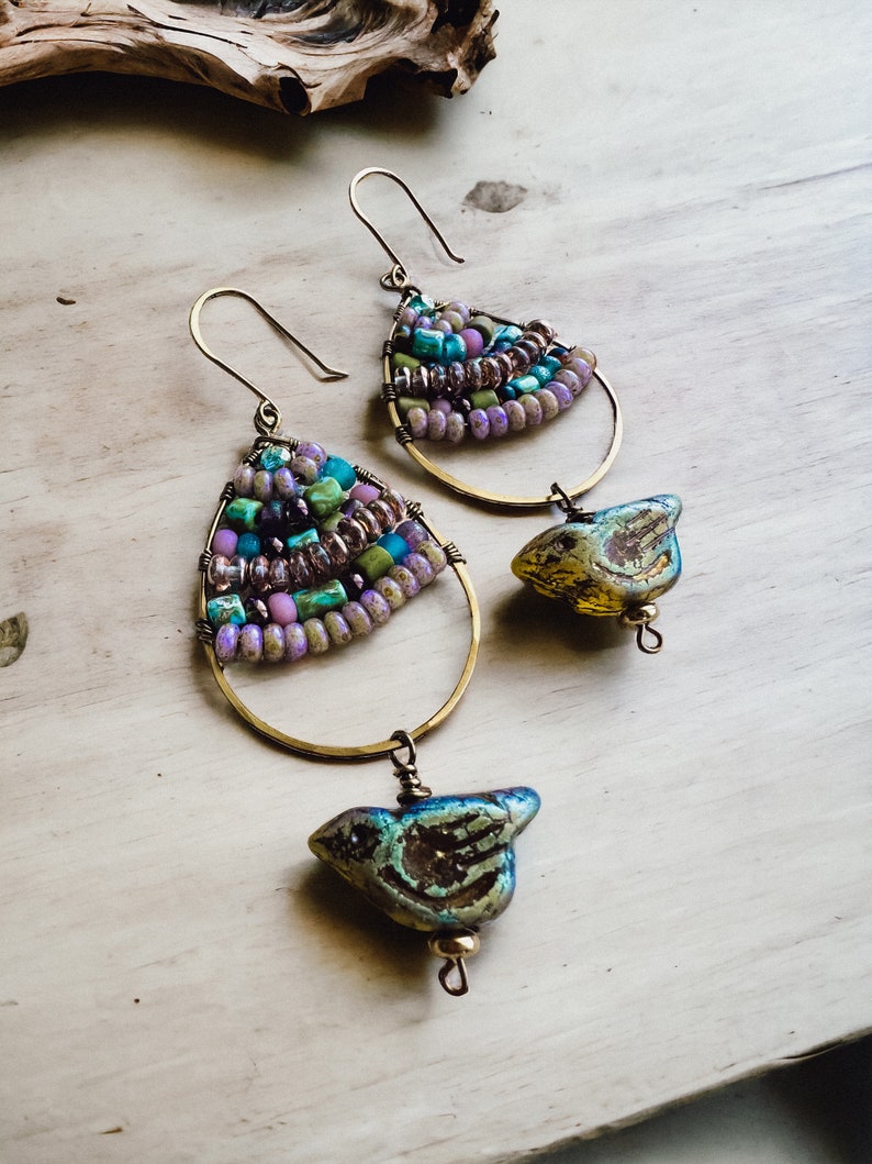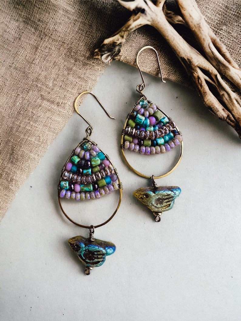 Birds of a feather flock together, and these two cute birdies are no exception. Handforged teardrops are accented by an assortment of beautiful Czech glass and seed beads in shades of purple, turquoise and green. They dangle from hand forged ear wires in antique brass.