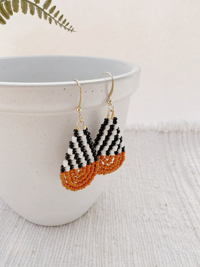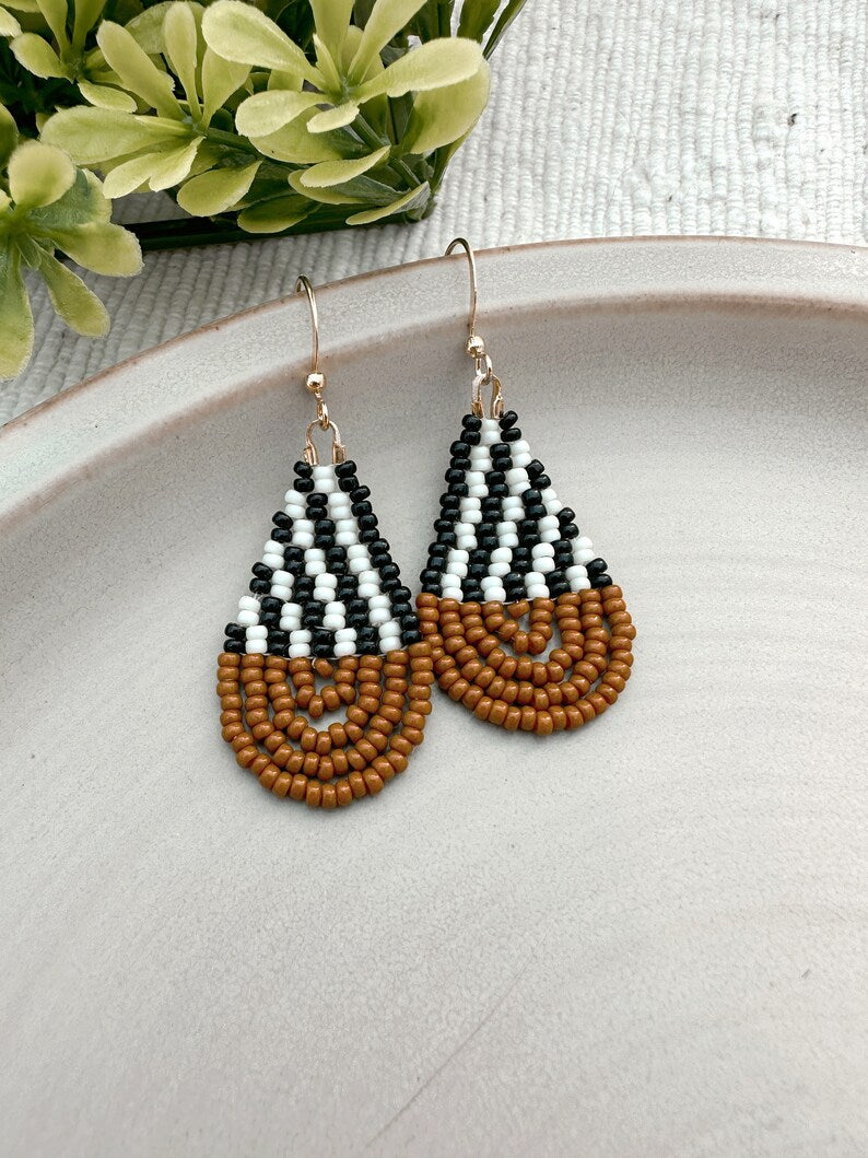 The perfect simple beaded drop earring for every day wear, in a geometric colorblock design. Handmade with Miyuki glass seed beads, woven into a small teardrop shape. This color way features black, white and sepia beads. These earrings measure approximately 1.5 inches long and 0.75 inch wide. Available on gold plated ear hooks, or upgrade to 14k gold filled ear hooks here.