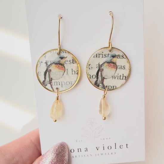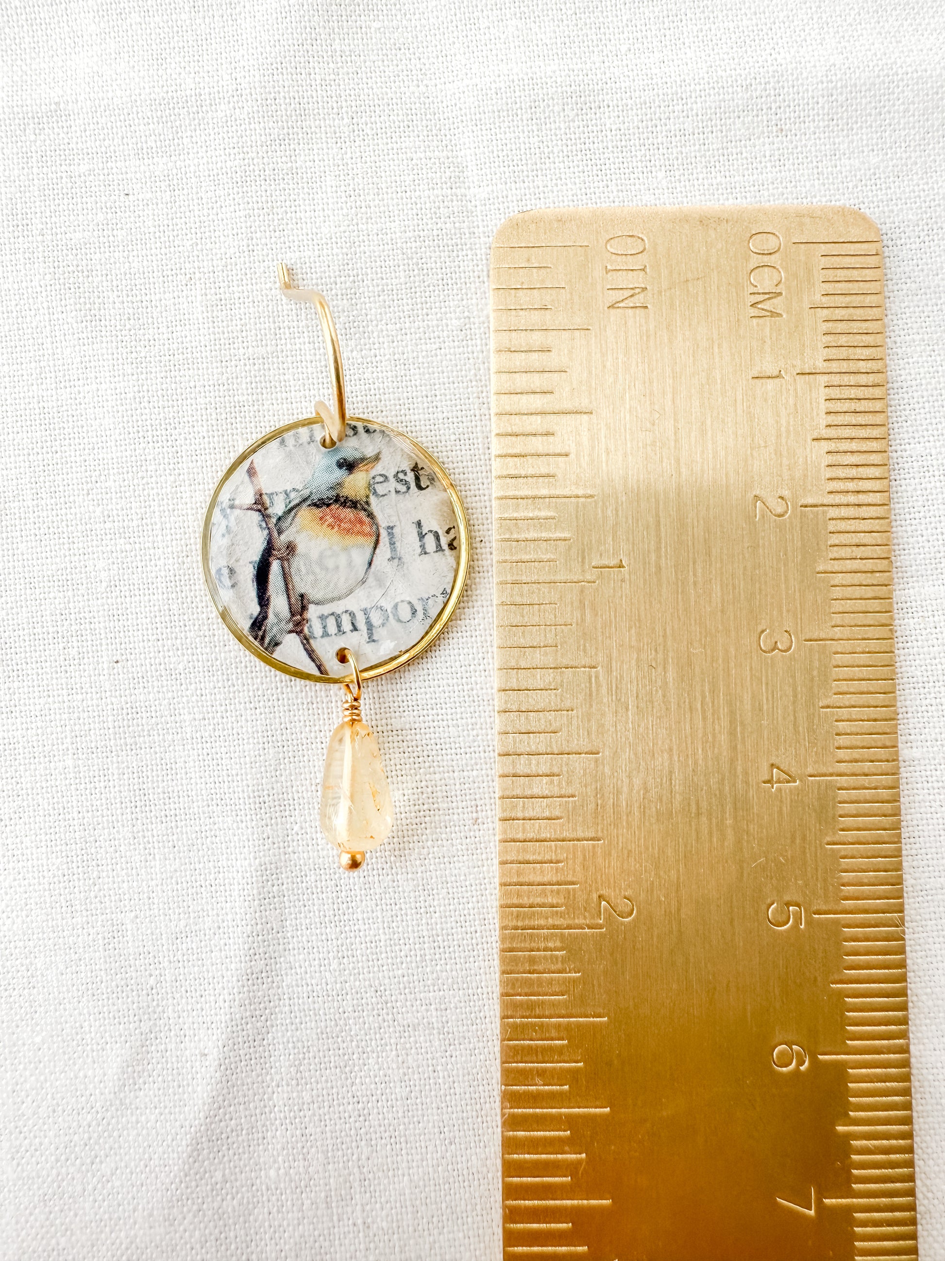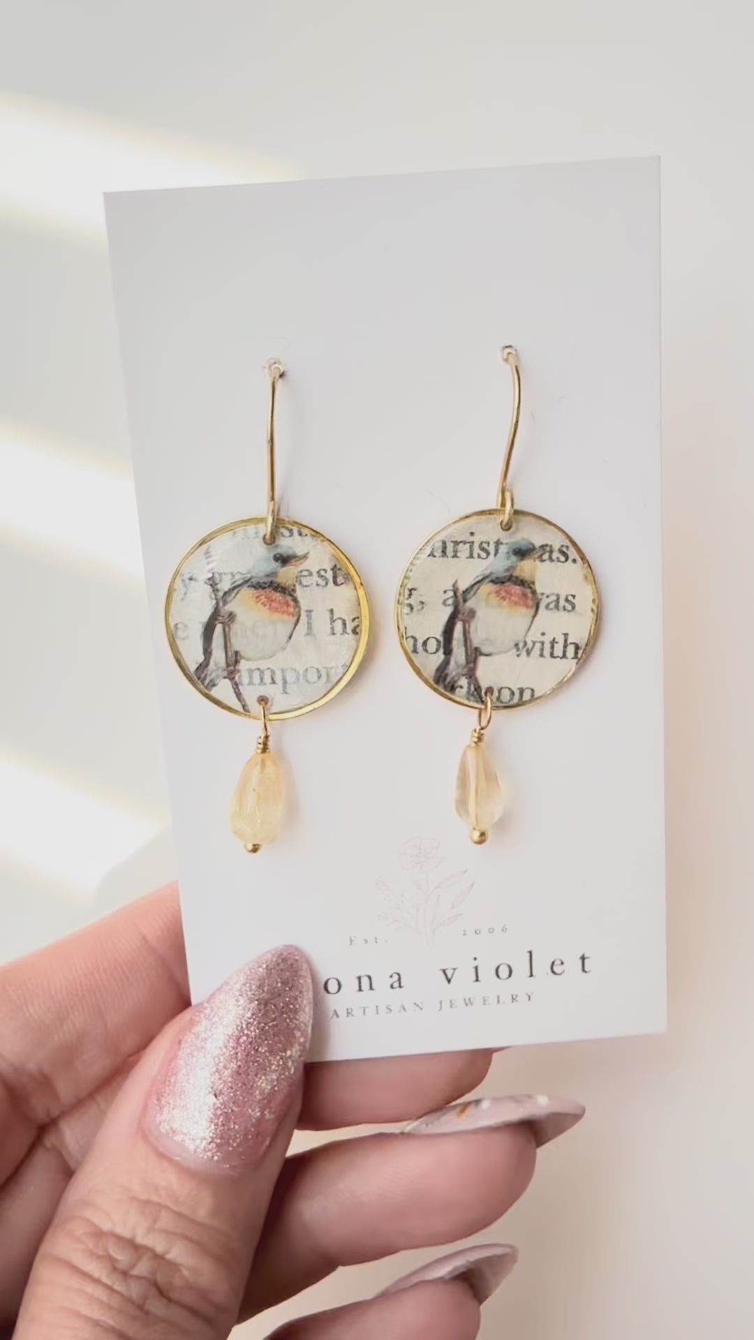 The Elowen Earrings are a quiet celebration of stories, nature, and thoughtful craftsmanship. Each pair is handmade using delicately upcycled book pages, sealed in clear resin to preserve their softly aged text and imagery—giving every set a one-of-a-kind character.
