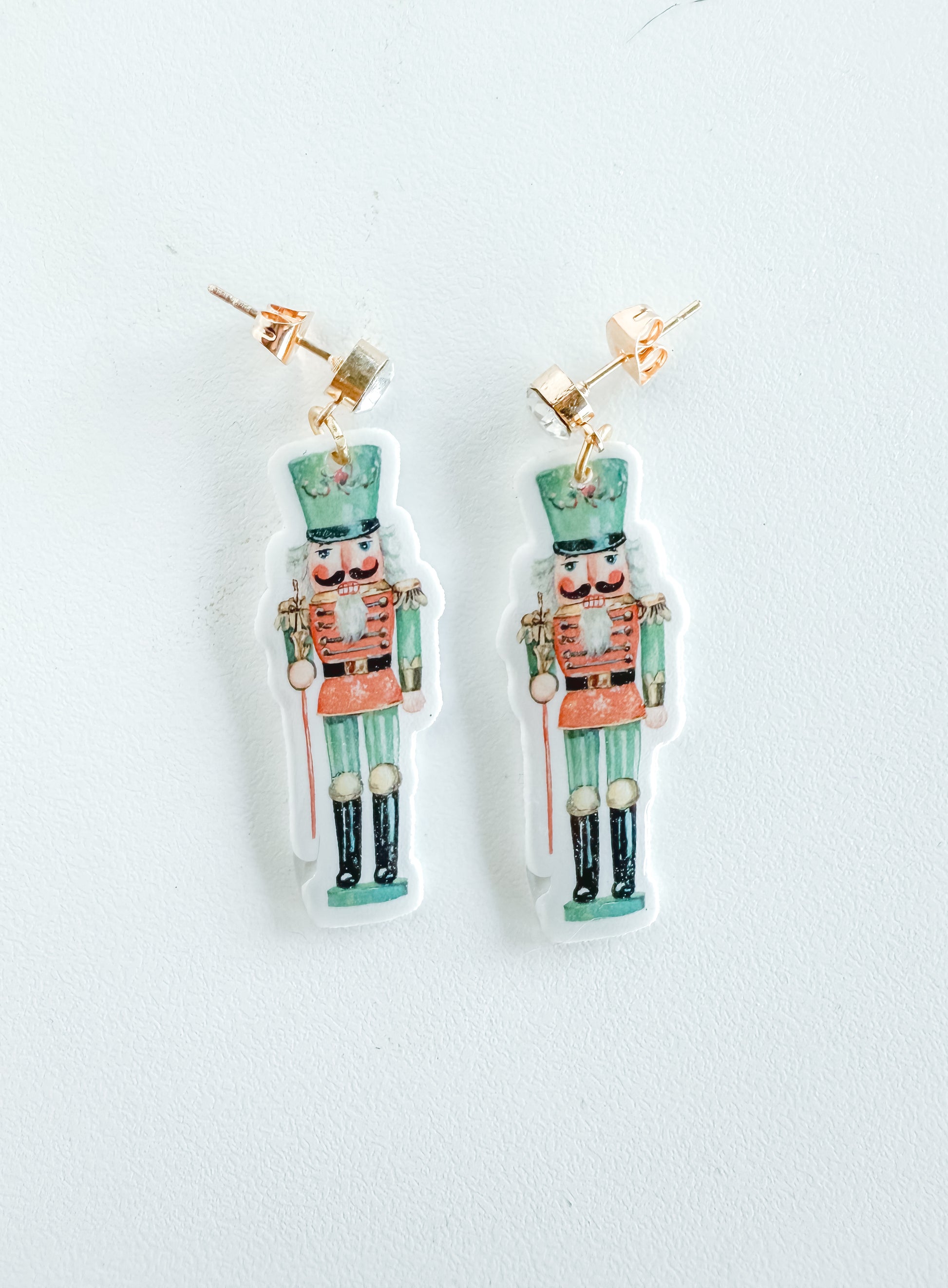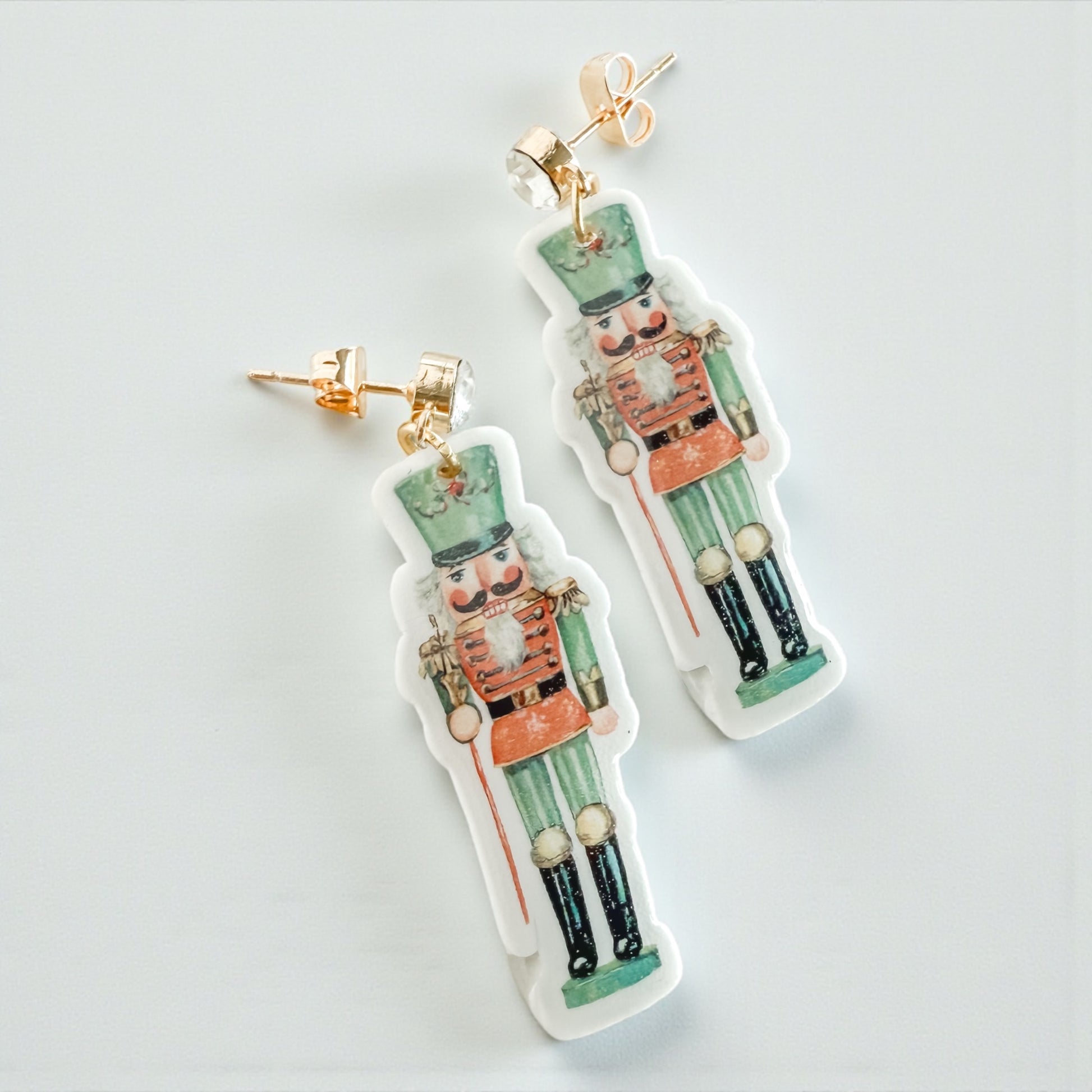 The Evergreen Nutcracker Earrings feature a vintage-inspired nutcracker illustration brought to life in lightweight shrink plastic and sealed with glossy resin for durability and shine. Each nutcracker is paired with a sparkling crystal stud post, adding just the right touch of festive elegance.