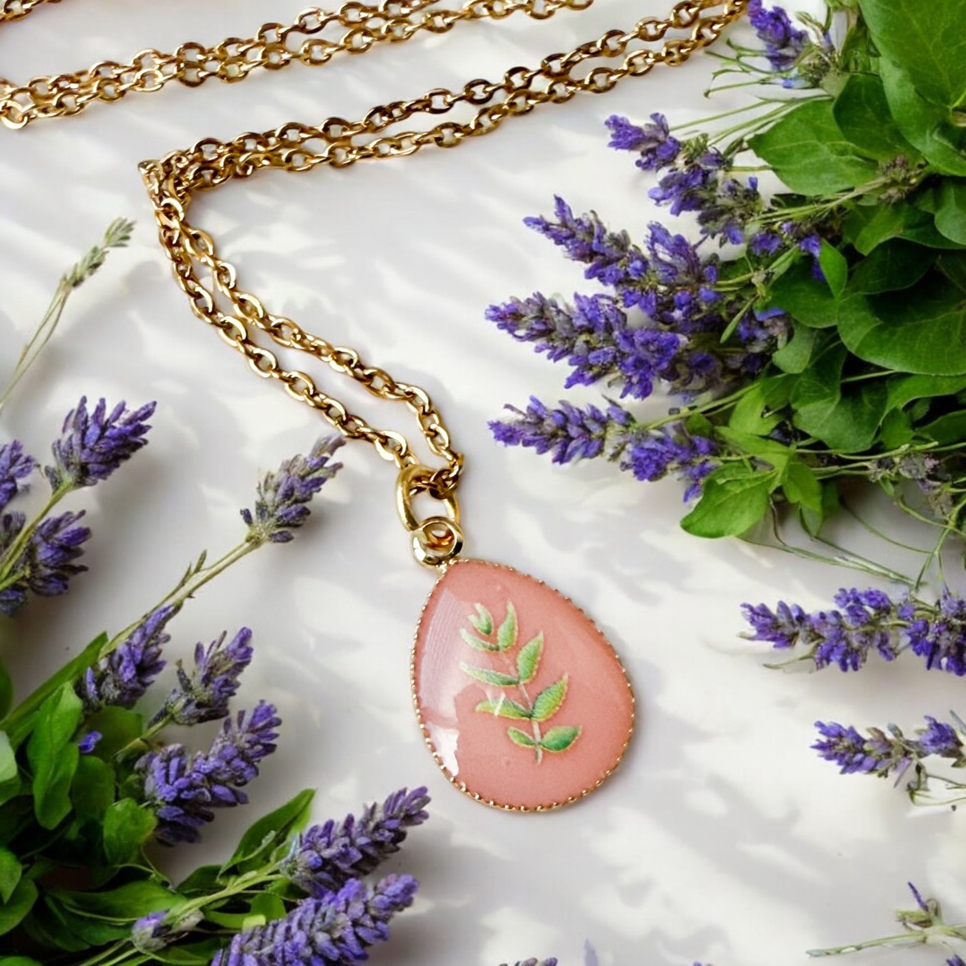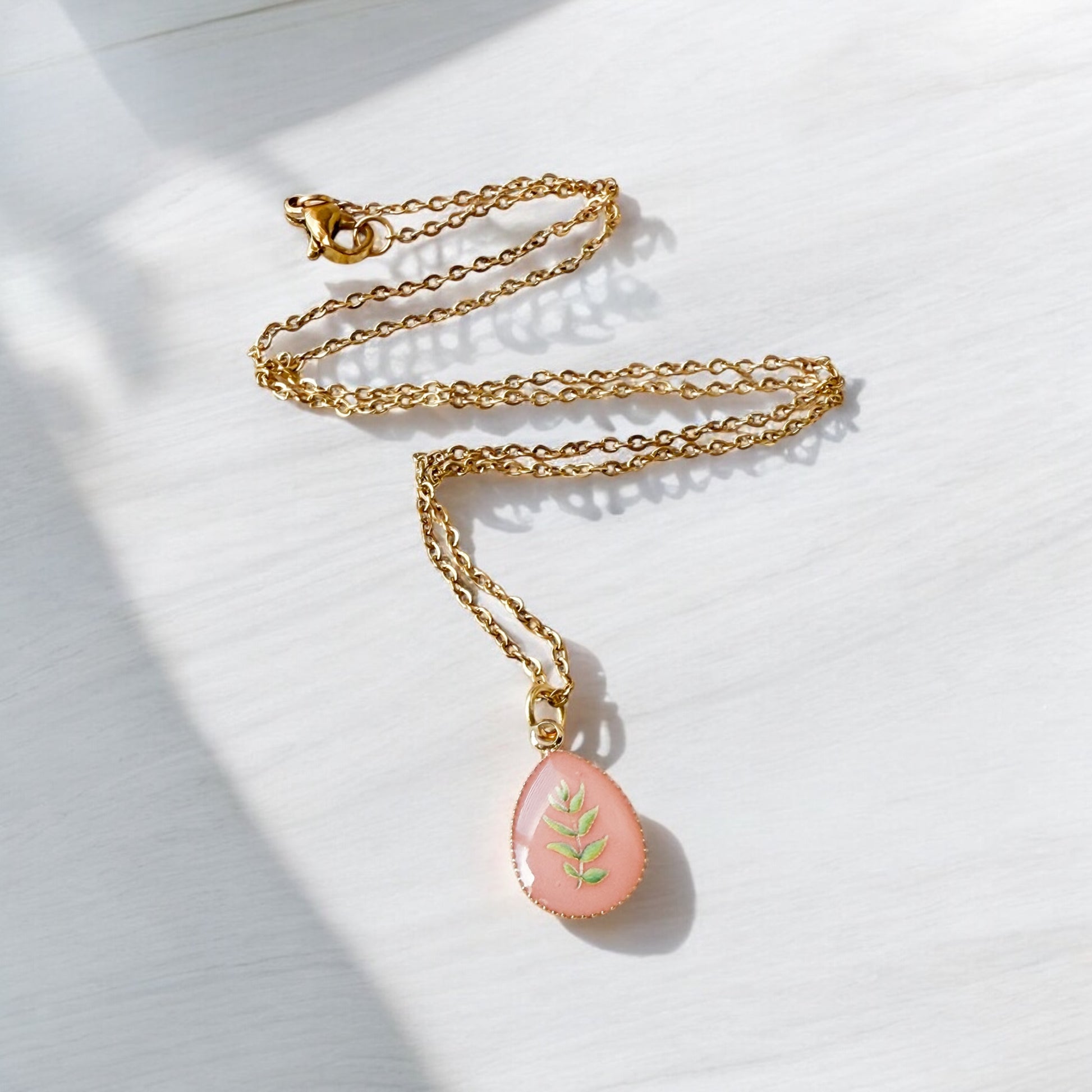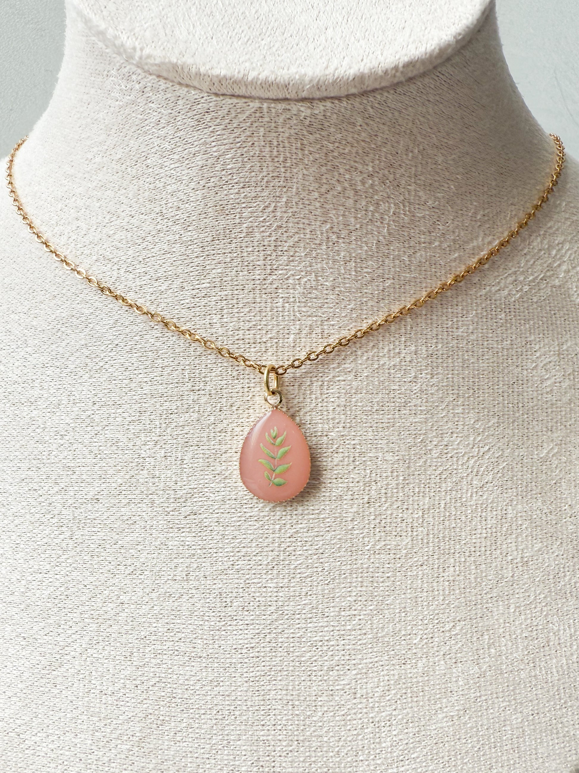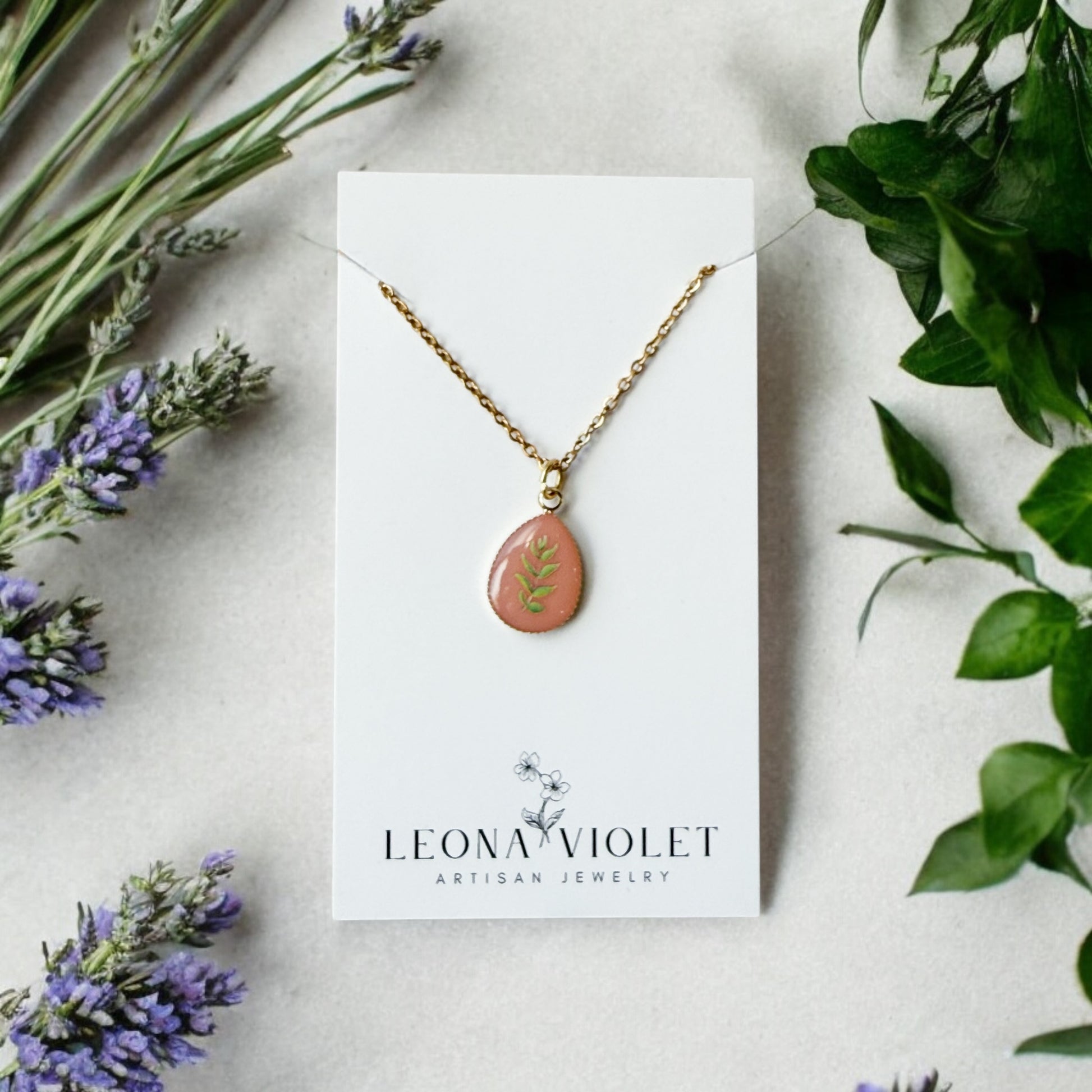 Add a touch of whimsy to your wardrobe with our Fern Charm Necklace. This handmade piece features a teardrop shape and stunning pink resin with a delicate resin image. Strung on a gold plated stainless steel chain, measuring 17 inches long. The pendant is 14k gold plated, and measures 14mm.