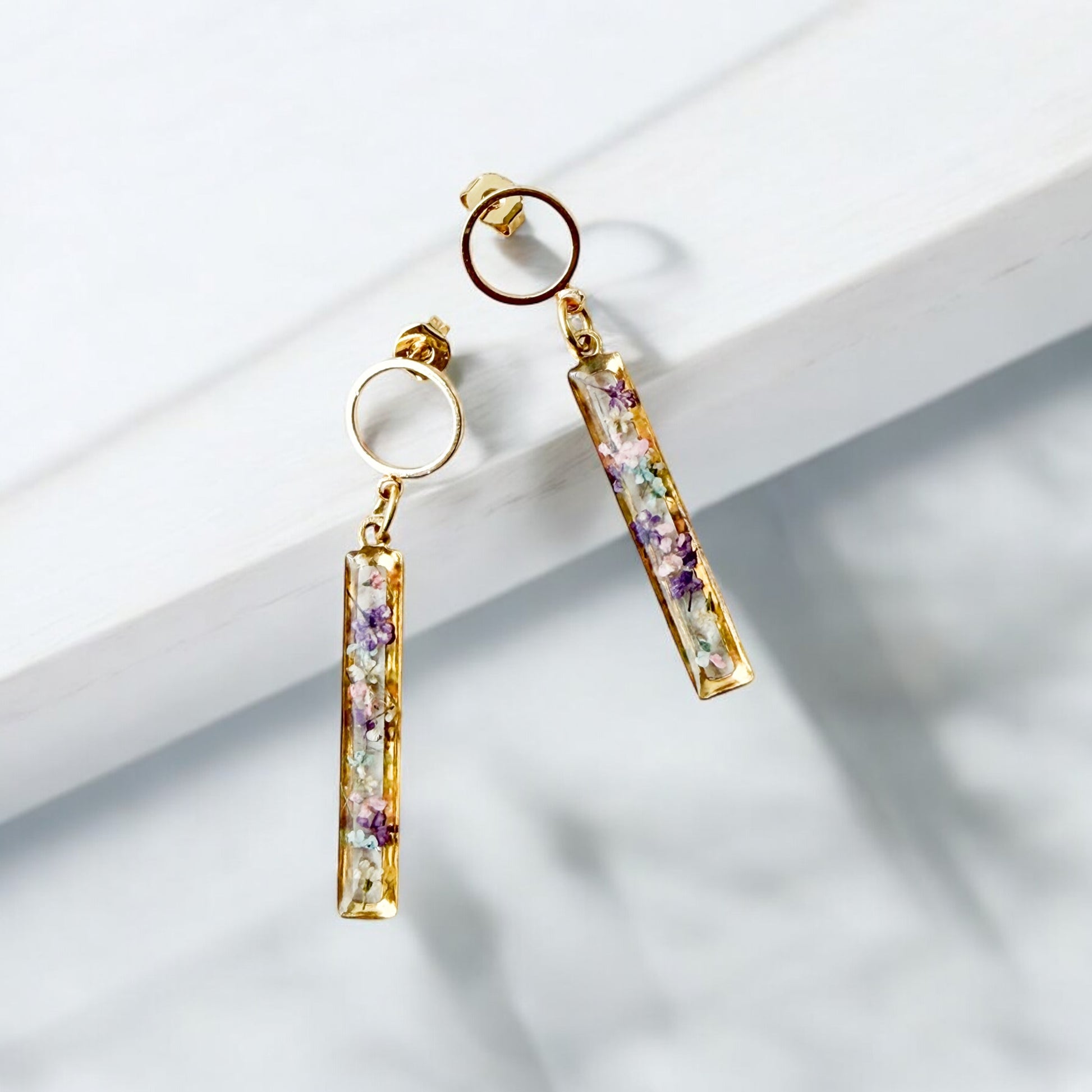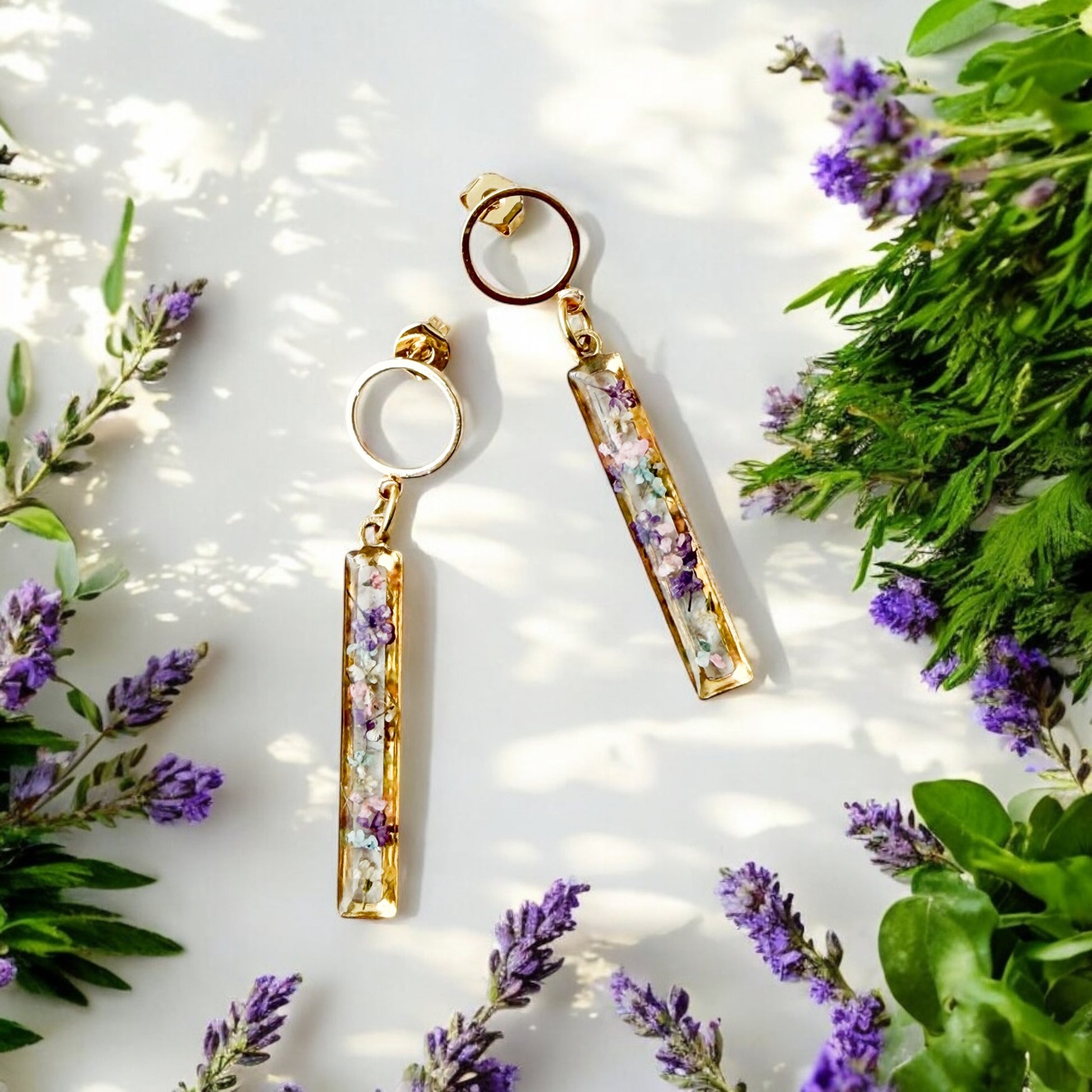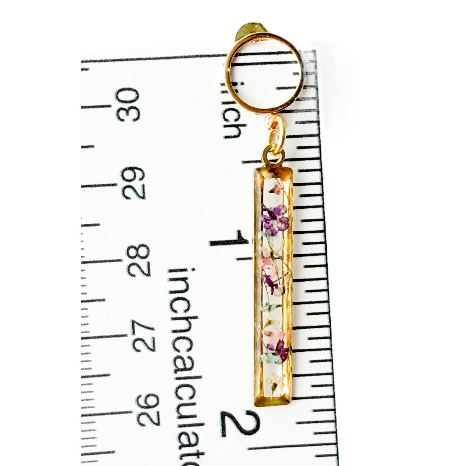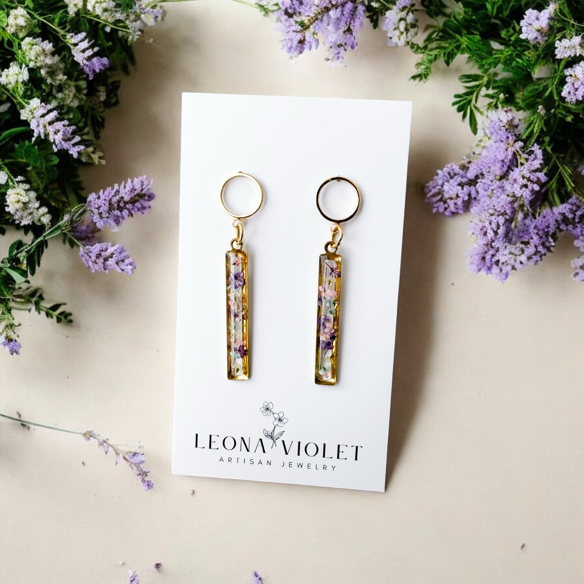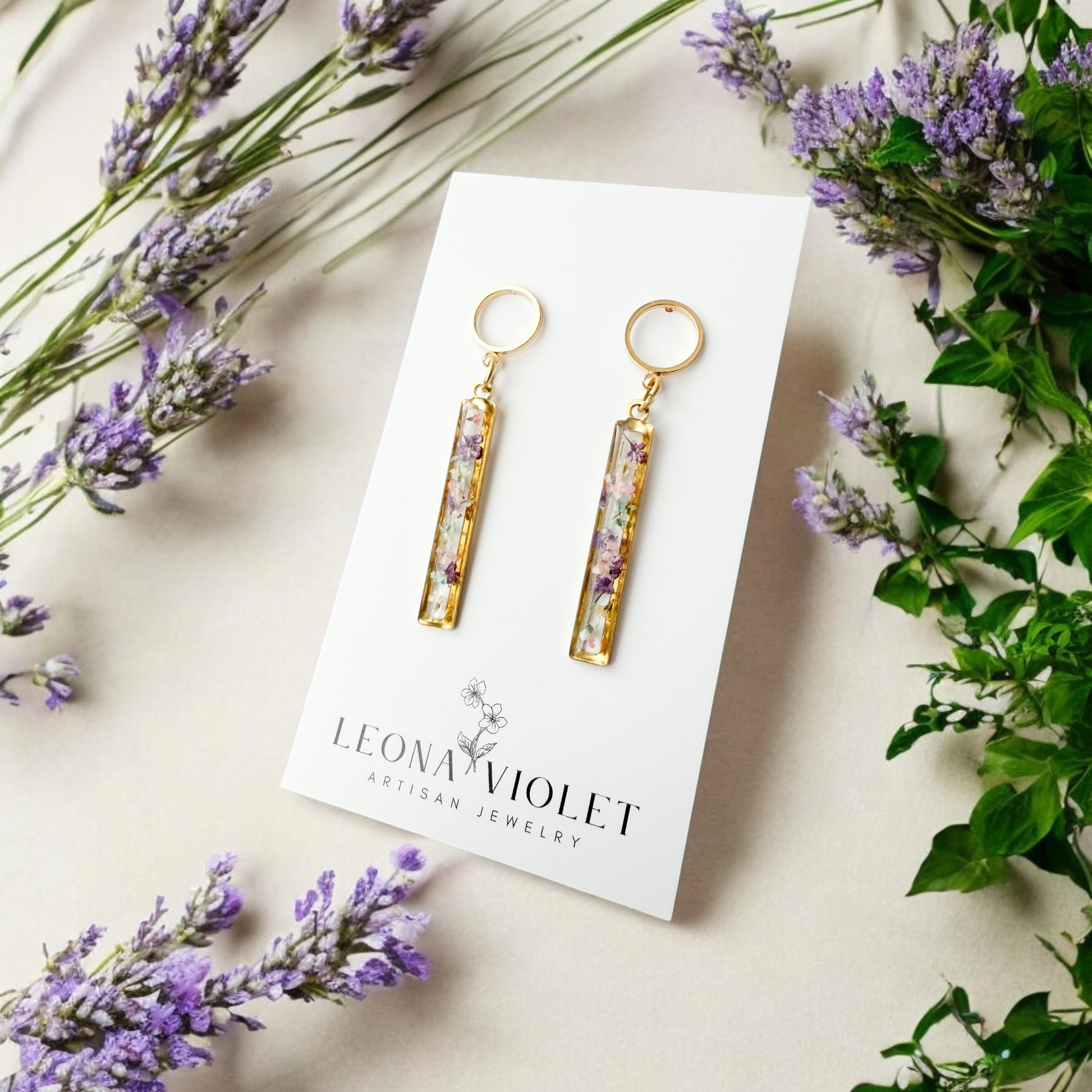 Experience nature's beauty with our Floral Harmony Bar Earrings. These handmade earrings feature real pressed flowers encased in resin, making each pair truly unique. Add a touch of whimsy and nature to your outfit.