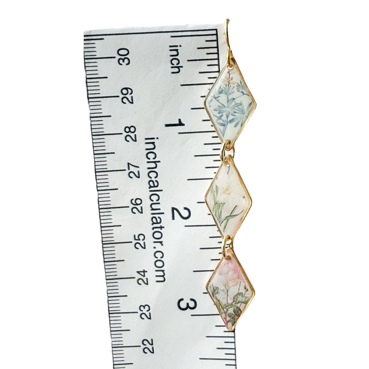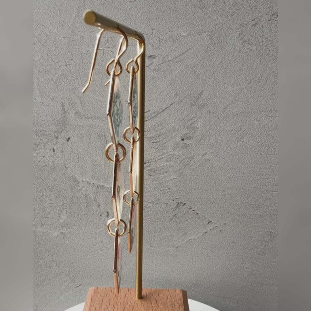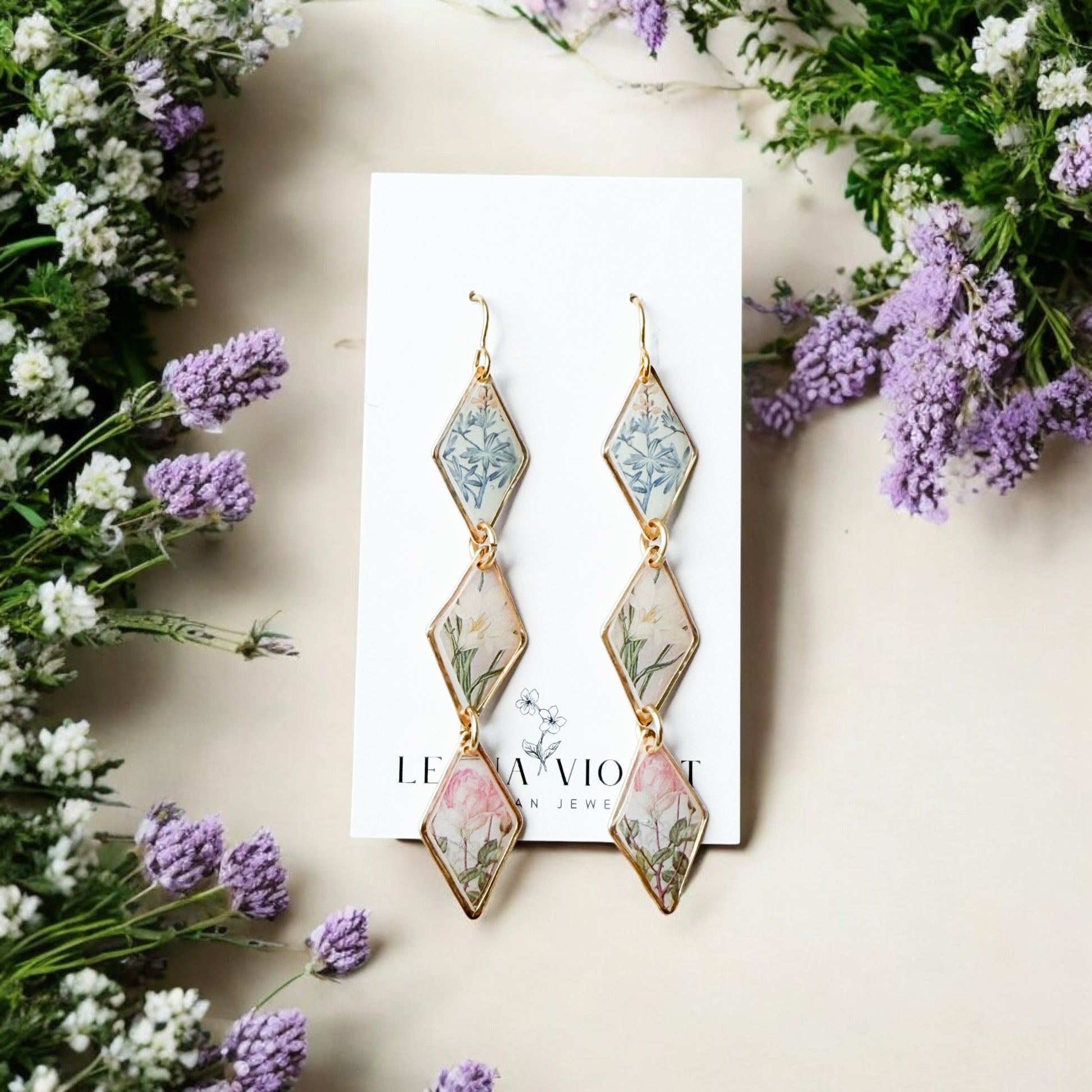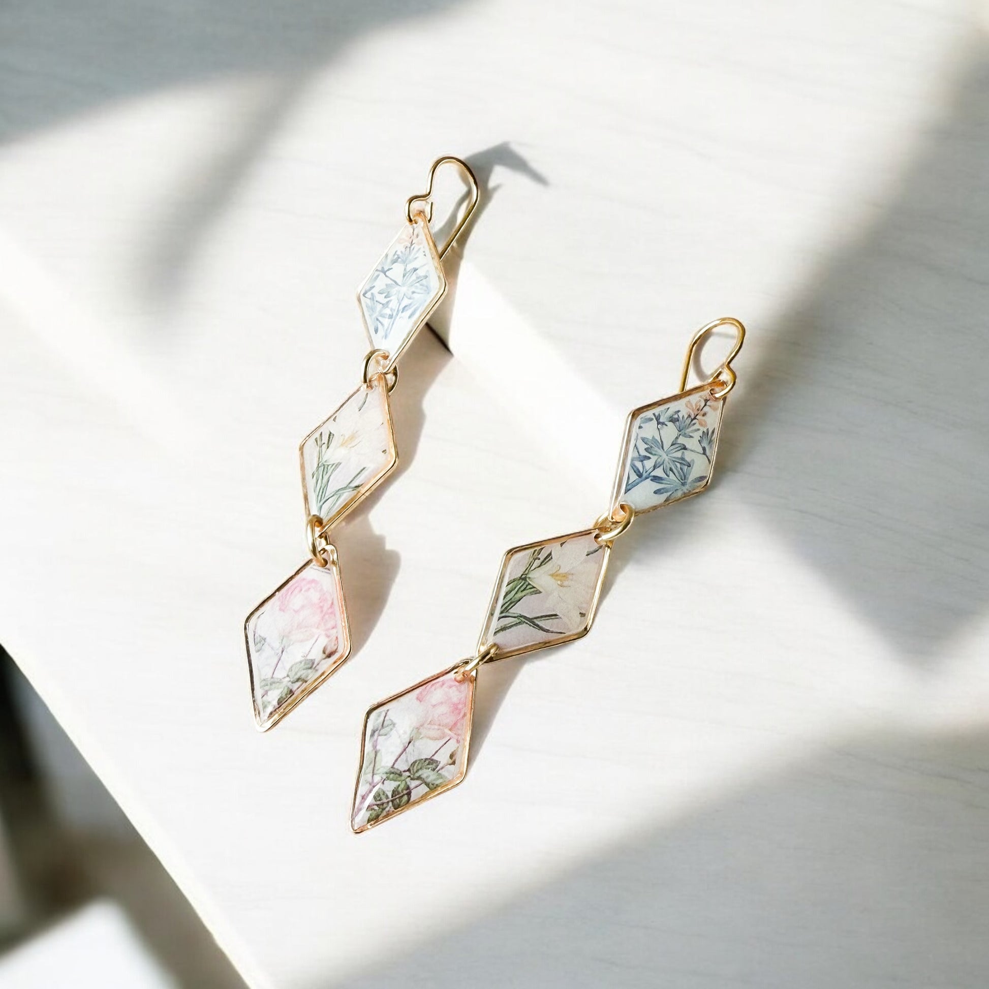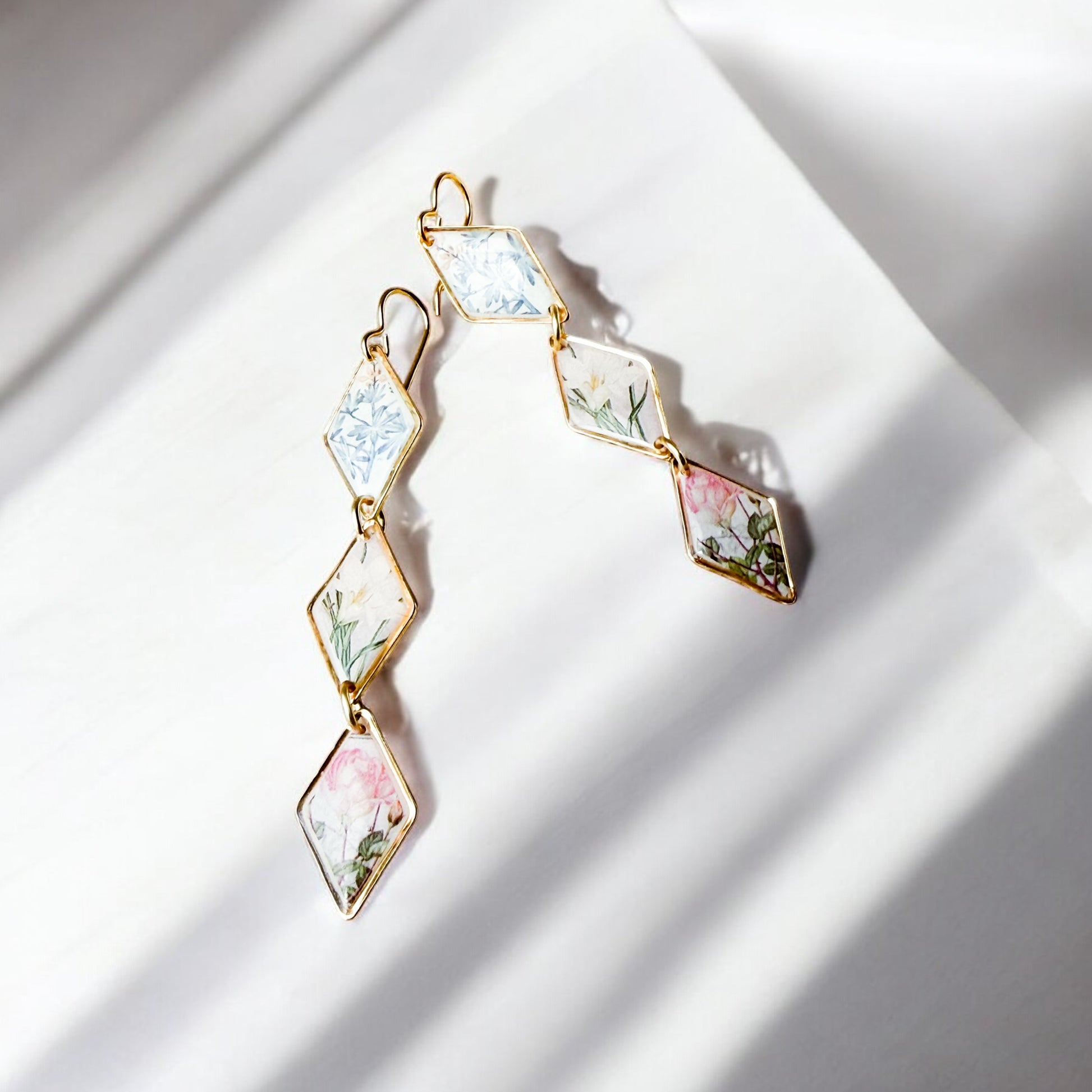 Indulge in the exquisite beauty of the Garden Cascade Earrings. These handmade earrings feature a delicate floral design, crafted with resin and brass components. They hang from hand forged brass ear hooks. Upgrade to 14k gold filled hooks here.