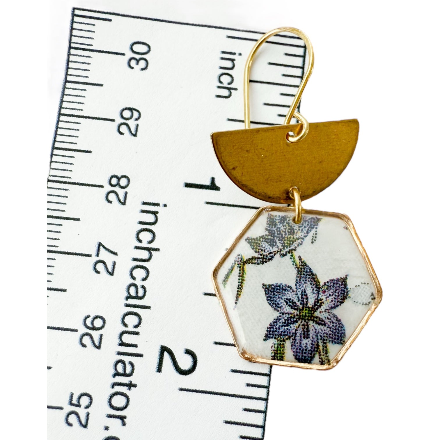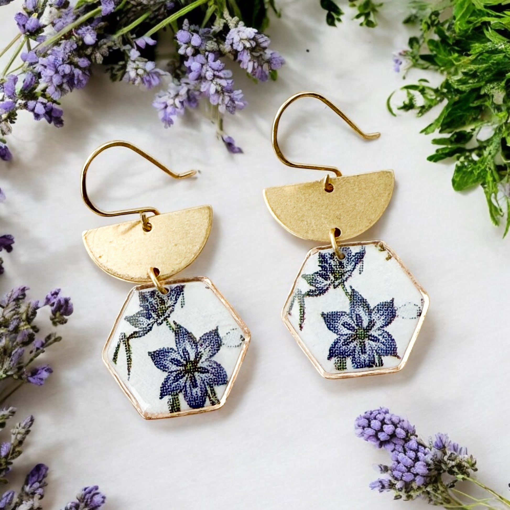 Indulge in the opulence of our Golden Lilly Earrings. Handmade with resin and brass, these exquisite earrings boast a sophisticated blue floral motif.