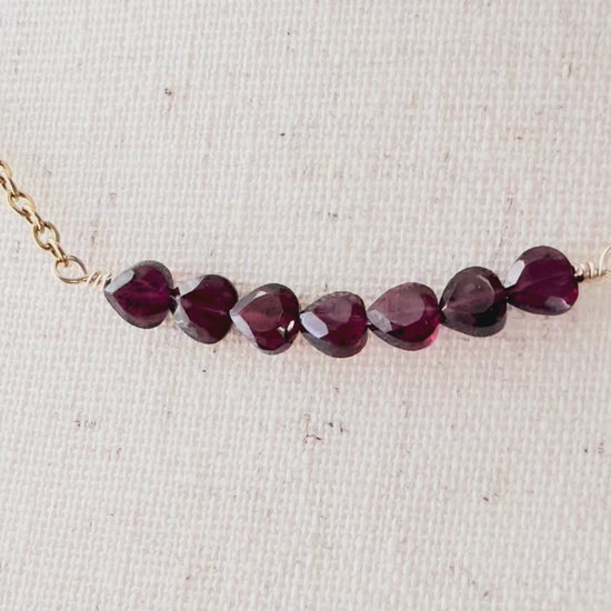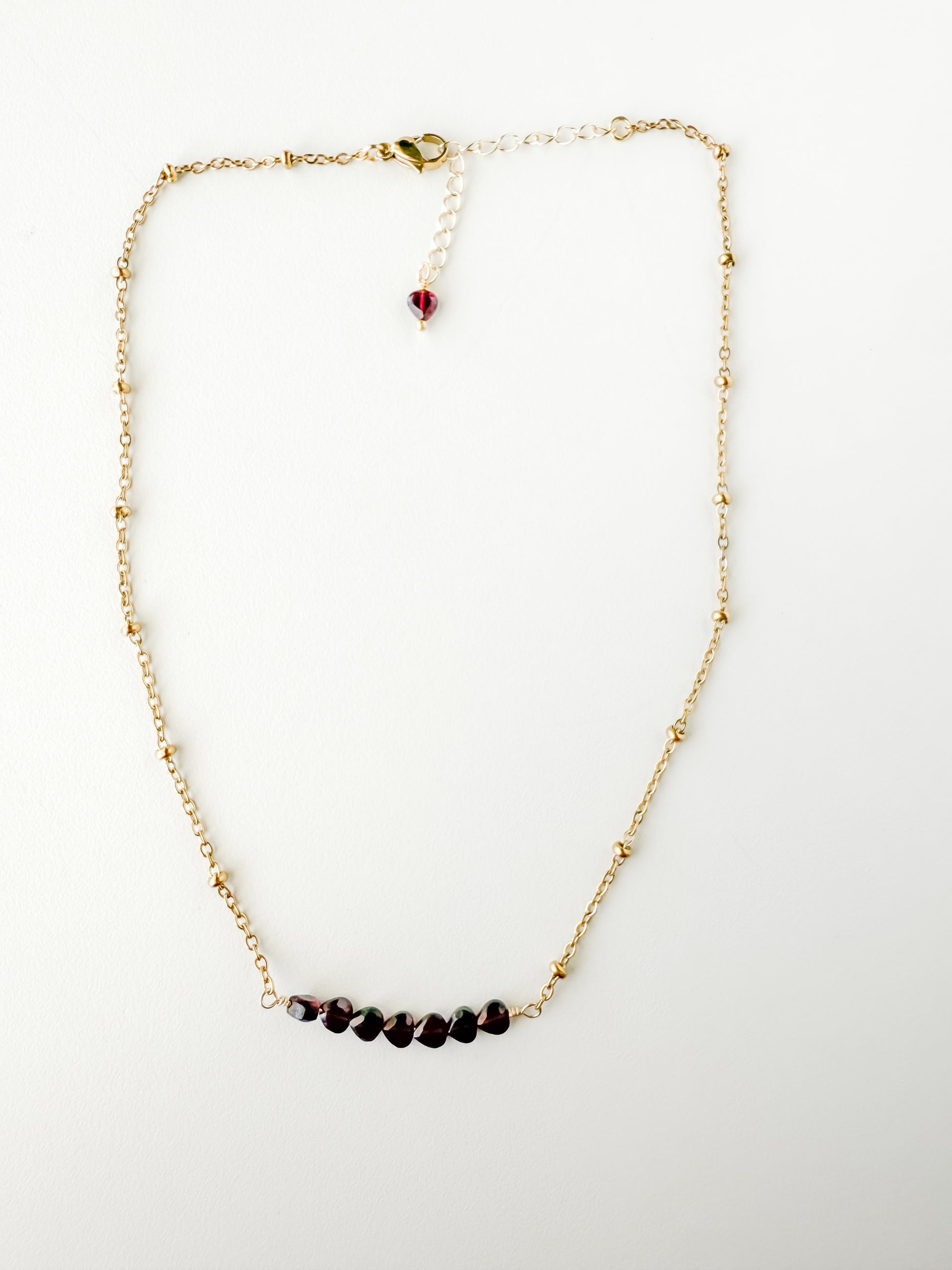 Rich and refined, the Vivienne Necklace is a study in quiet elegance. Hand-cut garnet beads form a delicate focal line, their deep wine tones catching the light with subtle fire and depth.