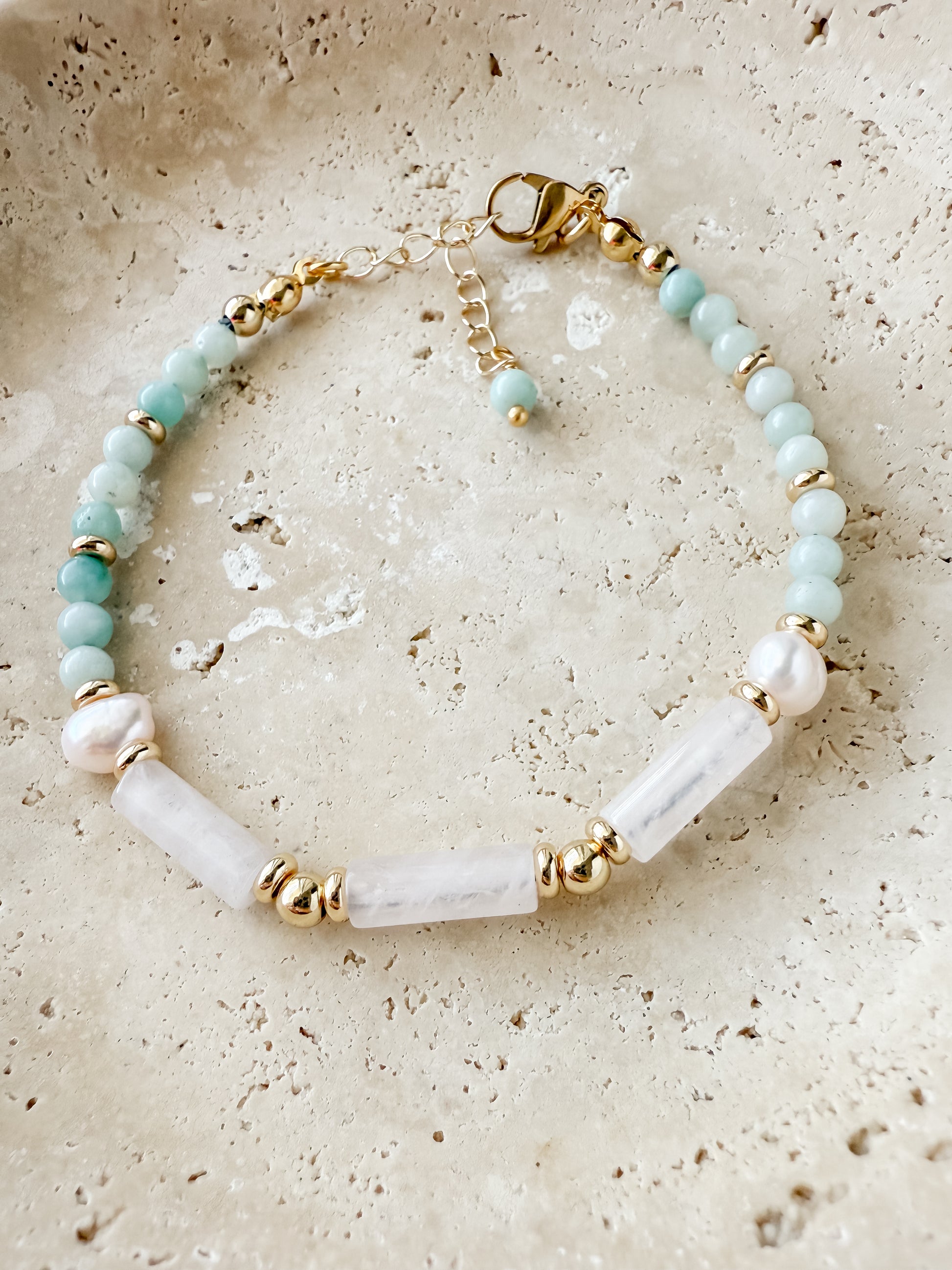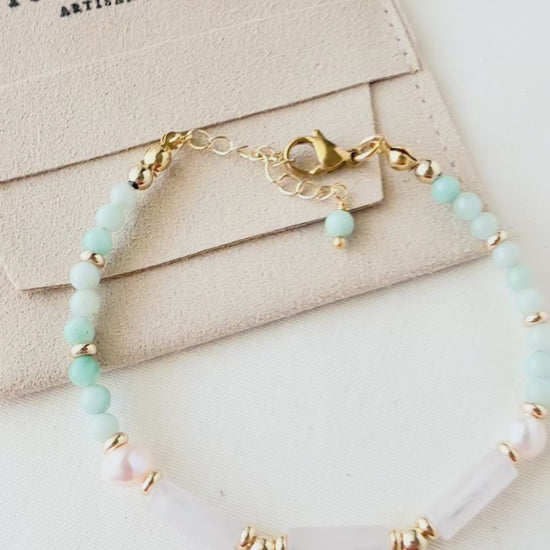 The Aurelie Bracelet is a delicate expression of calm, love, and quiet elegance. Crafted with soothing amazonite, soft rose quartz, and luminous freshwater pearl, this bracelet is designed to bring balance and gentle intention to your everyday style.