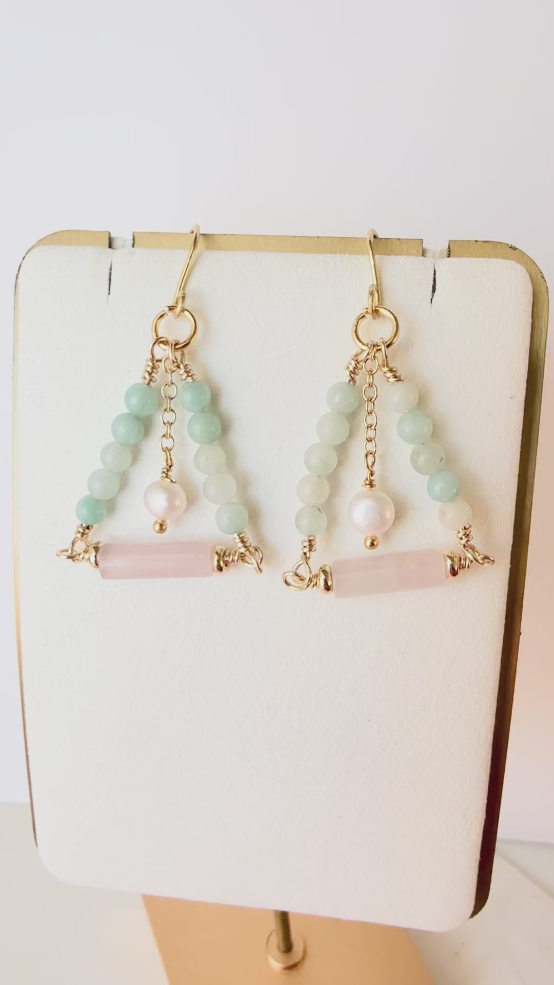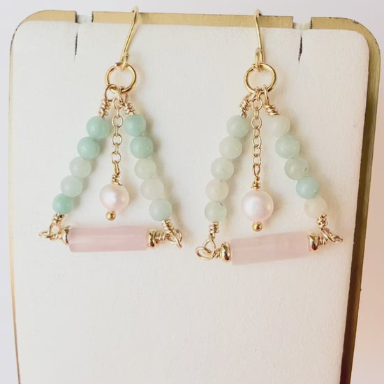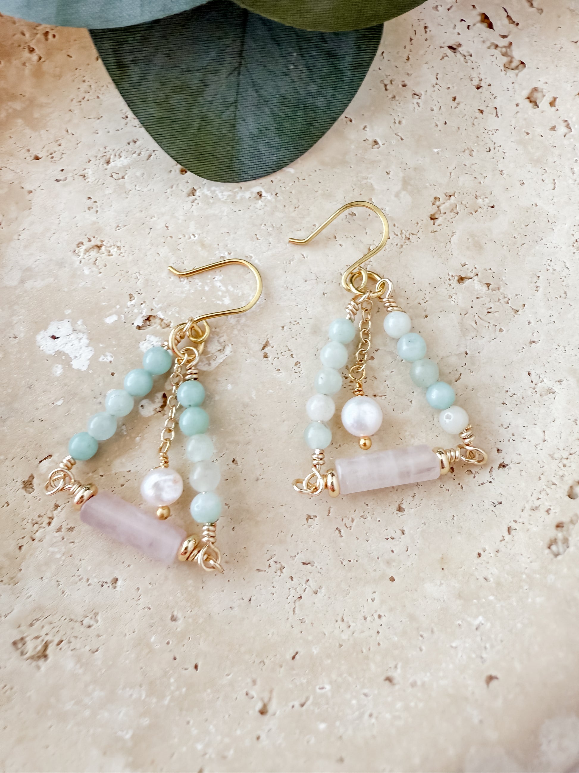 The Aurelie Earrings are a celebration of gentle strength and radiant femininity. Designed with soothing amazonite, heart-centered rose quartz, and luminous freshwater pearl, this pair embodies balance, love, and inner clarity.