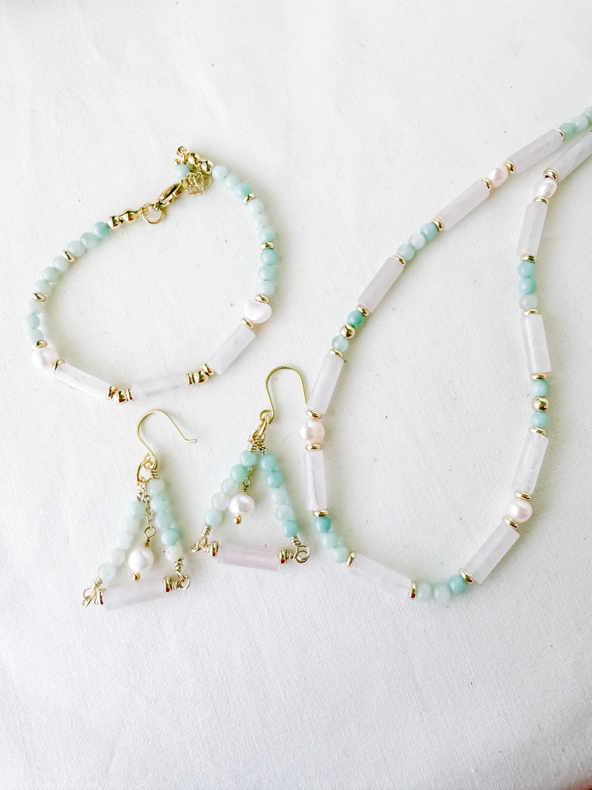 Amazonite is cherished for its soothing, balancing energy—believed to encourage emotional harmony, clarity, and honest self-expression. Rose quartz, known as the stone of unconditional love, brings warmth and compassion, opening the heart to both self-love and connection. Freshwater pearls symbolize wisdom and grace, adding a luminous softness that feels classic and grounding.