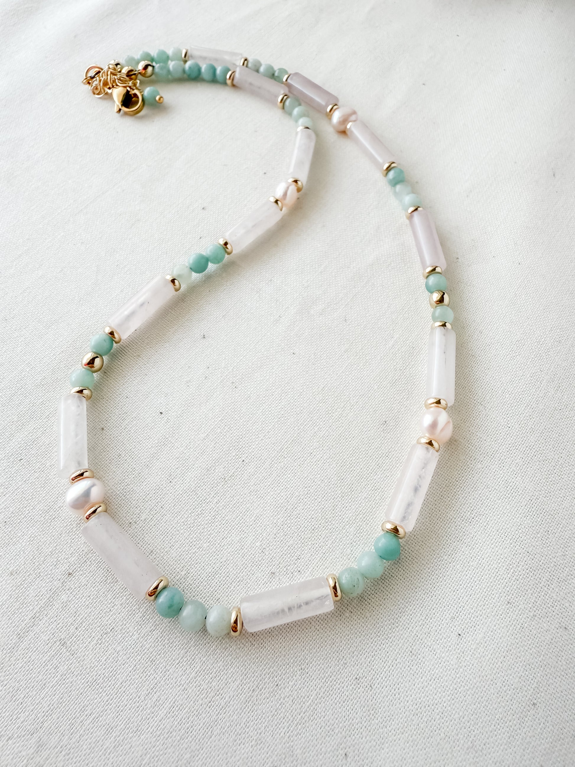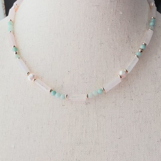 The Aurelie Necklace is a graceful blend of calm energy and timeless femininity. Featuring serene amazonite, soft rose quartz, and luminous freshwater pearls.