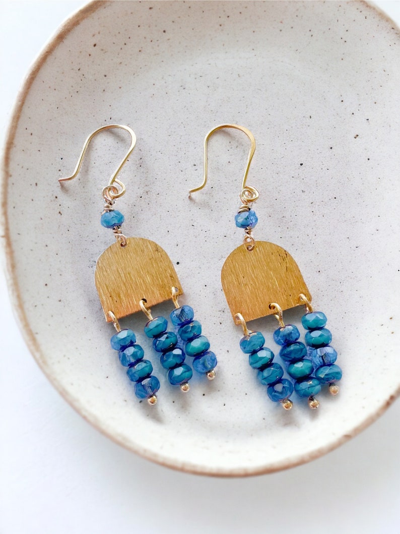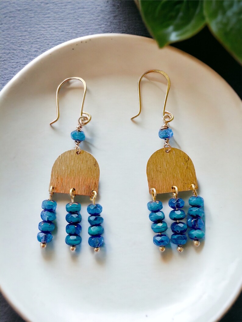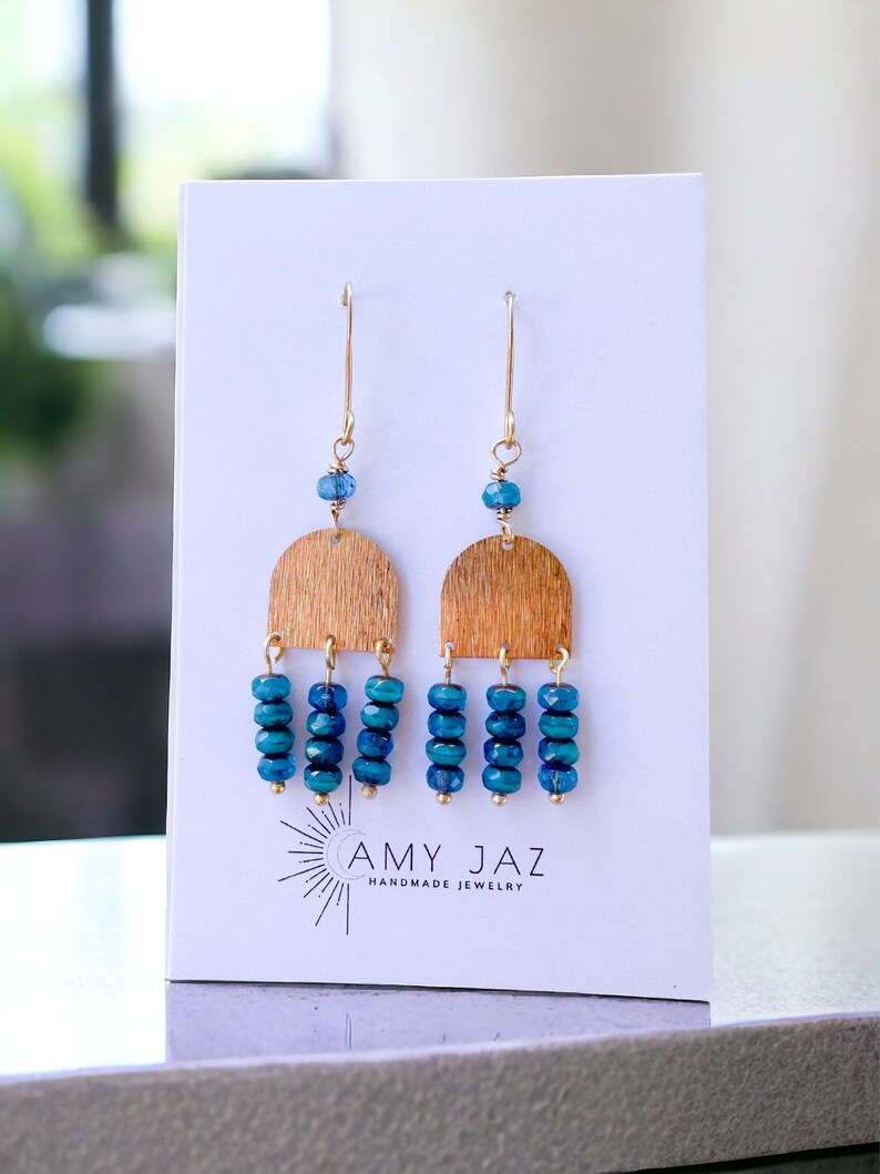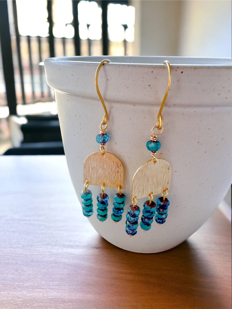 Channeling boho vibes with these handcrafted dangle earrings featuring teal blue hues and a touch of gold ✨ Perfect for adding a pop of color to any outfit! Handmade with brass findings and gorgeous faceted Czech crystals. They measure approximately 1.5 inches and hang from hand forged brass ear wires. 14k gold filled ear wires available for here an additional charge.