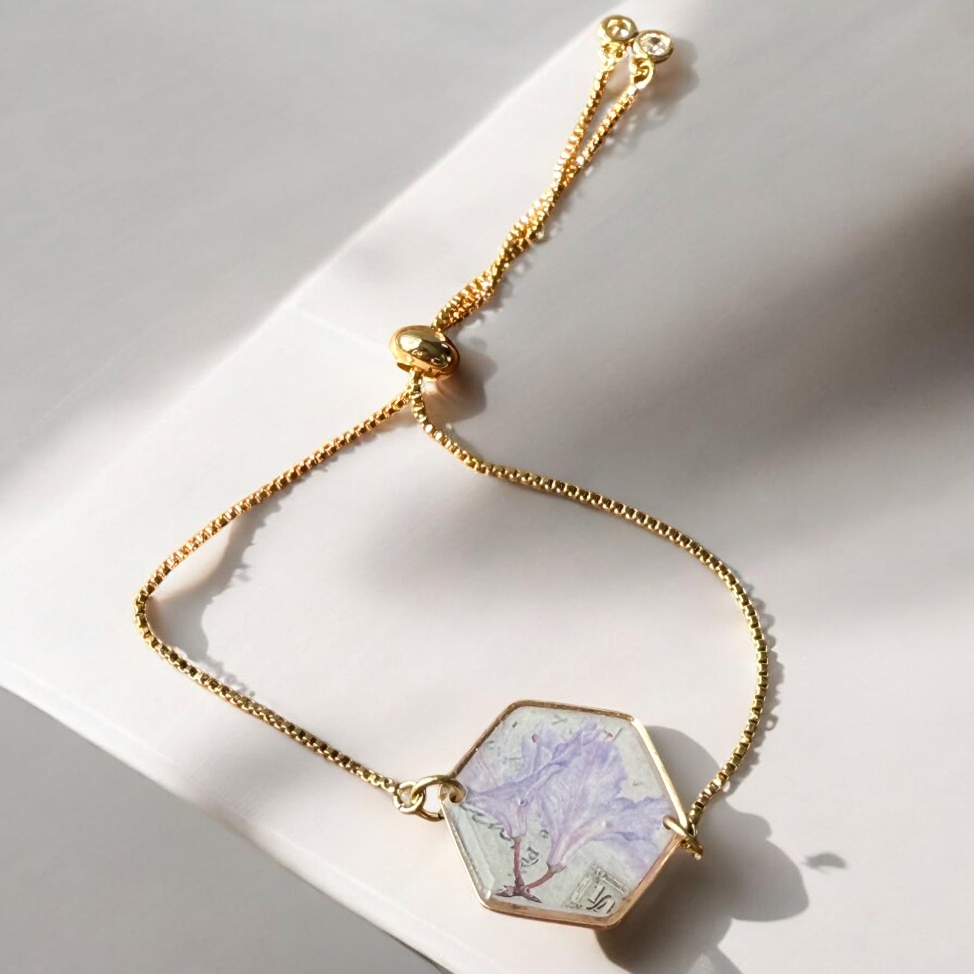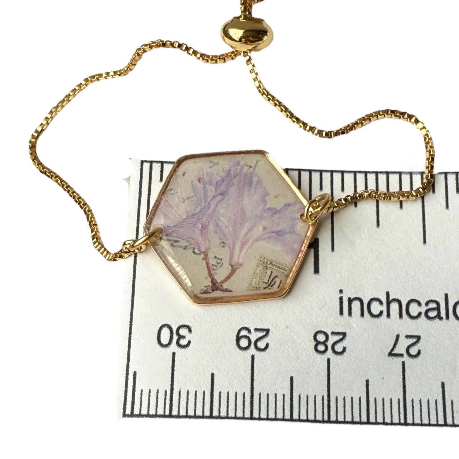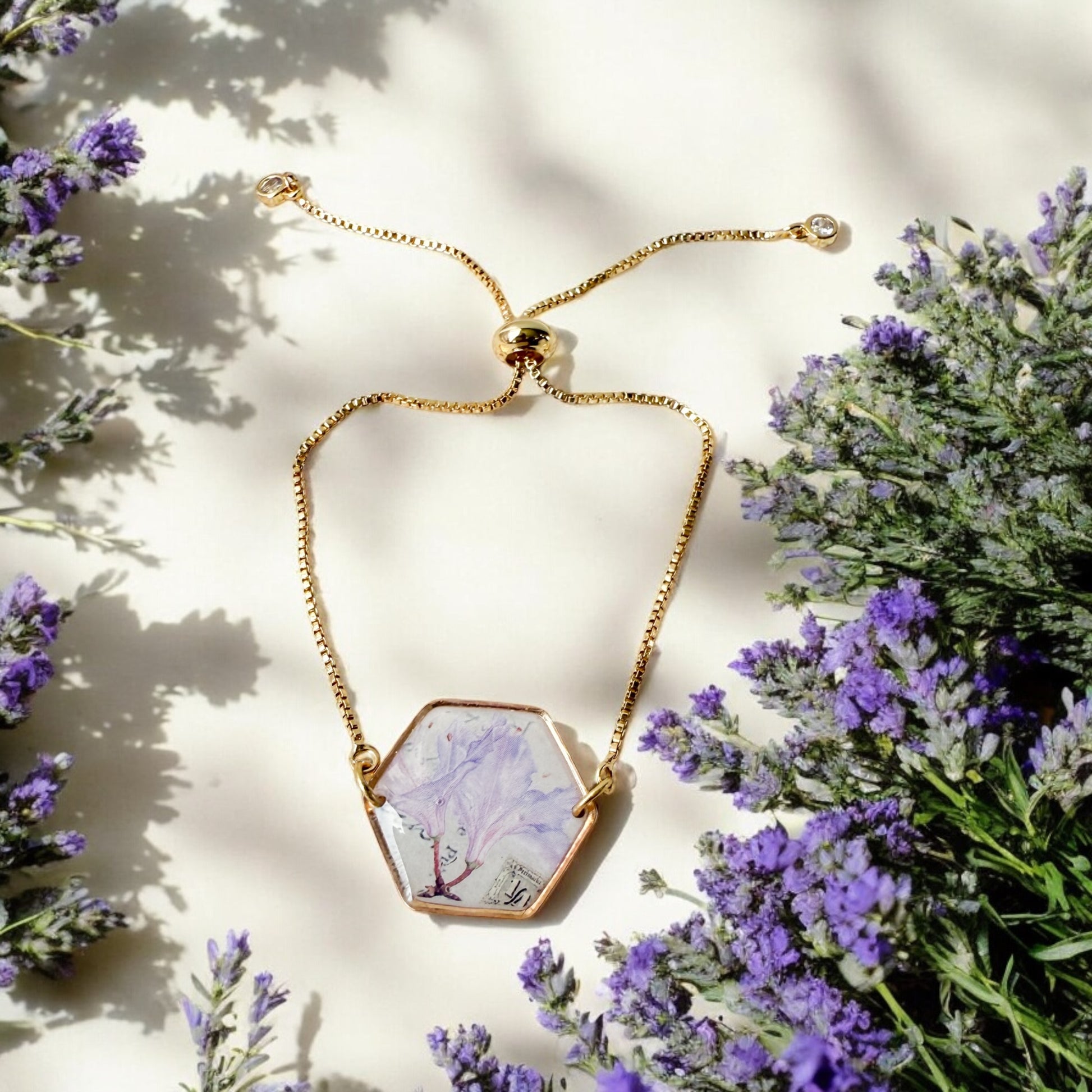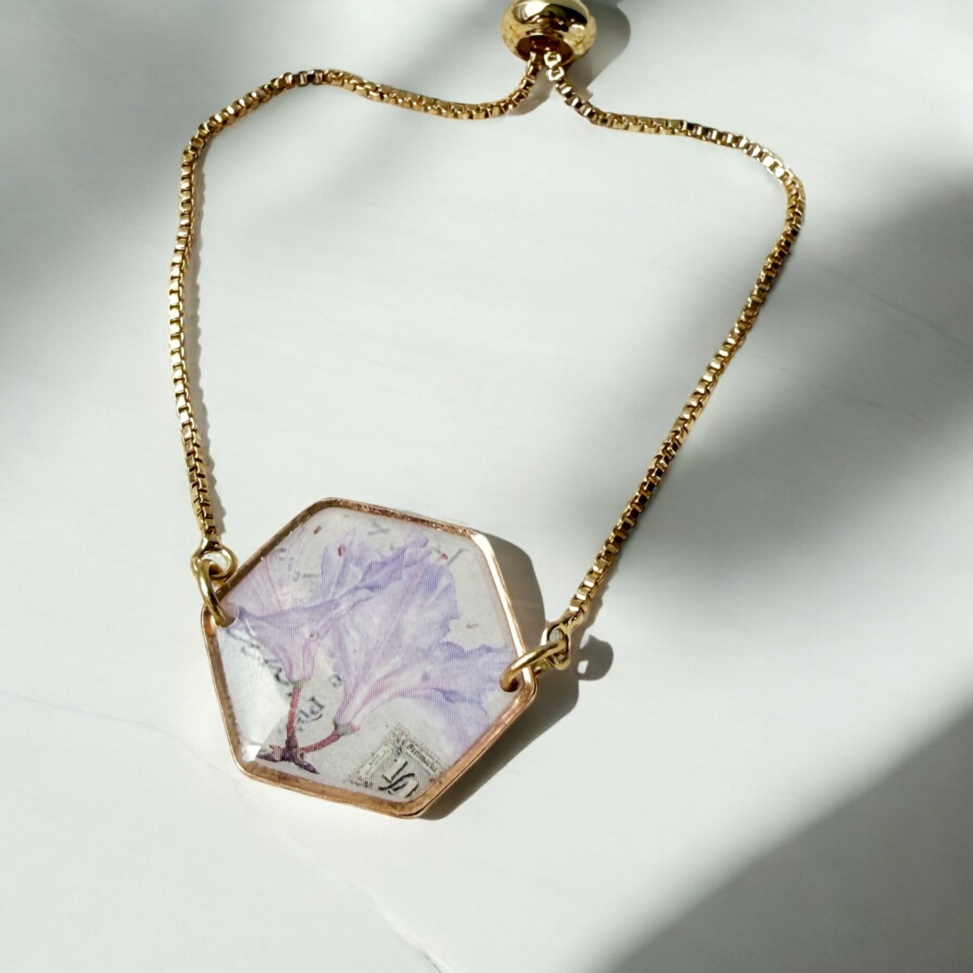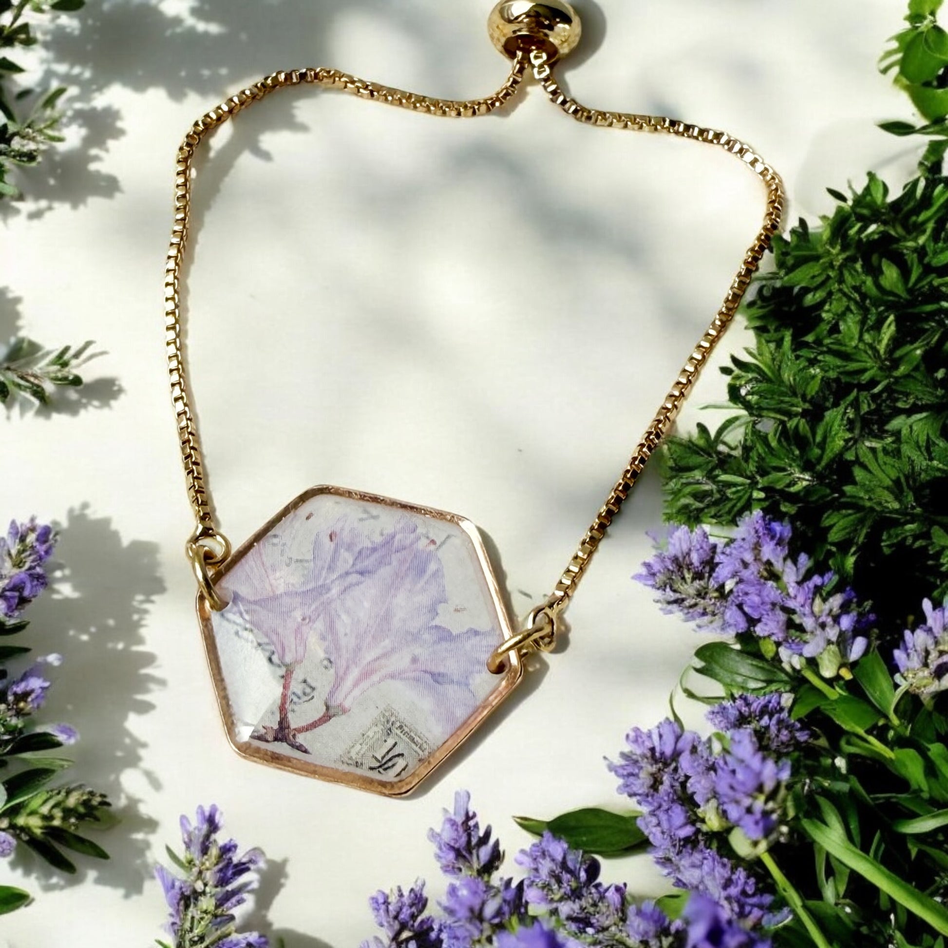Add a pop of whimsy to your outfit with our Lavender Whisper Bracelet. Handmade with a brass hexagon finding and adorned with a lovely blue floral design, this bracelet is as unique as you are. Chain is gold plated with an adjustable slide bead to fit most size wrists.