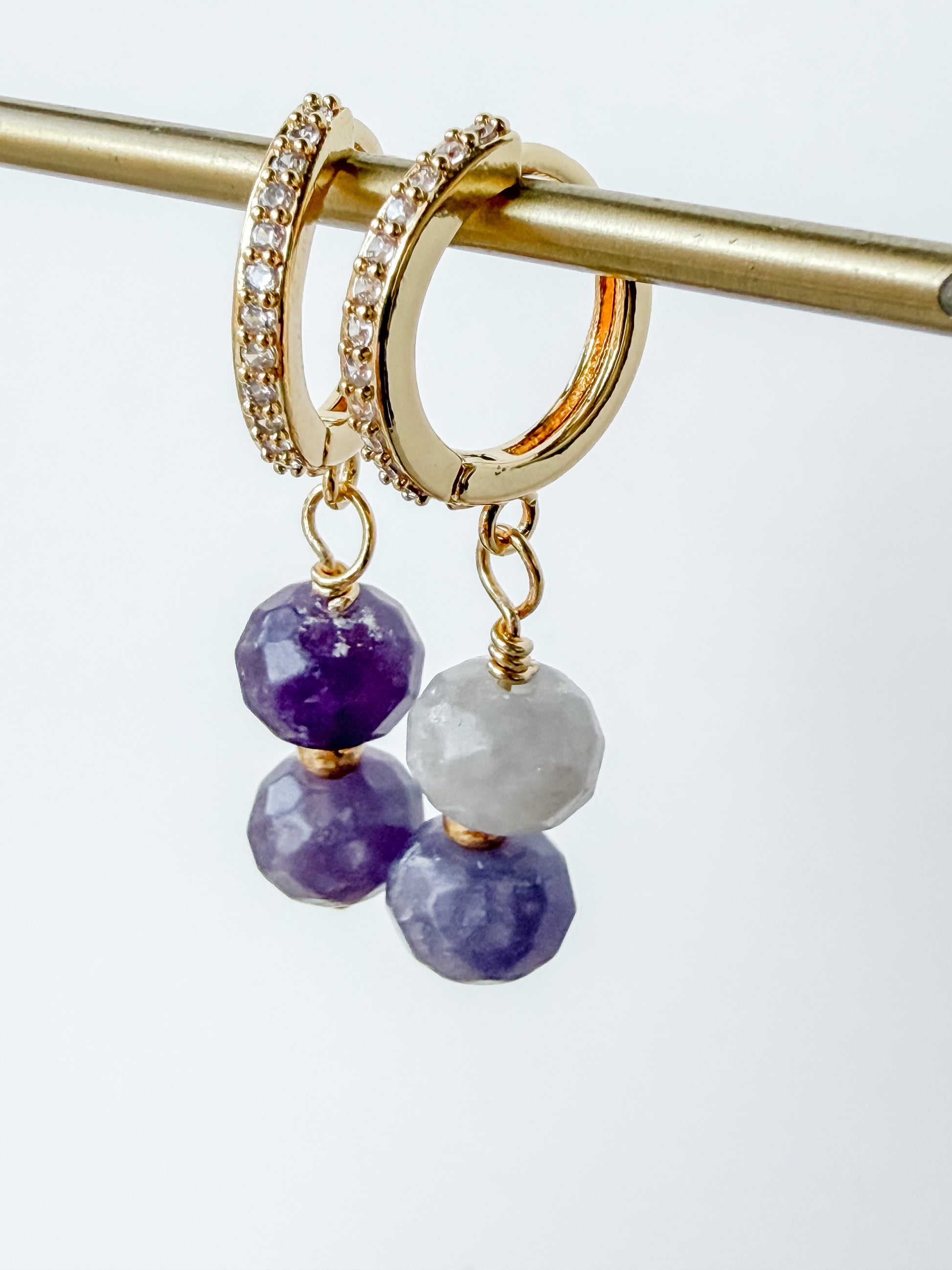 These earrings feature a delicate double-drop design on gold plated rhinestone huggie hoops, giving you just the right amount of movement and sparkle without feeling heavy. Lepidolite is often associated with calm, balance, and emotional ease, making these a meaningful everyday piece — especially for anyone who loves jewelry that feels both beautiful and grounding.