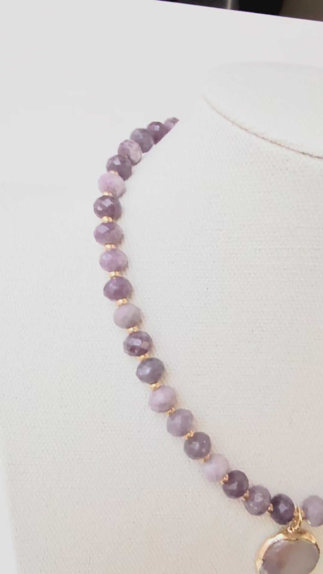 Soft, luminous, and effortlessly elegant — the Moonlit Lilac Necklace is handcrafted with faceted lepidolite gemstone beads, showcasing dreamy shades of lavender and violet. Each bead carries natural variation, making every necklace beautifully one-of-a-kind.