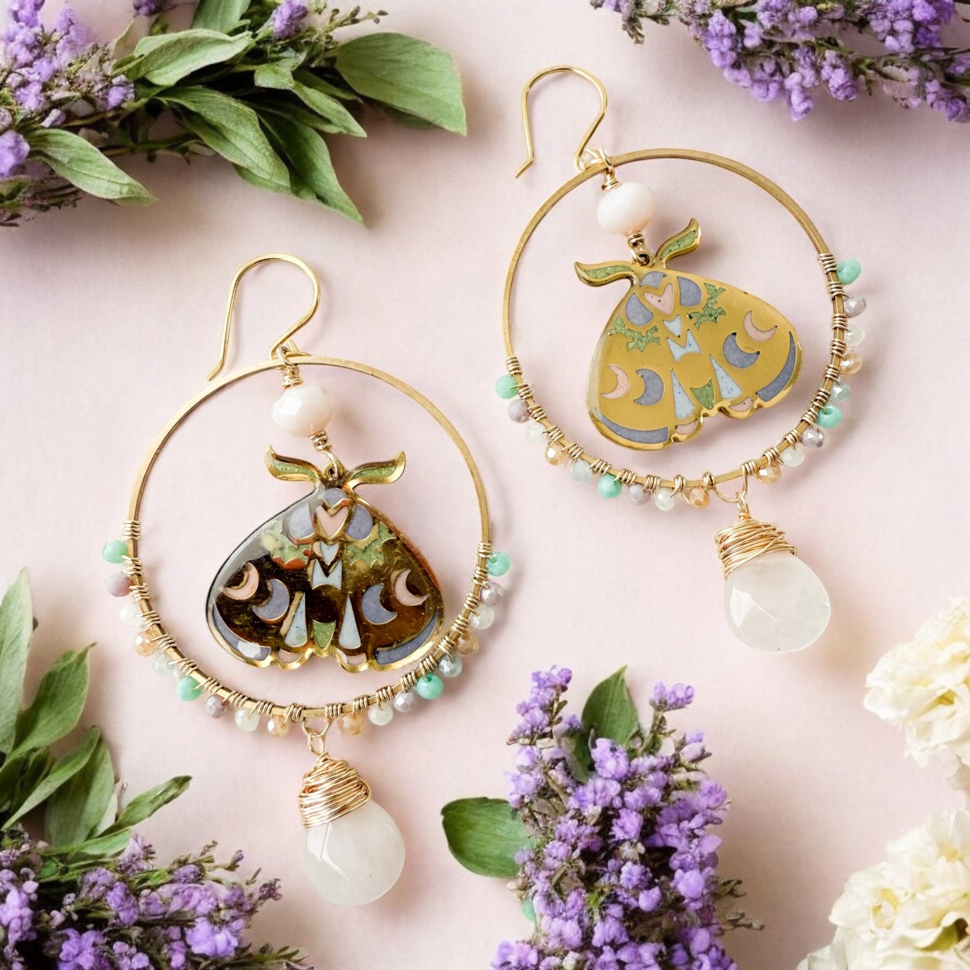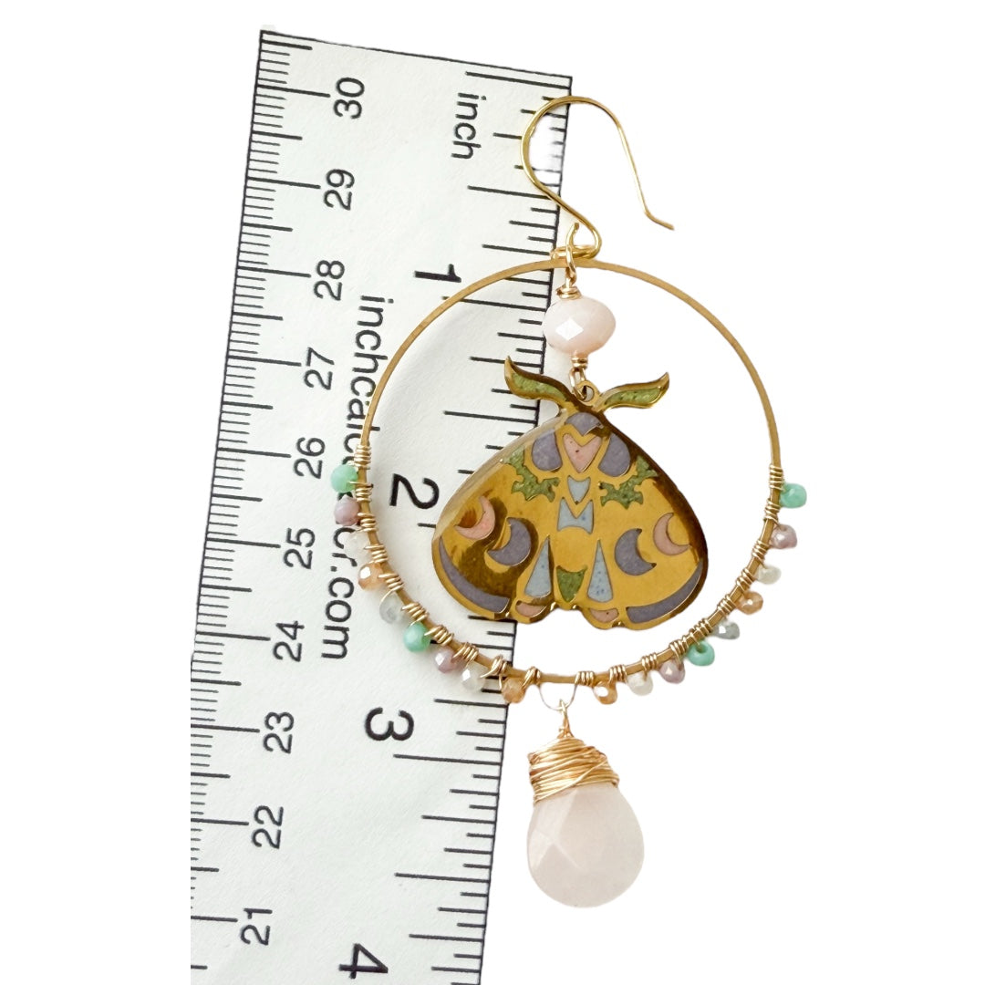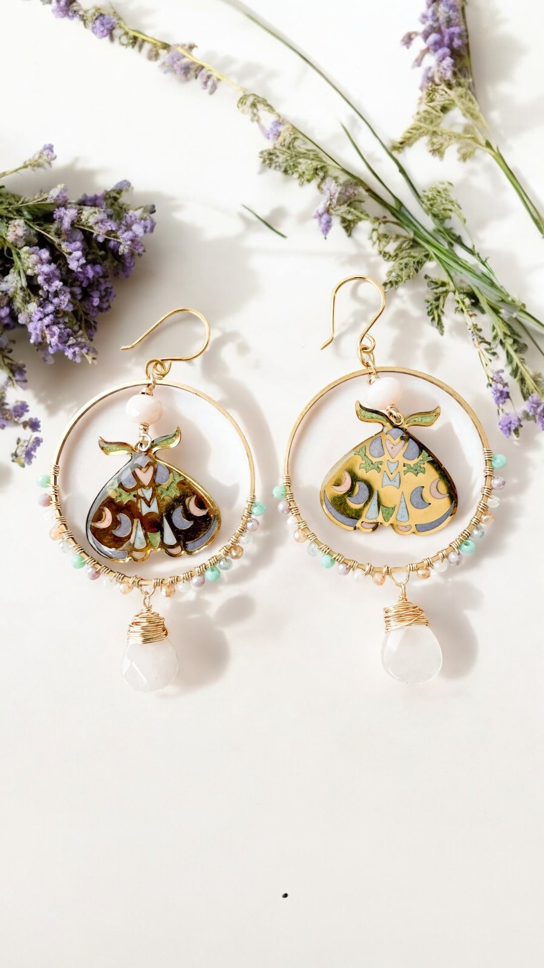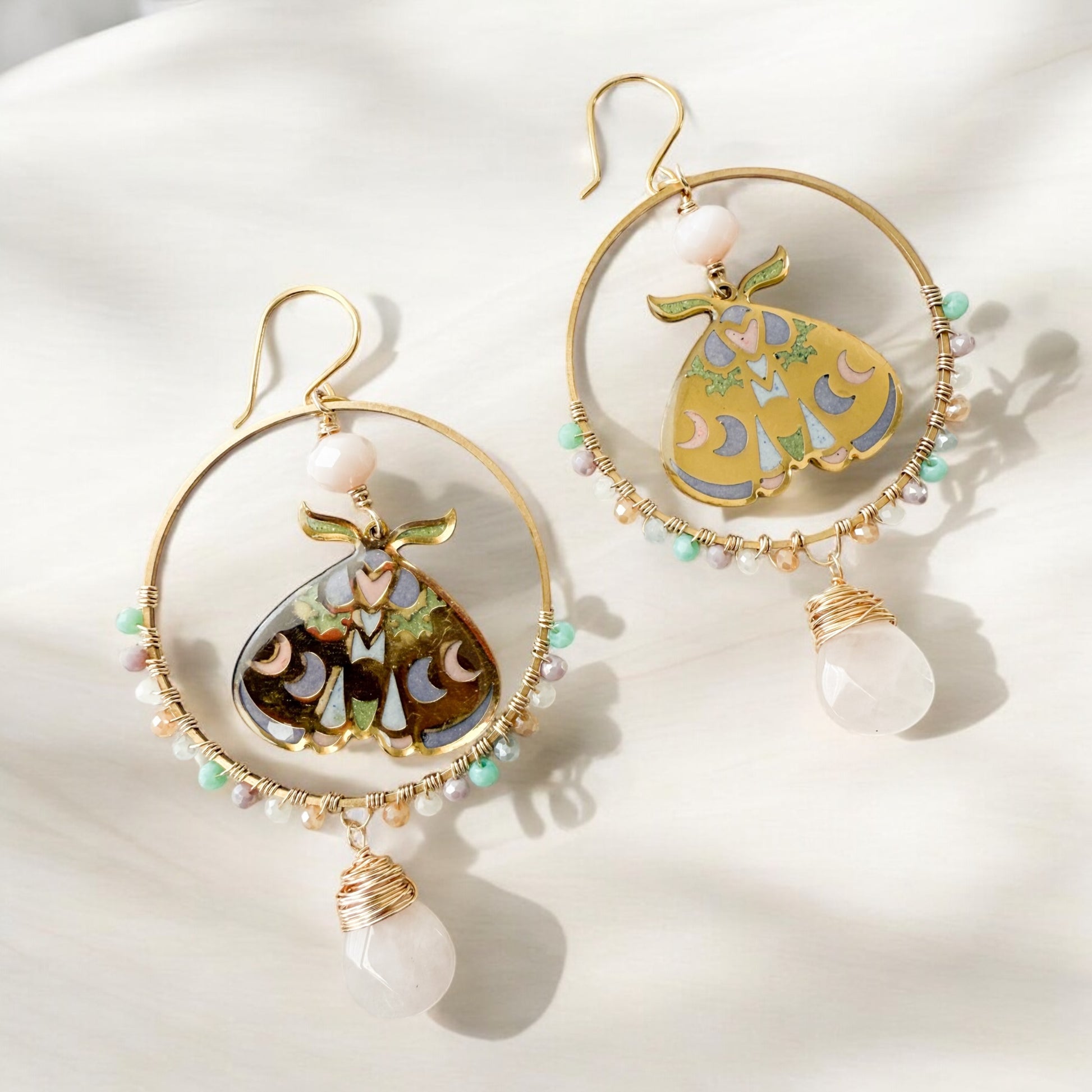 Indulge in the whimsical beauty of our Mystic Moth Earrings. Each pair is meticulously handpainted with colored resin, and adorned with wire wrapped czech glass beads and genuine rose quartz briolette gemstones. Embrace the enchanting elegance of these unique and intricate earrings.