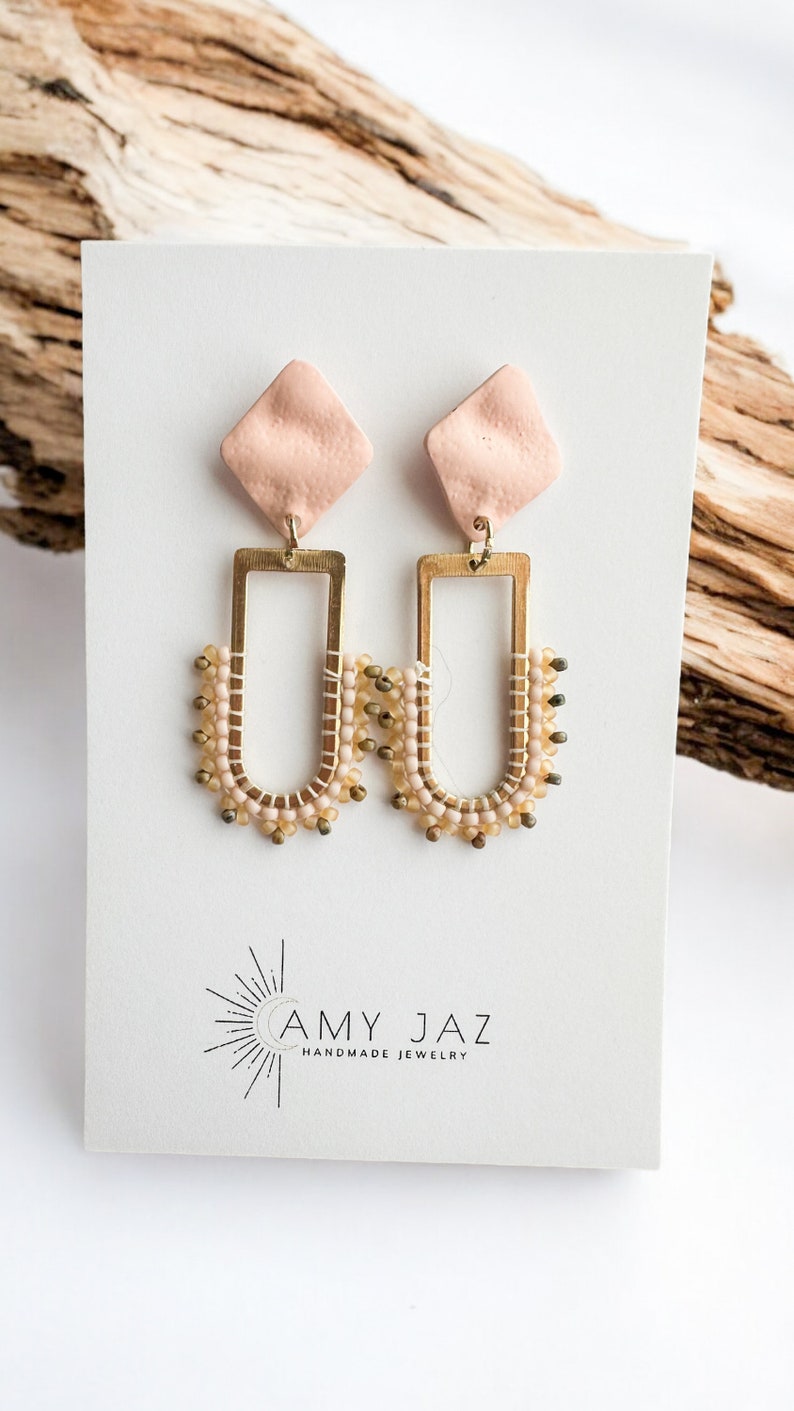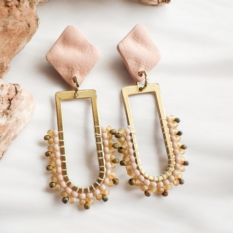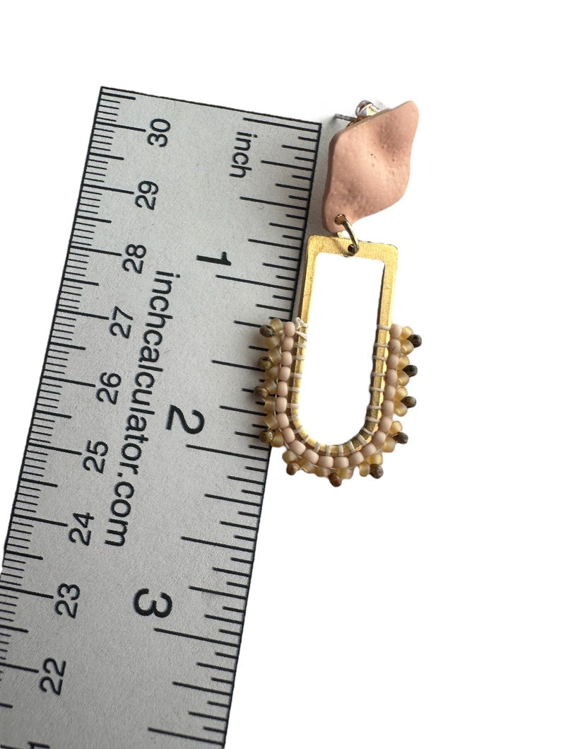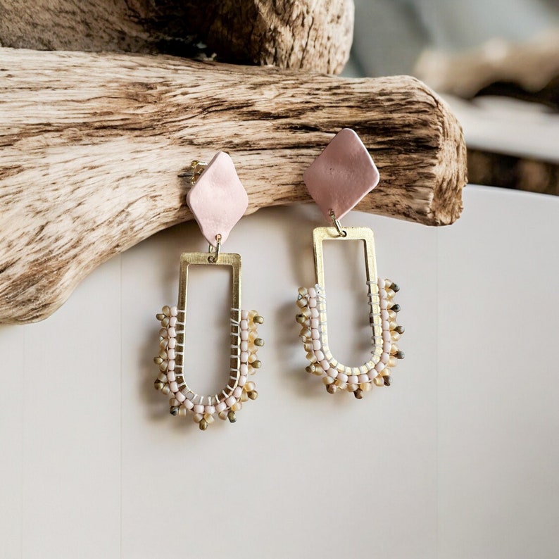 The Portland earrings feature brass components accented by miyuki seed beads. They dangle from matte pink painted metal stud earring findings.
