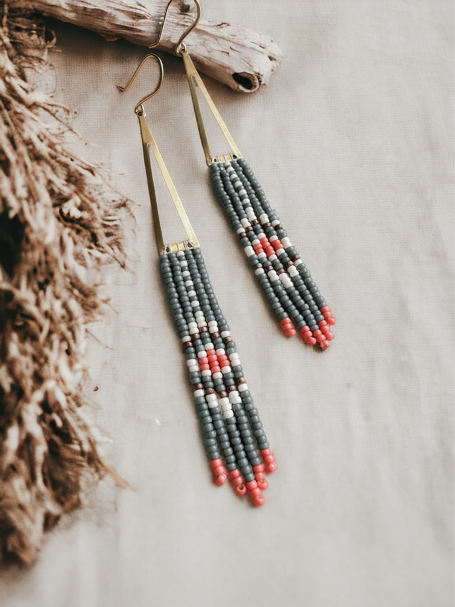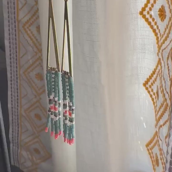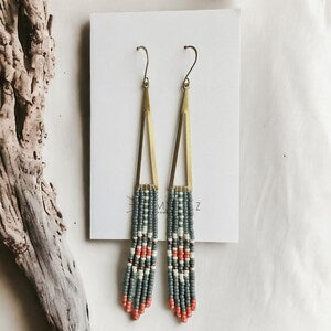 Handmade with Miyuki glass seed beads, woven into an original fringe design suspended from a brass triangular component.