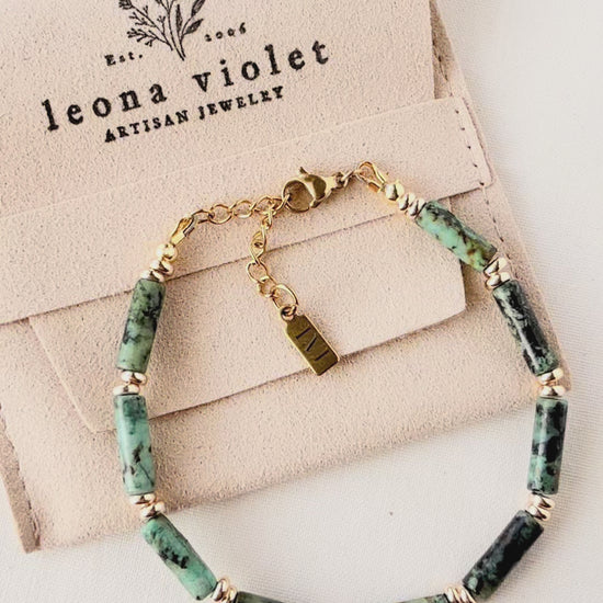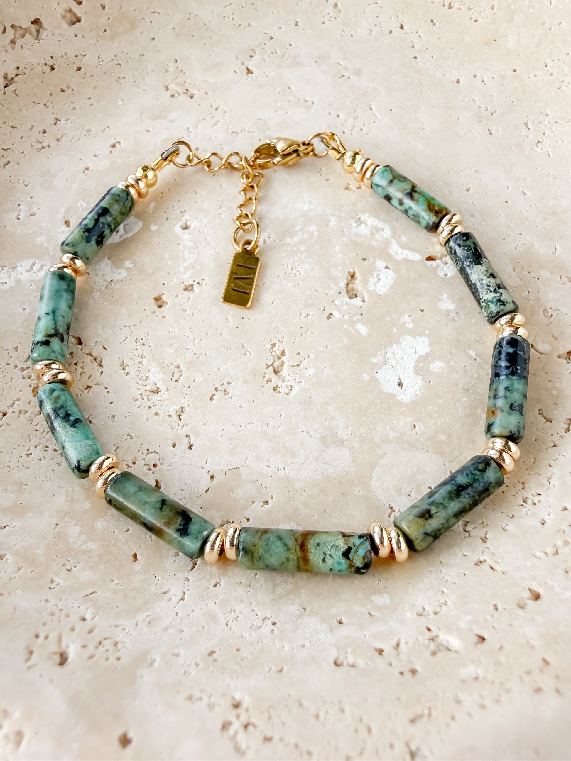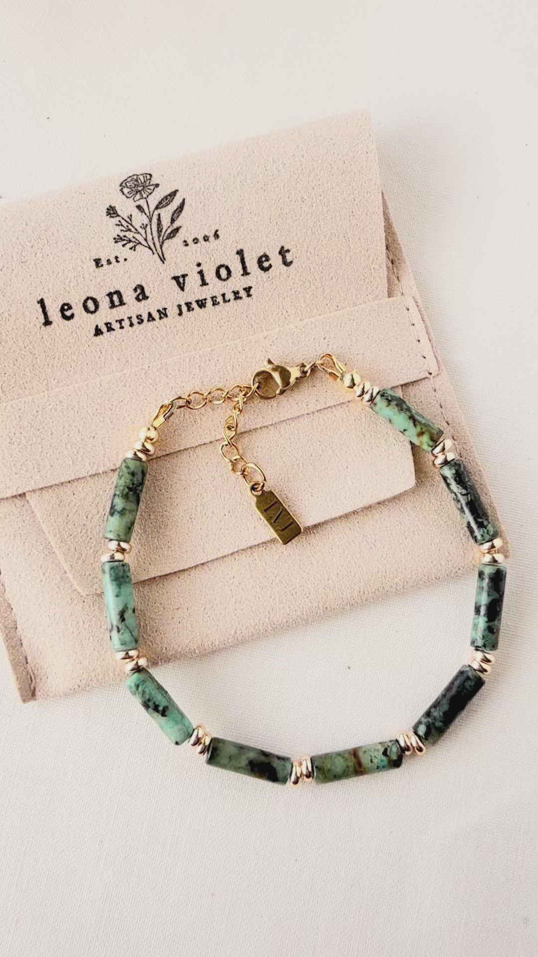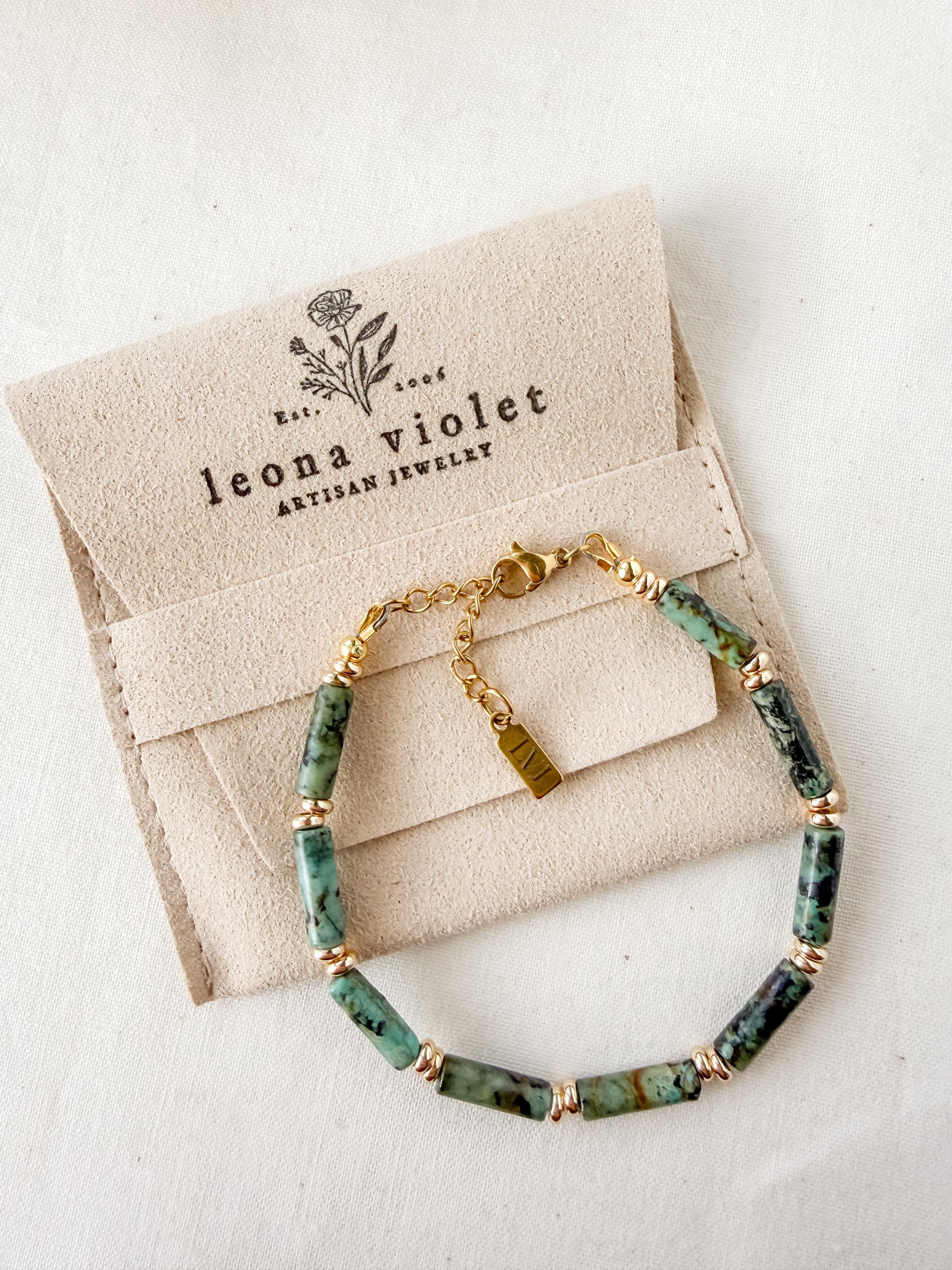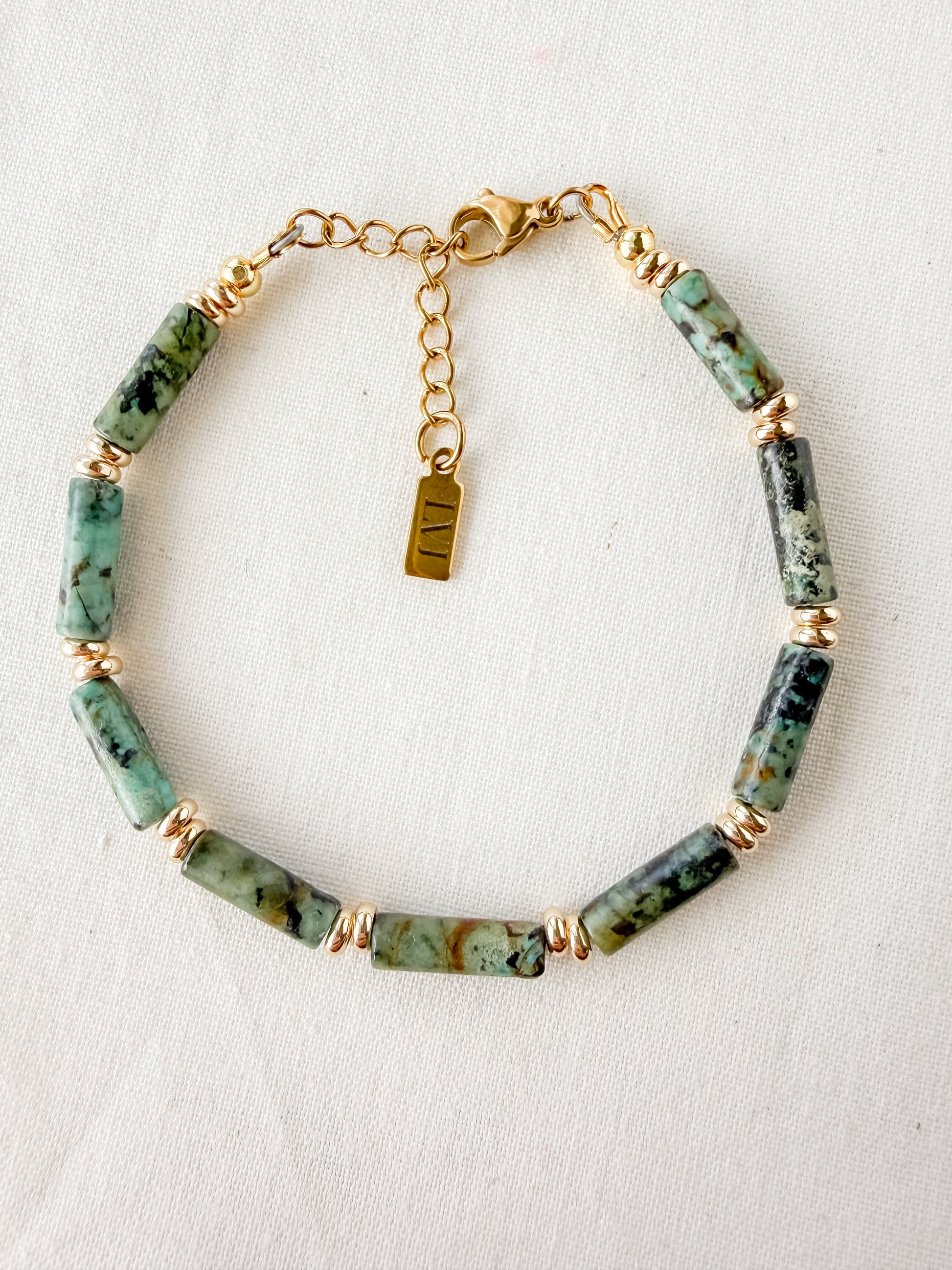 The Seraphina Bracelet is handcrafted with smooth African turquoise beads, showcasing a rich blend of muted teal, sage green, and earthy brown matrix. Each stone features natural variations in color and pattern, ensuring every bracelet is beautifully one of a kind.