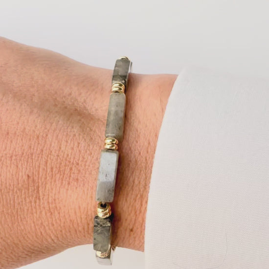 The Seraphina Bracelet is handcrafted with luminous spectrolite beads, known for their deep charcoal tones and flashes of iridescent blue, green, and silver. Each stone reveals its color differently in the light, making every bracelet uniquely striking.