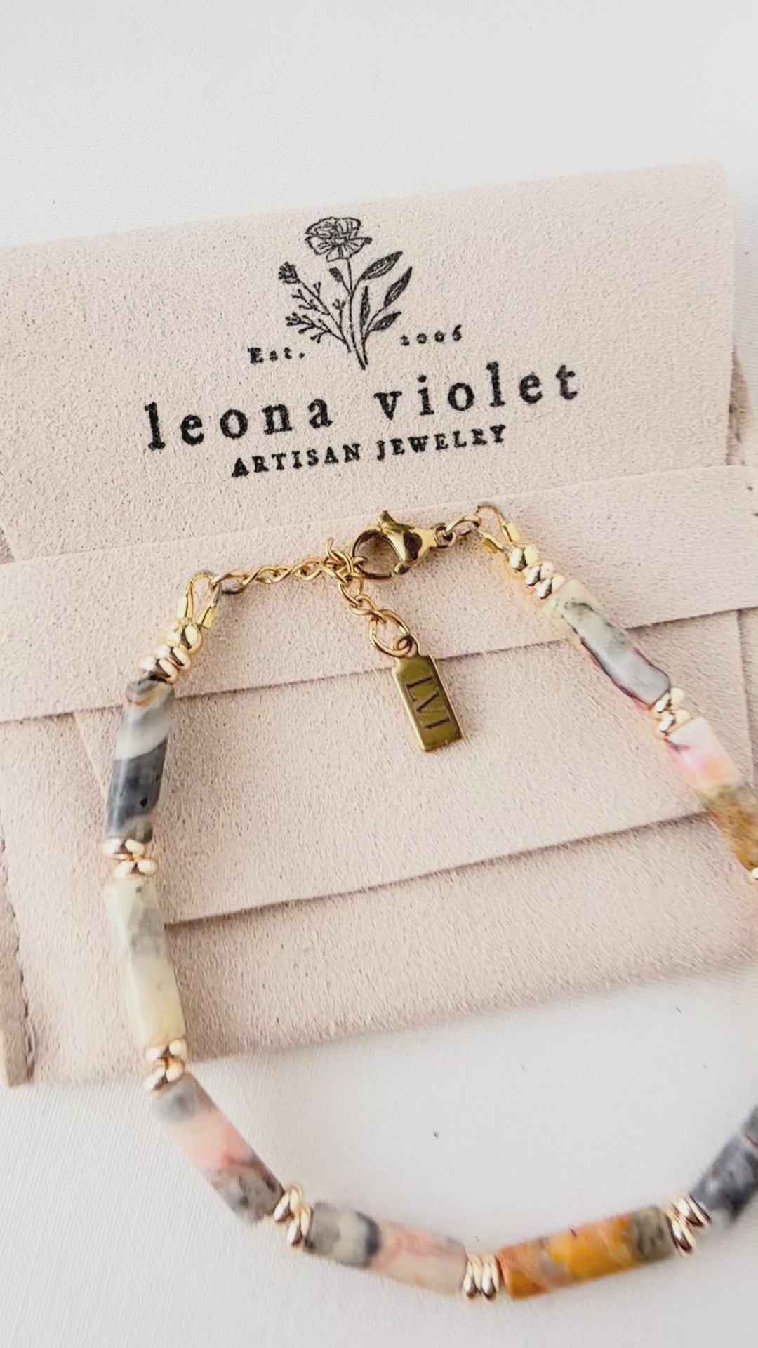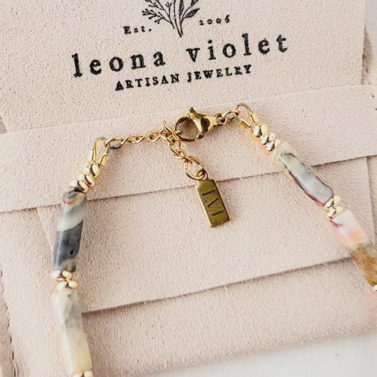 The Seraphina Bracelet is handcrafted with smooth crazy lace agate beads, each one alive with swirling patterns of warm neutrals, soft grays, creamy ivories, and sun-washed touches of amber and blush. No two stones are ever alike, making every bracelet a truly one-of-a-kind piece.