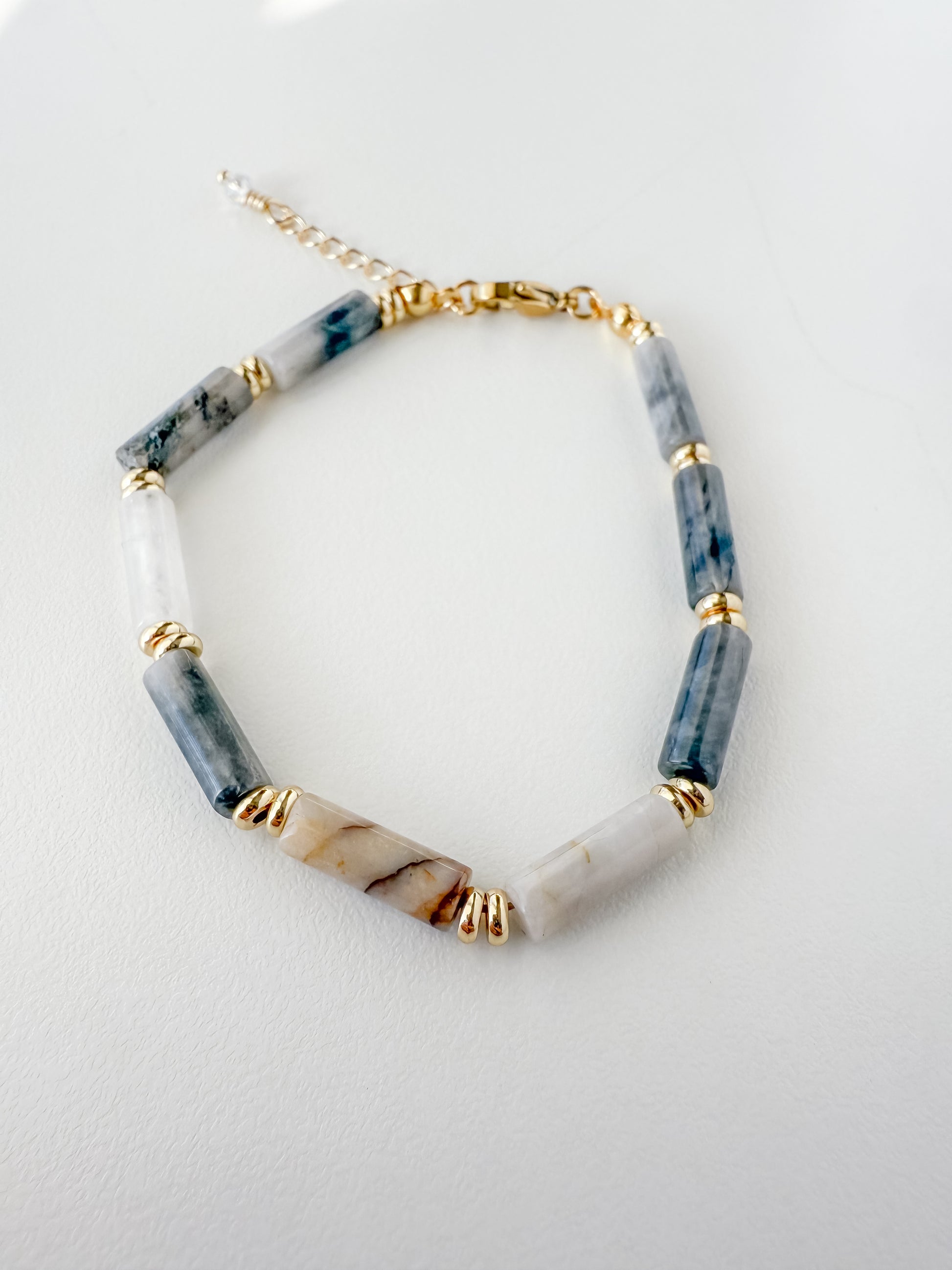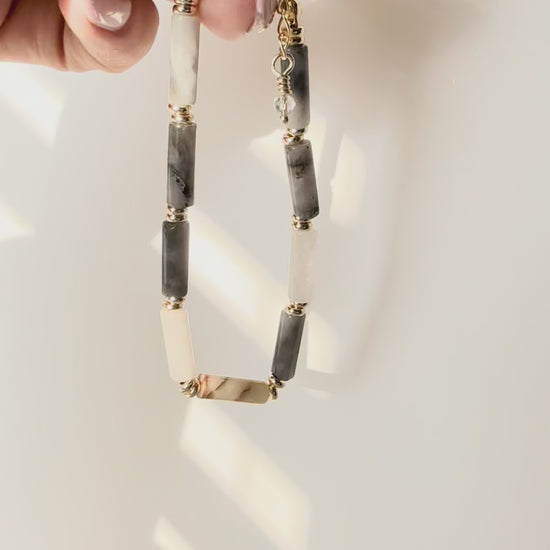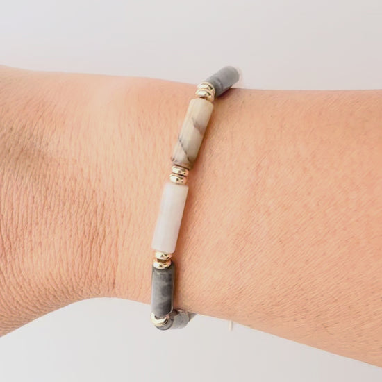 The Seraphina Bracelet is handcrafted with smooth eagle eye agate beads in soft gray and smoky white tones. Each stone features natural veining, making every bracelet beautifully one of a kind.