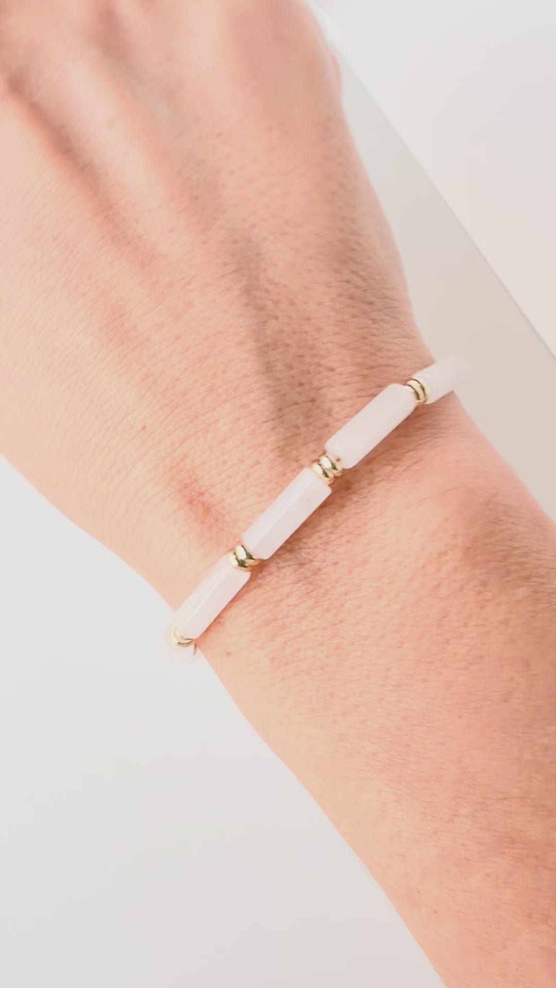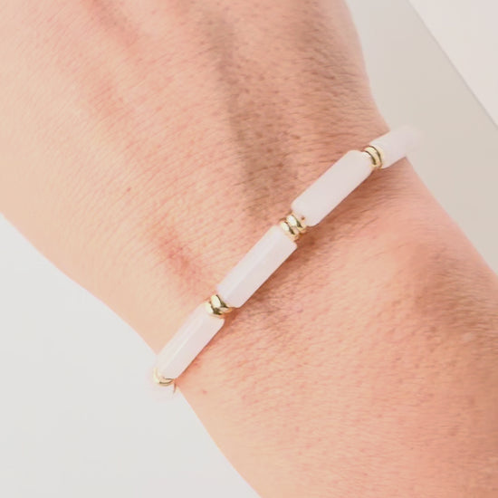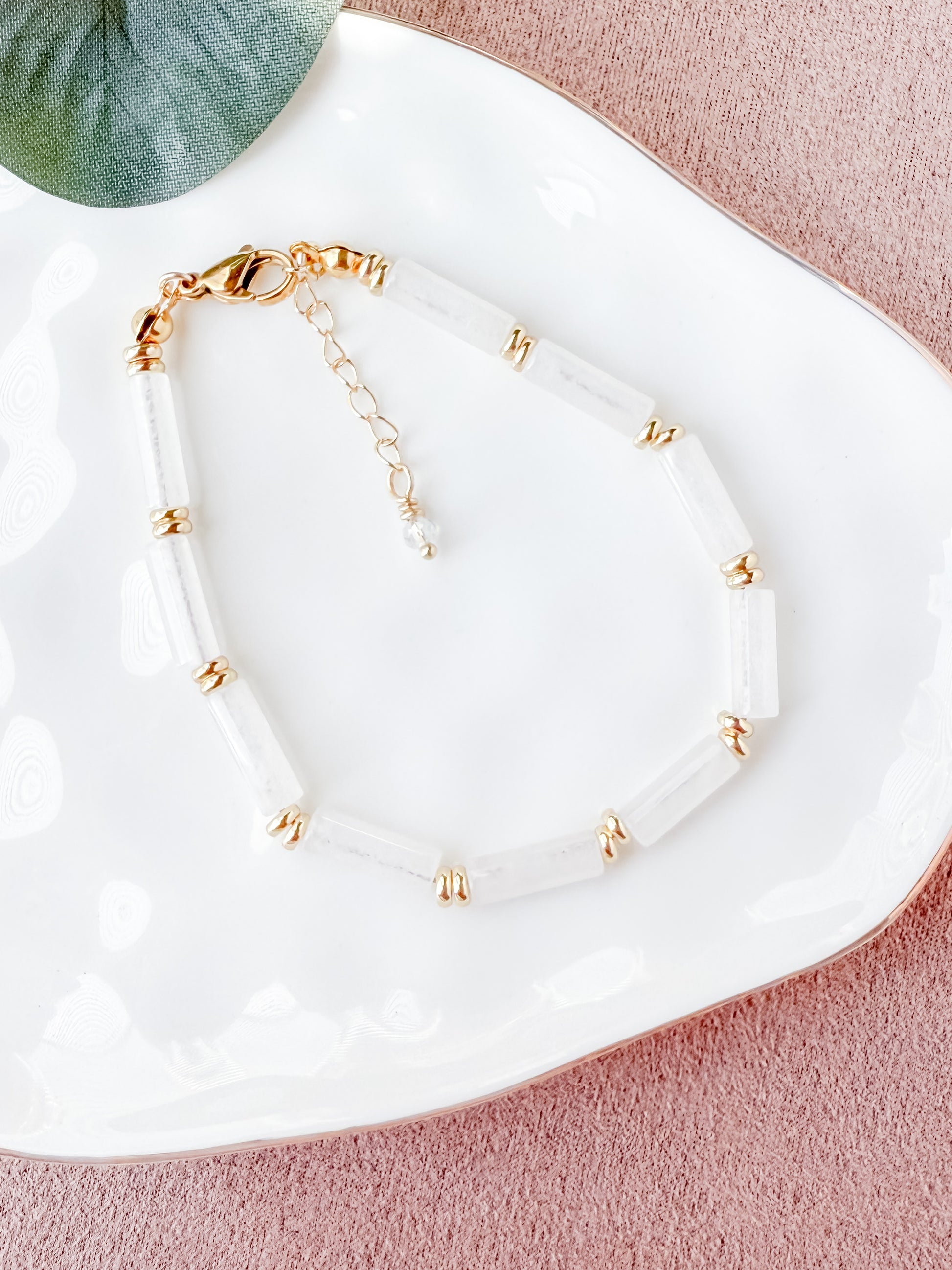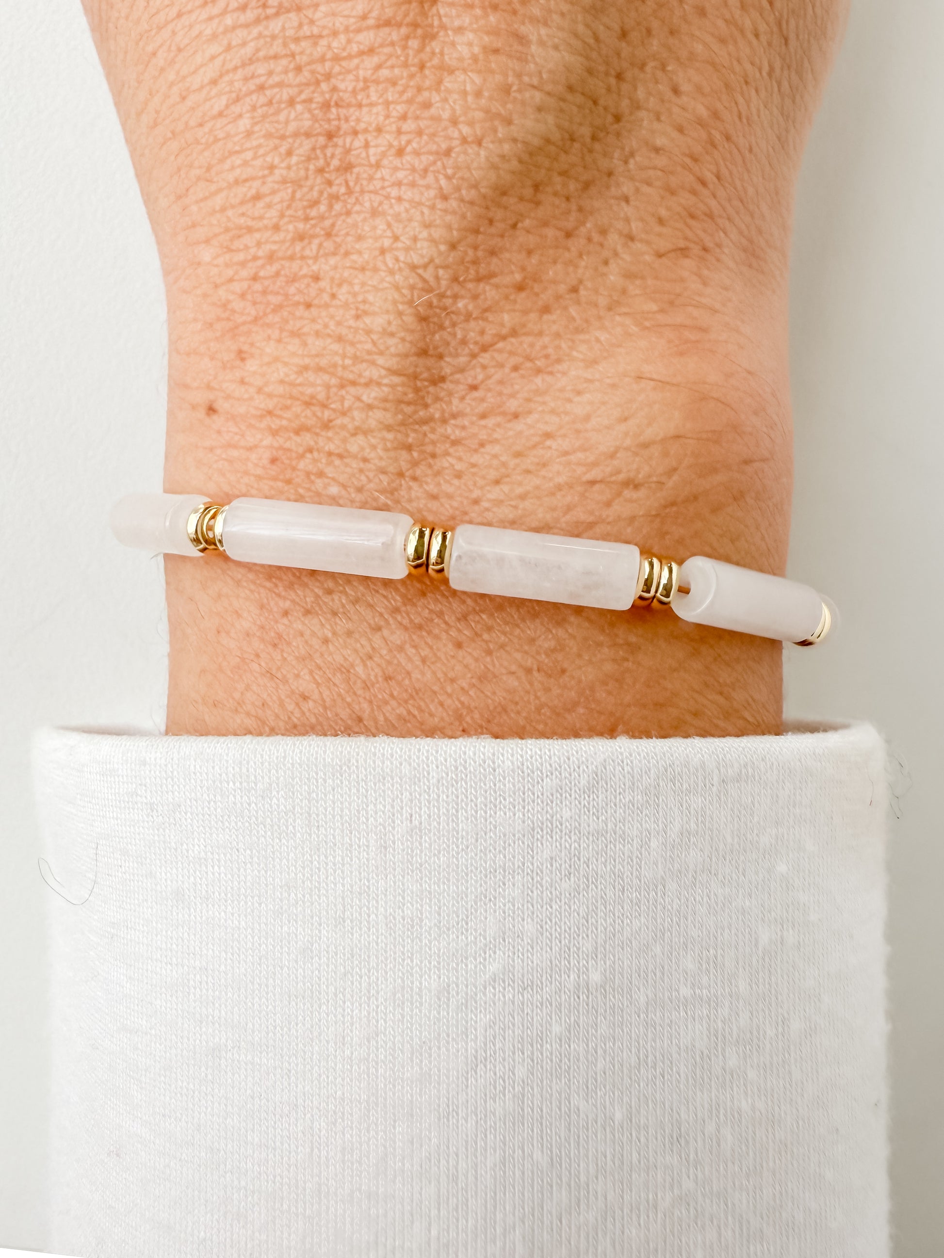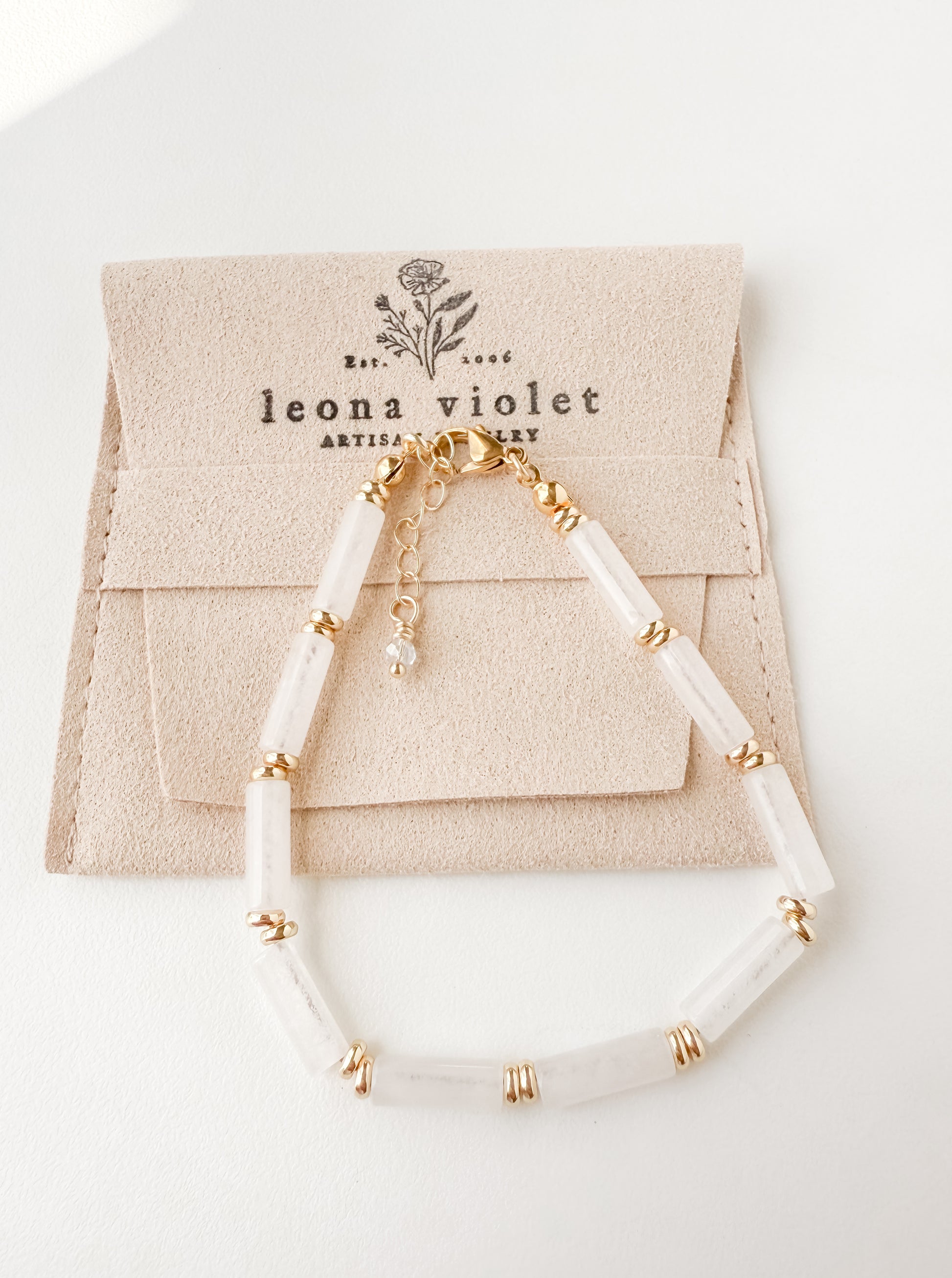 The Seraphina Bracelet is handcrafted with luminous white quartz beads, known for their soft, milky translucence and timeless, neutral beauty. Each stone carries subtle natural variations, making every bracelet uniquely elegant.