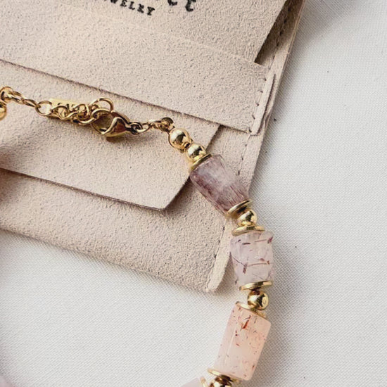 The Solstice Moon Bracelet is handcrafted with luminous red copper rutilated quartz beads—each one featuring natural copper-toned threads that create a warm, glowing effect, like sunlight caught in stone.