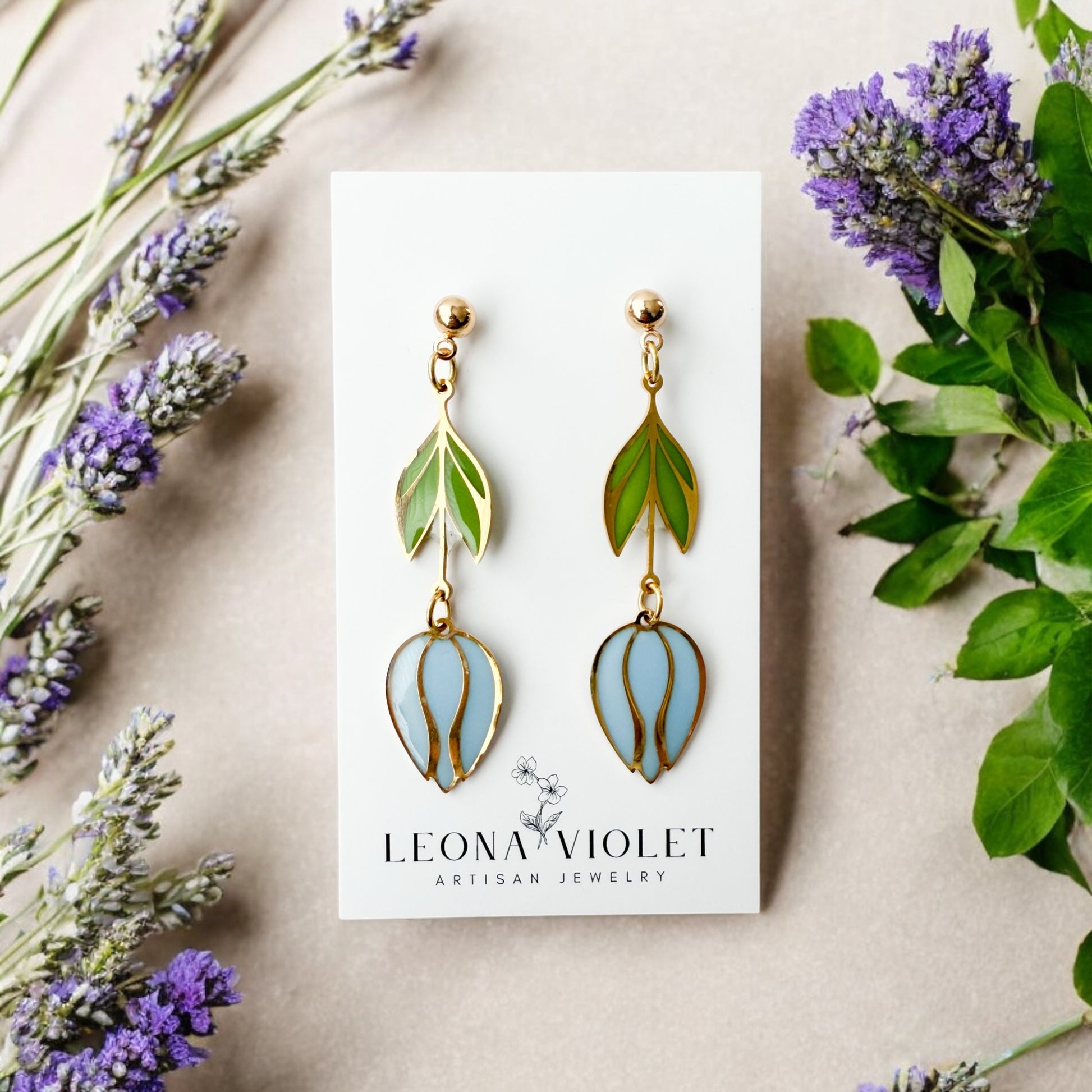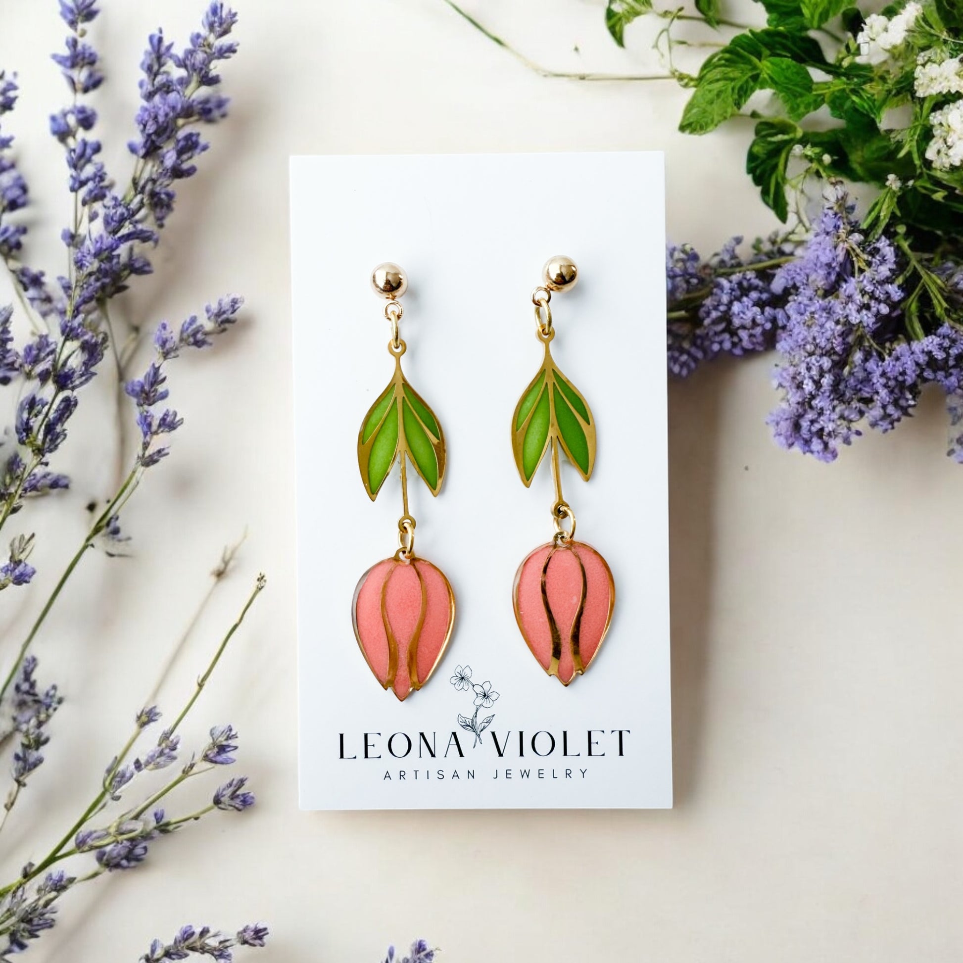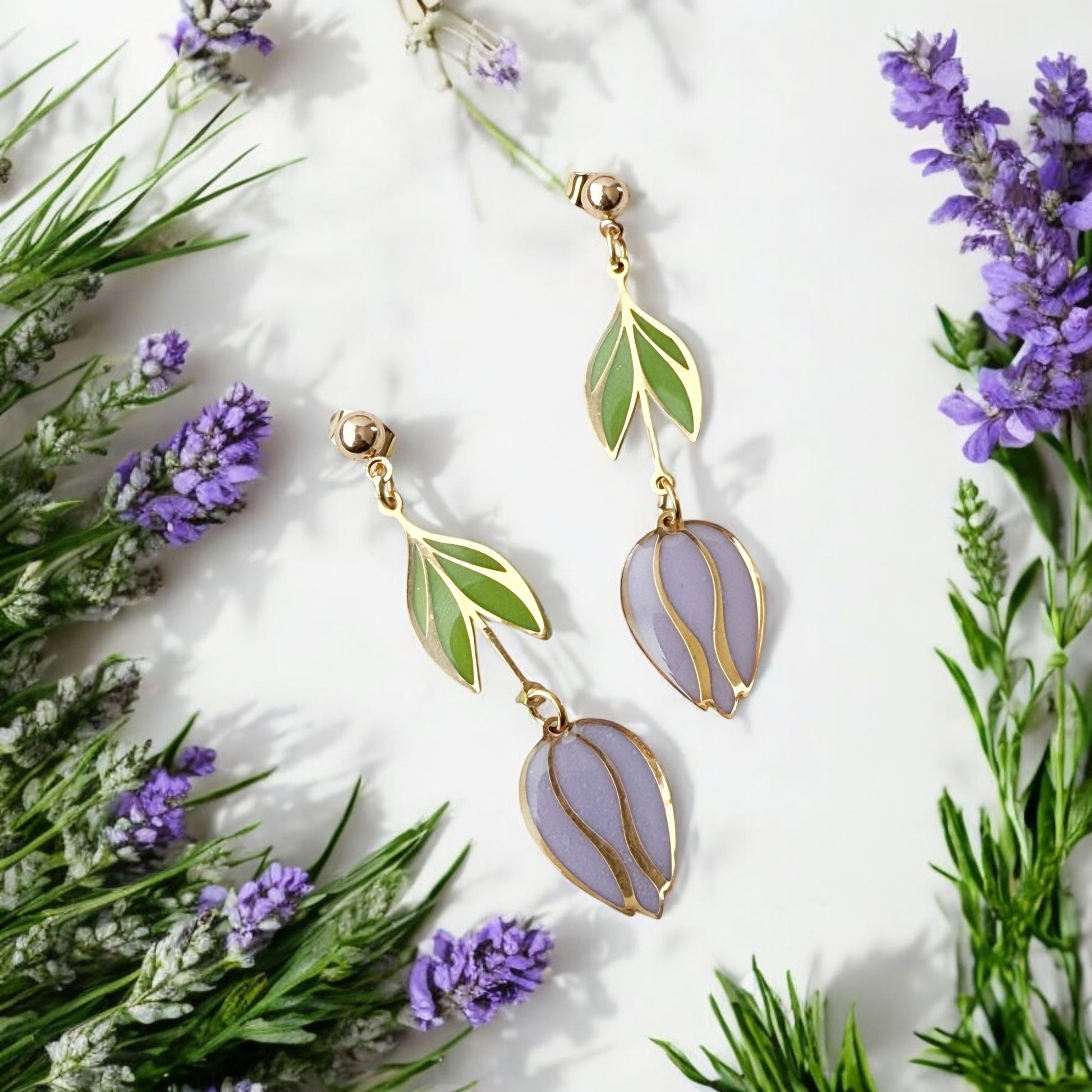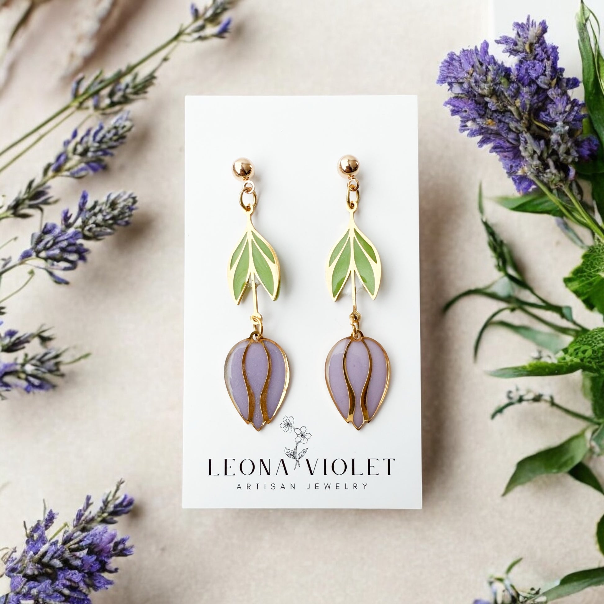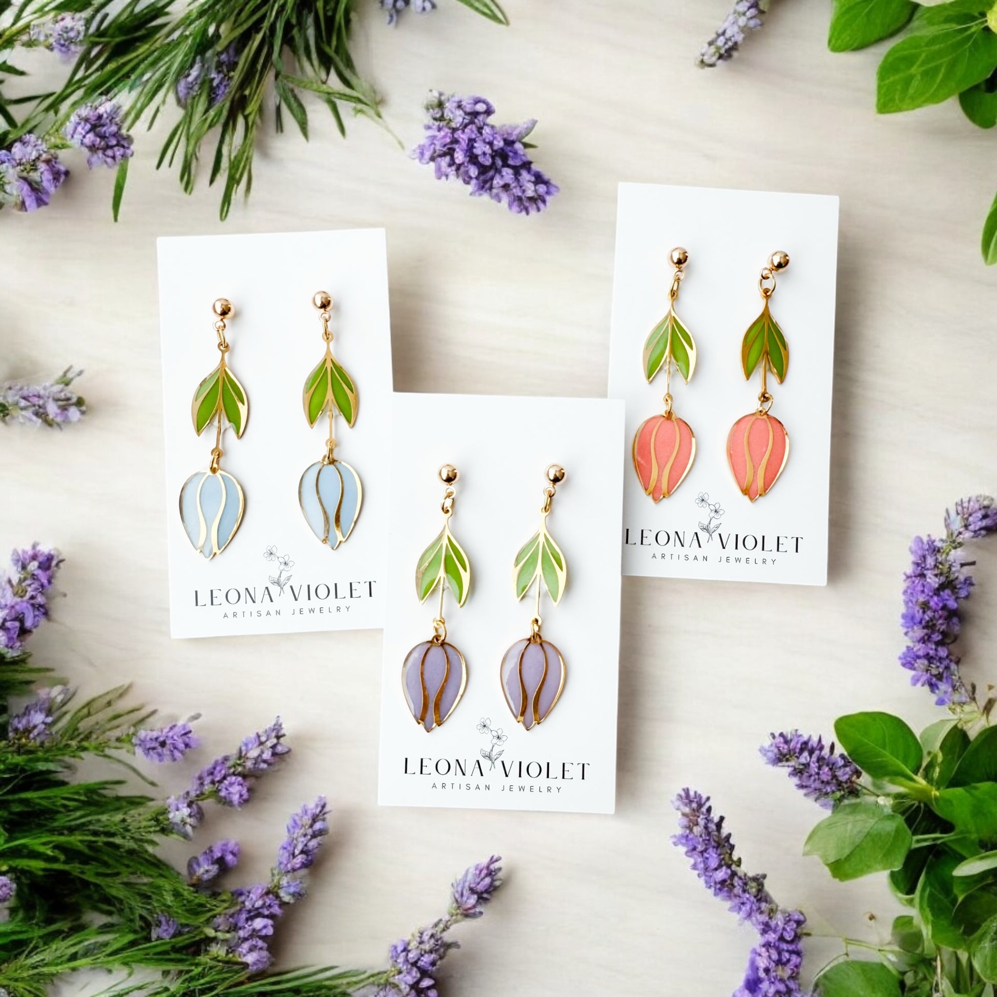 Add a touch of whimsy to your wardrobe with these colorful Stained Glass Tulip Earrings. Handpainted with resin, these gold-plated tulips create a stunning stained glass effect.