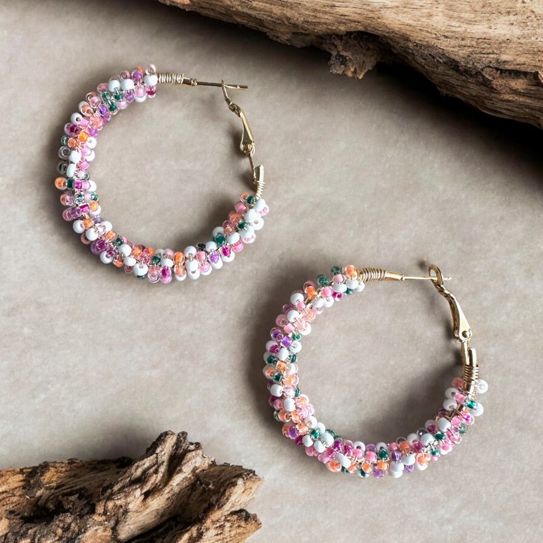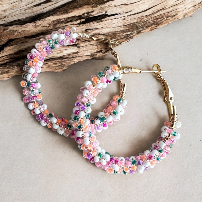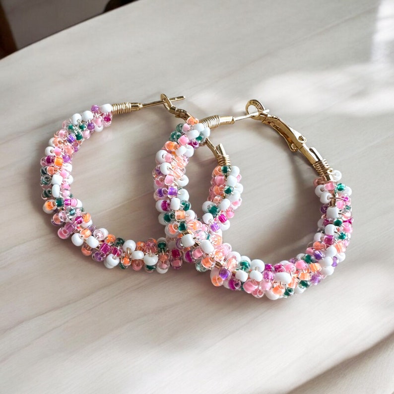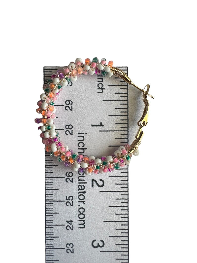These fun little beaded hoops were handmade using glass seed beads wire wrapped around a 1.5 inch gold plated hoop.