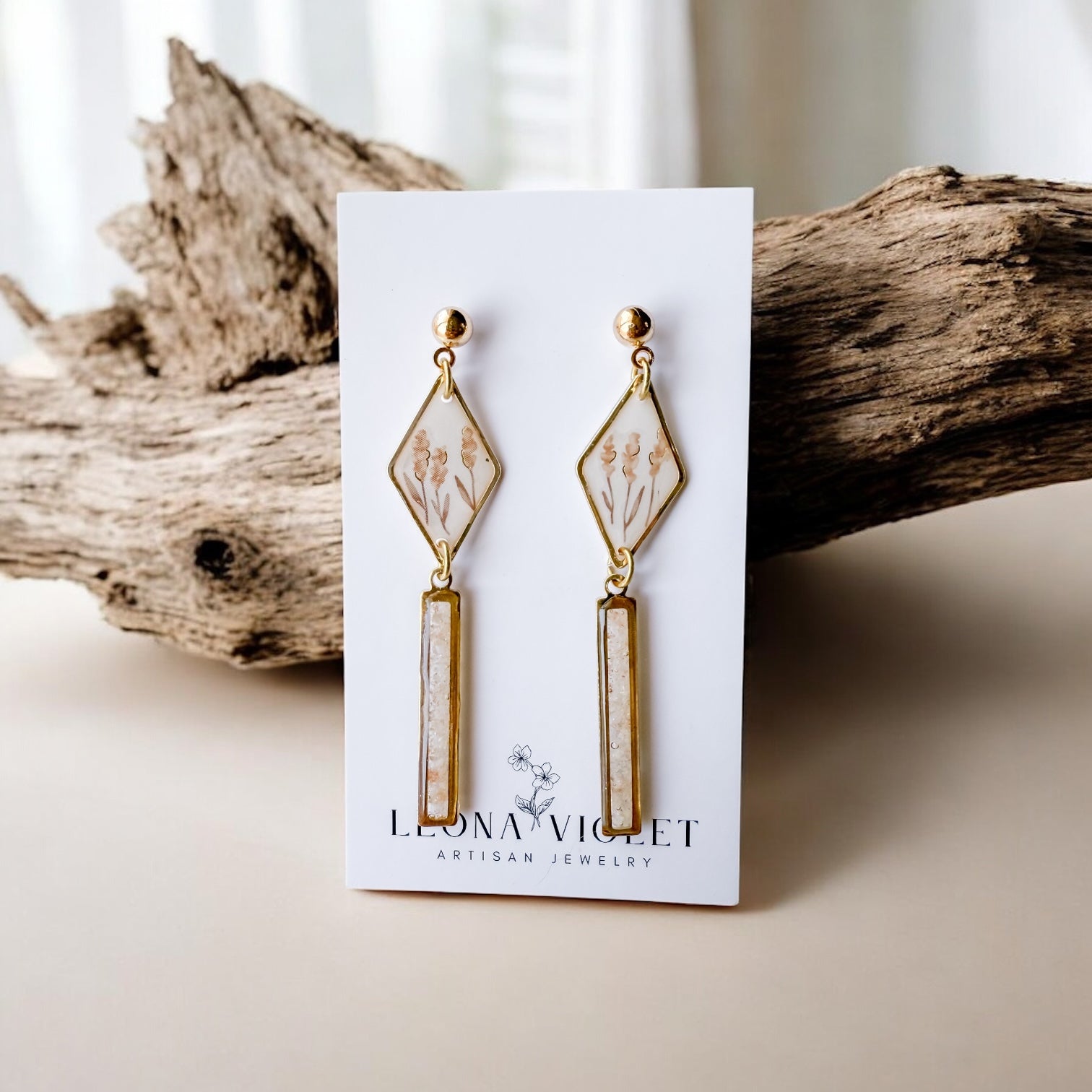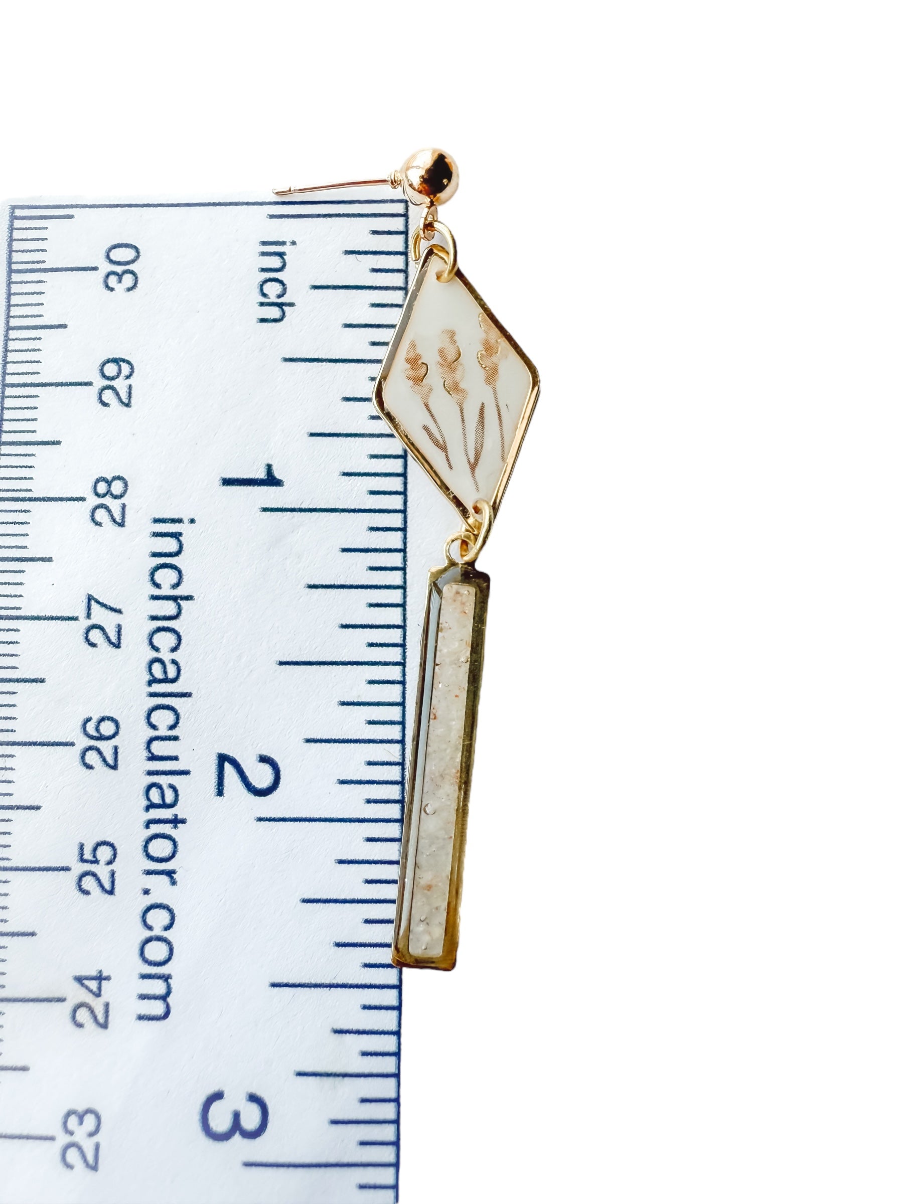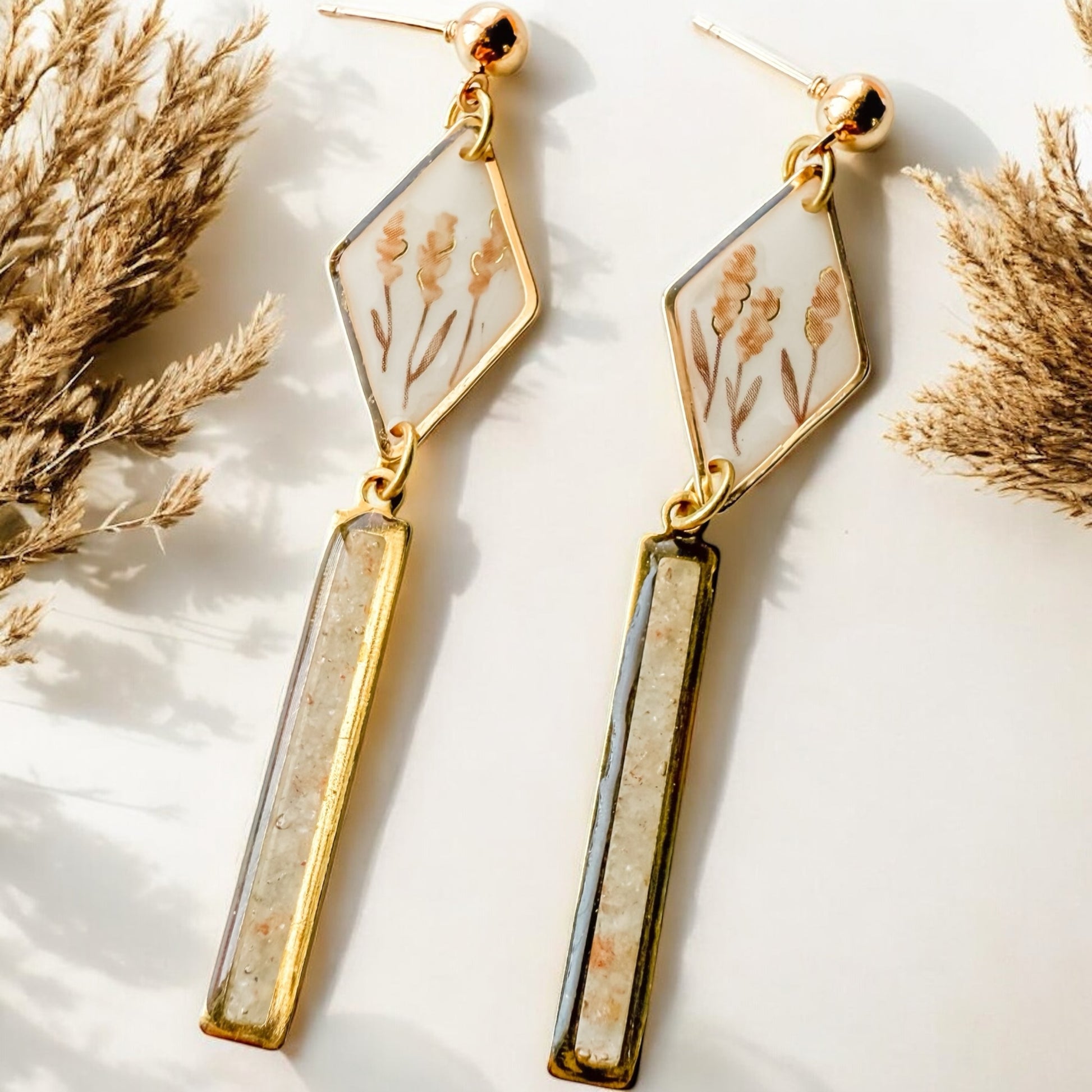 Delicate and radiant, our Sunstone Meadow Earrings feature flower images encased in crystal-clear resin, framed in a sleek diamond-shaped gold plated setting. Below, a slender bar of crushed genuine sunstone shimmers with natural warmth, adding earthy elegance to every movement. Lightweight and full of charm, these earrings bring a touch of nature’s beauty to your everyday style or special occasion.