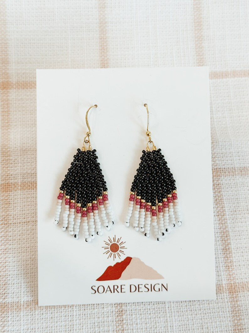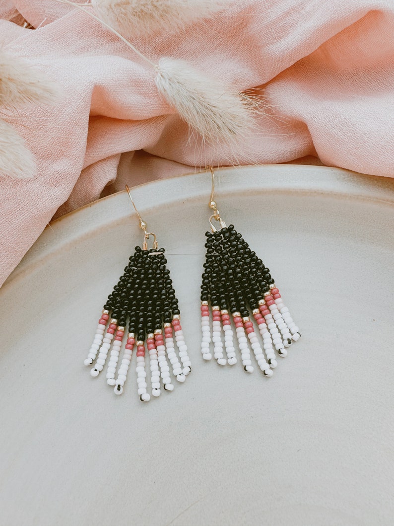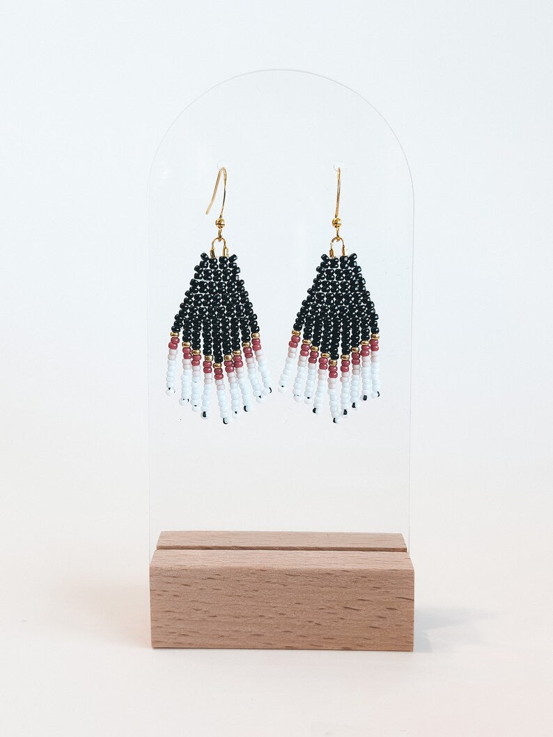 Just a hint of fringe in a perfectly discreet Valentine’s Day color palette. Handmade with Miyuki glass seed beads, woven into an original tiny fringe design. This color way features white, black, gold and raspberry pink beads. These earrings measure approximately 1.5 inches long and 0.75 inch wide. Available on gold plated ear hooks, or upgrade to14k gold filled ear hooks here.