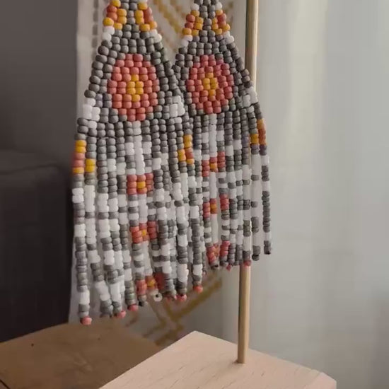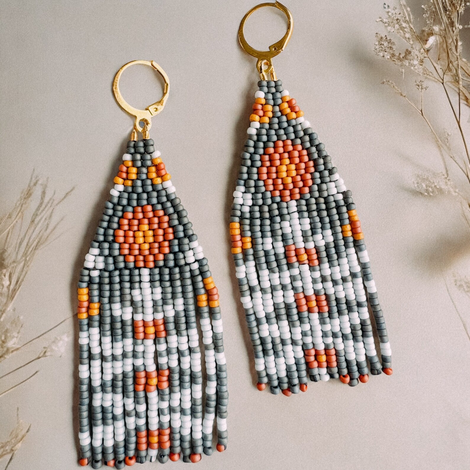 Add a touch of boho elegance and charm to any outfit with these handcrafted beaded earrings. Meticulously designed to catch the eye, these earrings feature a fall inspired color palette and a modern floral pattern. Each bead is hand-selected and carefully woven to create a piece of wearable art.