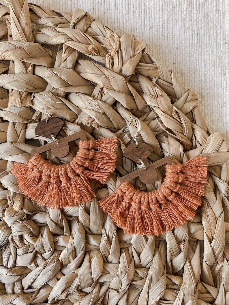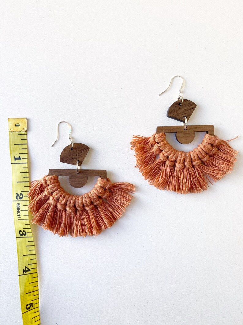Beautiful macrame tassel earrings featuring a semi circle wood finding and macrame cotton cord in terra cotta.