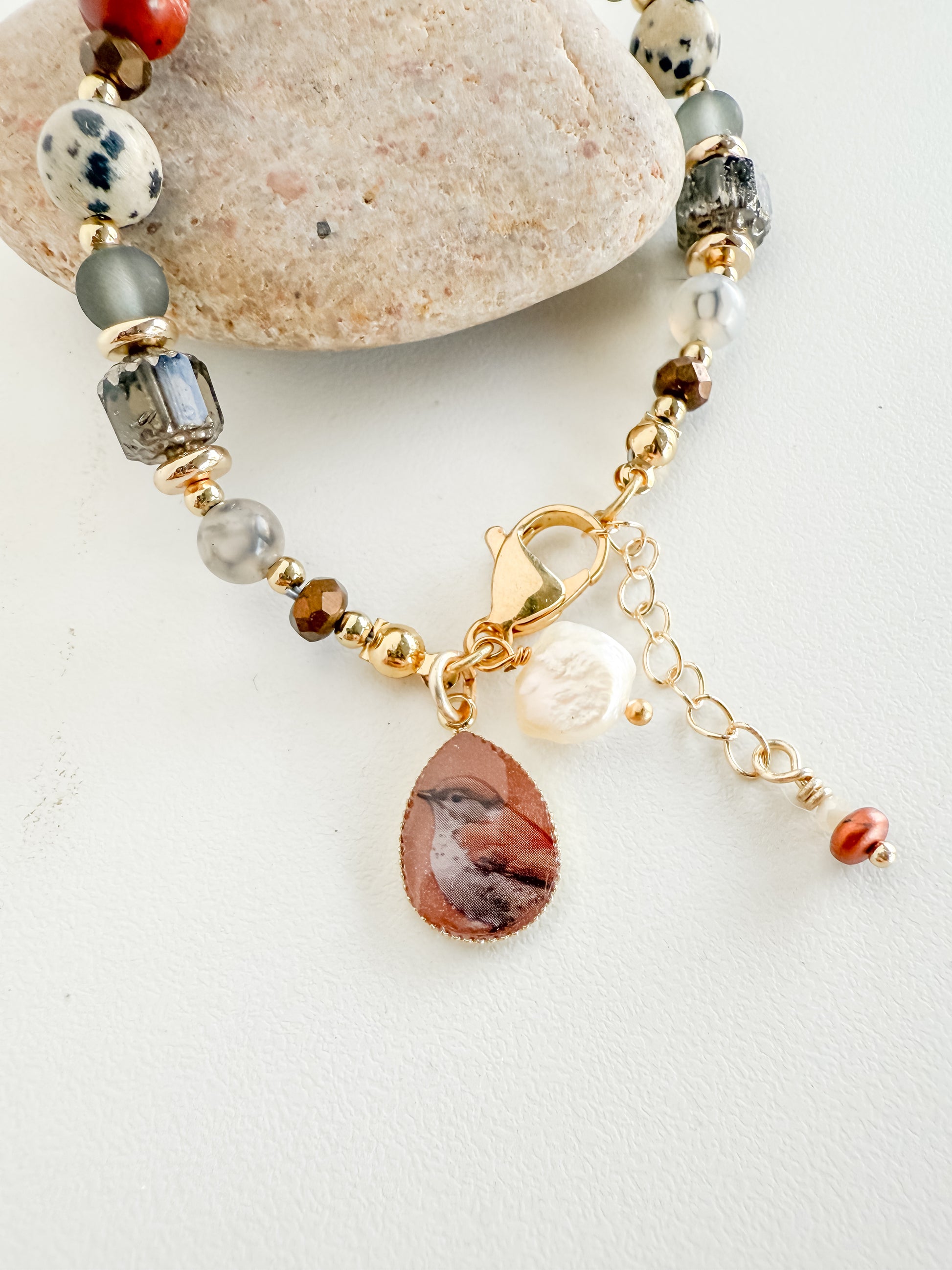 The Elara Bracelet is an earthy design inspired by warmth, texture, and natural beauty. A harmonious mix of carnelian, Dalmatian jasper, quartz, freshwater pearl, and Czech glass beads creates a rich palette of sun-washed reds, soft neutrals, and muted greens.