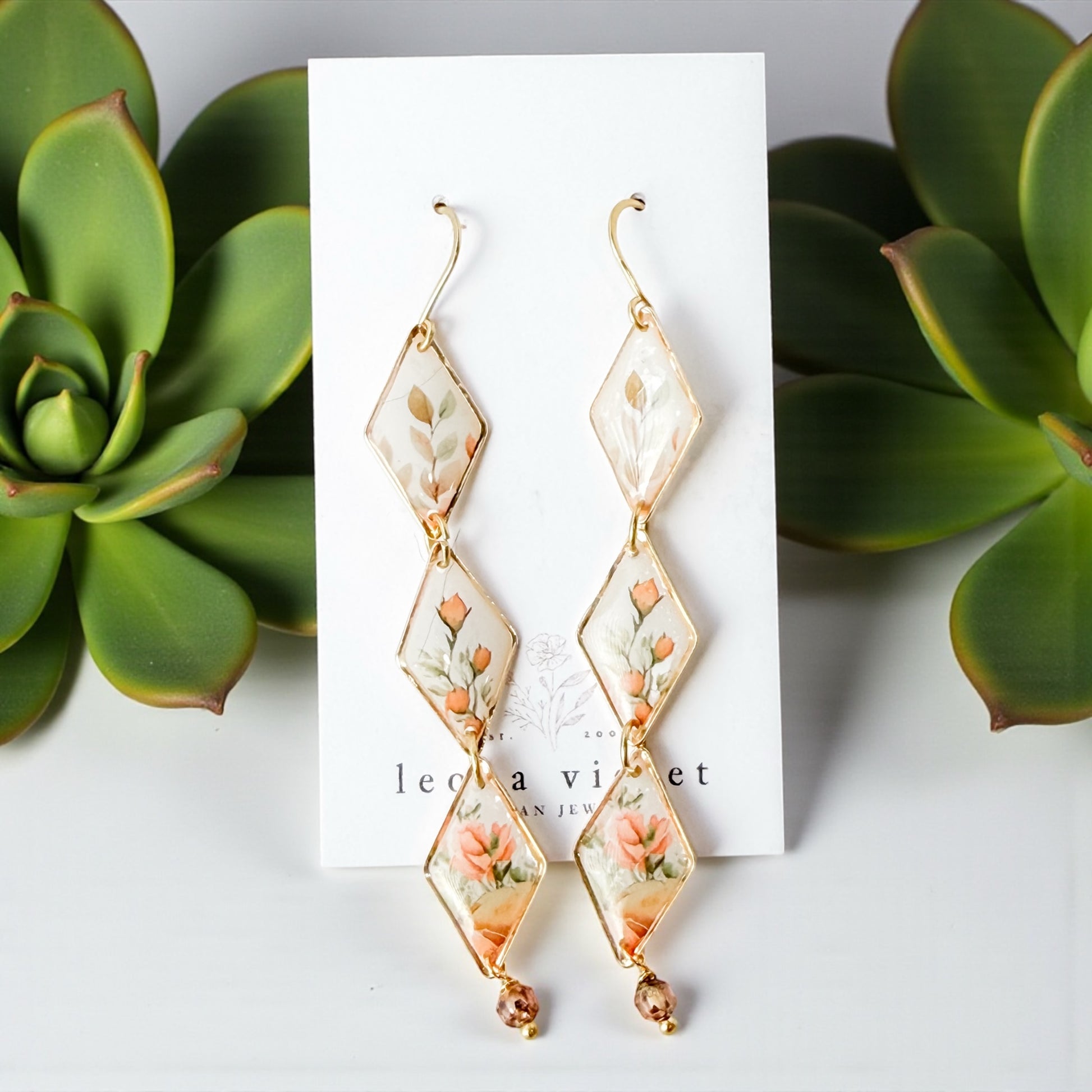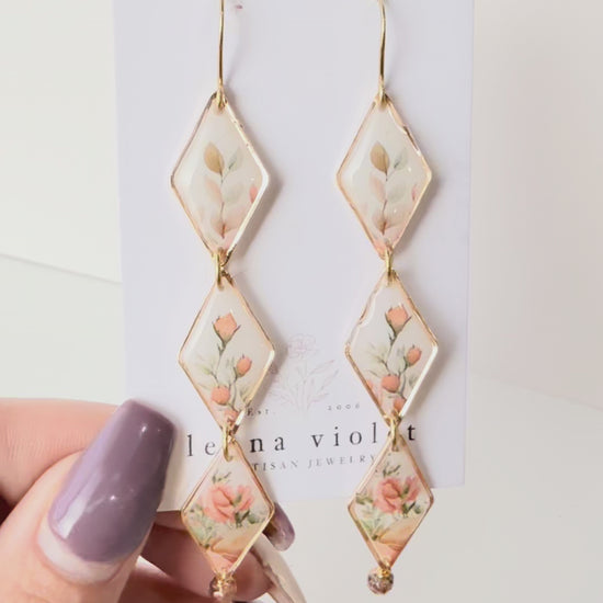 Let your style bloom with the Wild Rose Drift Earrings — a graceful ode to soft femininity and nature’s quiet poetry. Each earring features three hand-linked diamond panels adorned with a delicate watercolor floral motif, framed in golden trim and finished with a glimmering blush crystal drop. Their gentle hues of peach, cream, and sage evoke a drifting meadow breeze and the warmth of early morning light.