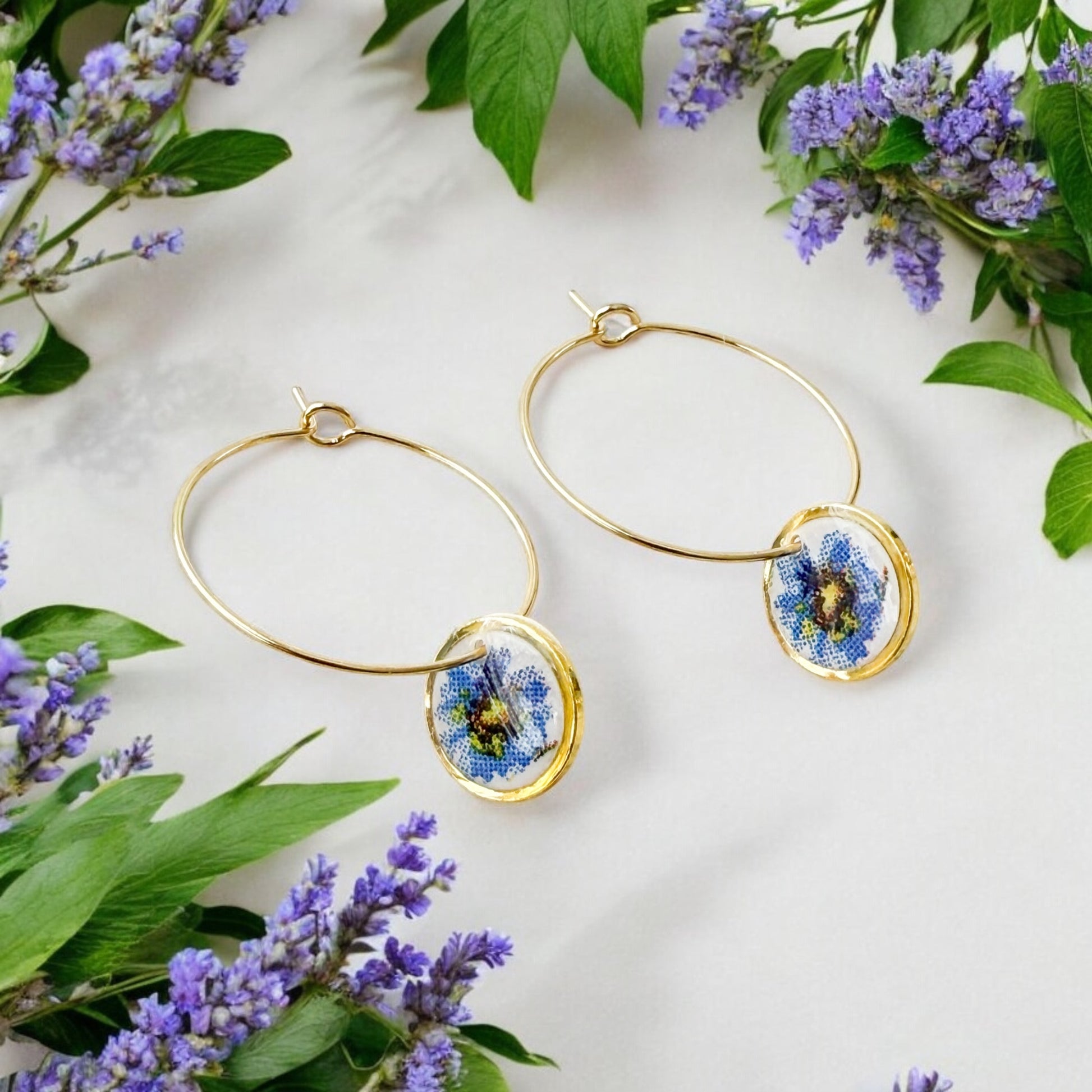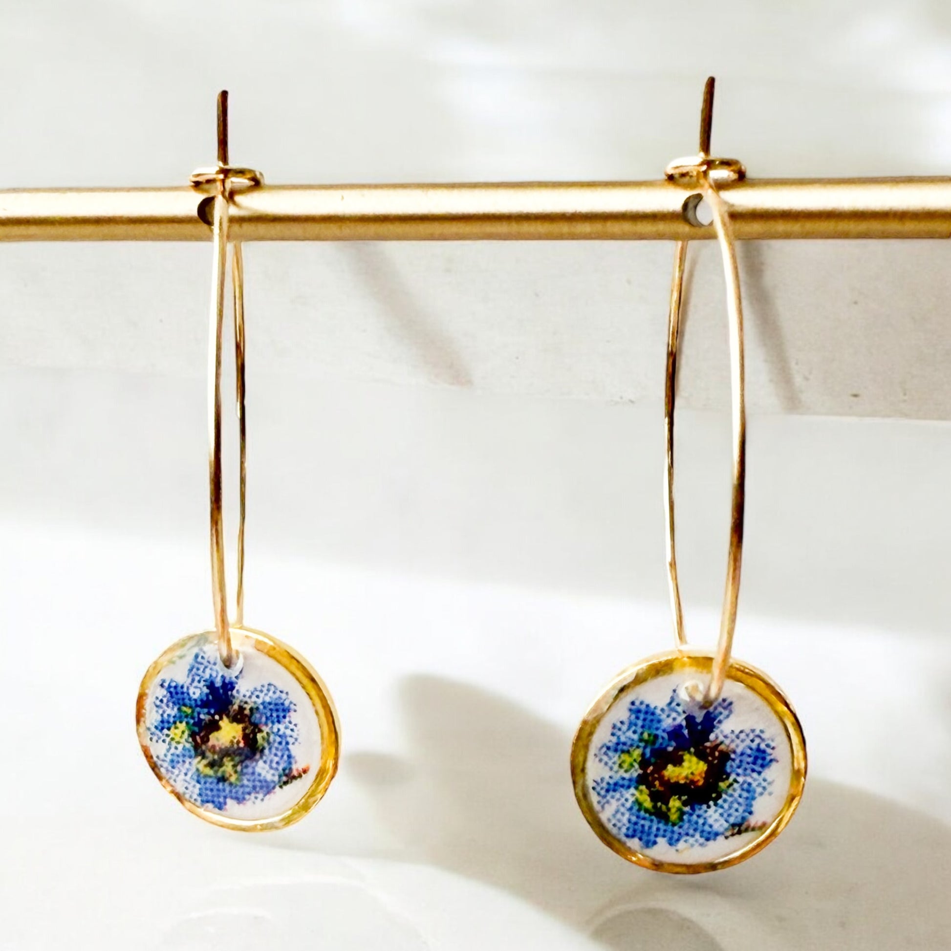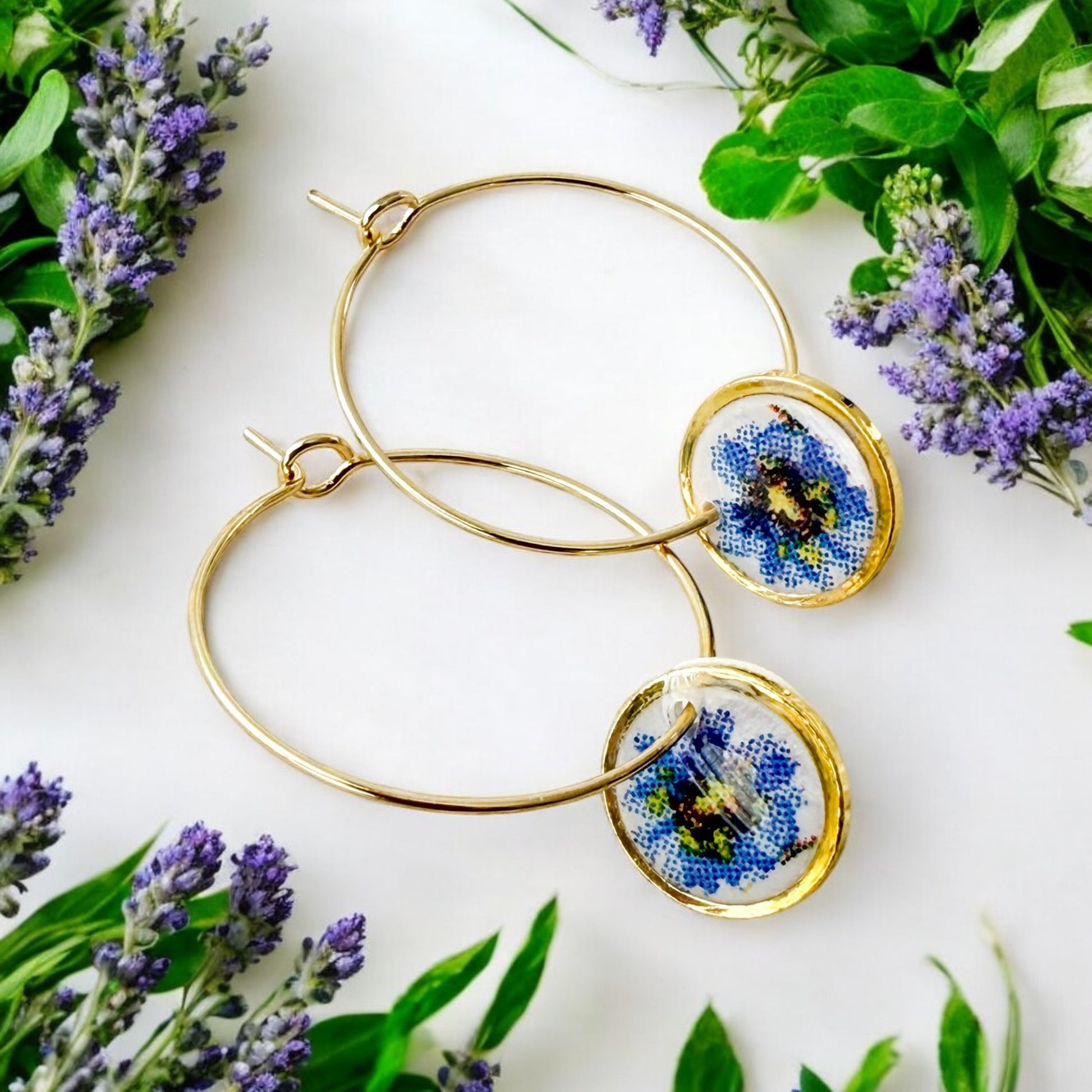 Elevate your style with our Wisteria Bloom Hoops. These handcrafted, gold plated hoops feature handmade resin charms adorned with delicate floral blooms. With a one inch diameter, these hoops add a touch of elegance and sophistication to any outfit.